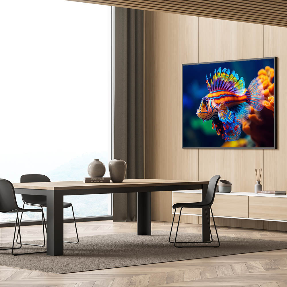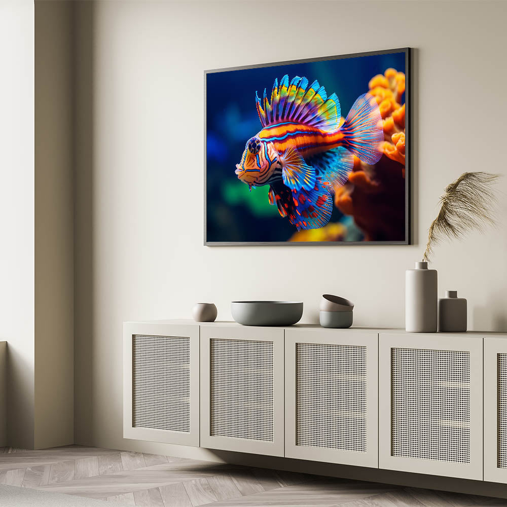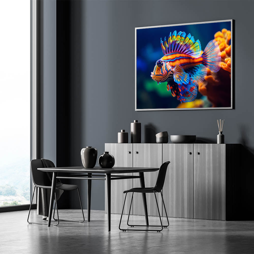 Bring a splash of vibrant color into your home with this stunning Animal Wall Art featuring a close-up of a brilliantly colored fish. This Nature Close-Up Art design captures the vivid details of the fish's striking scales and flowing fins, set against a contrasting aquatic backdrop. The radiant hues of blue, orange, purple, and teal give this Wildlife Photography Print an energetic and dynamic feel.