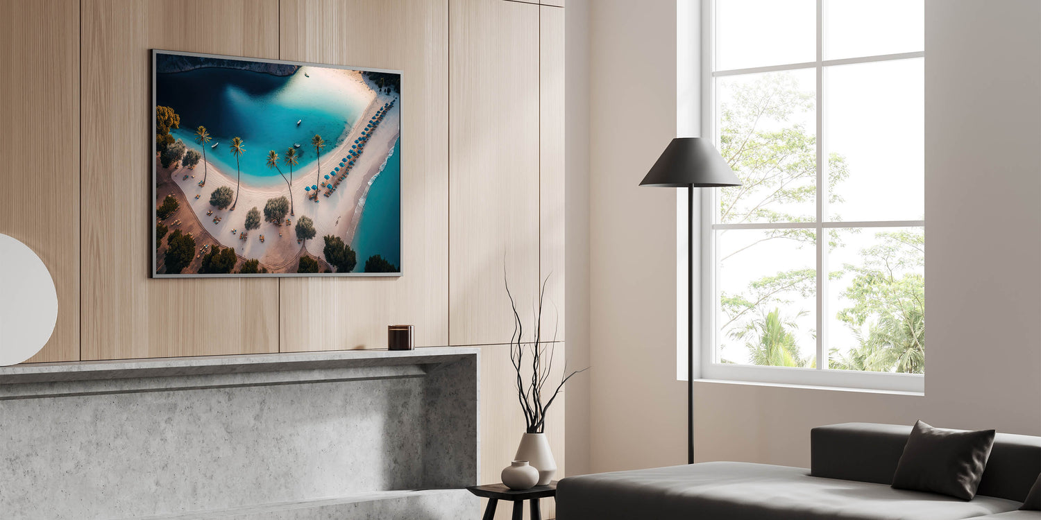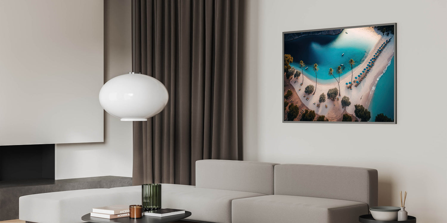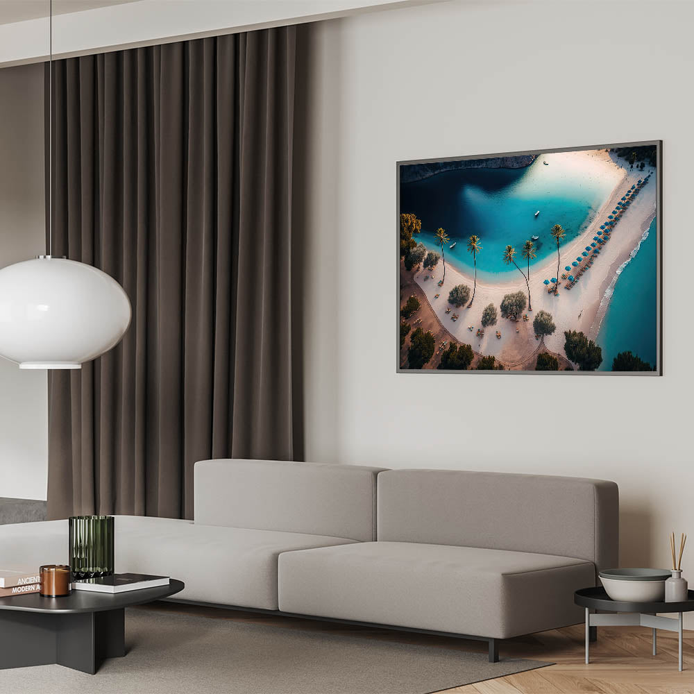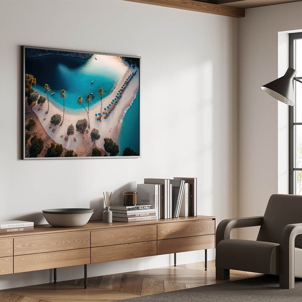 - High-quality print highlighting the vibrant blues and serene beach layout, perfect for coastal-themed interiors.