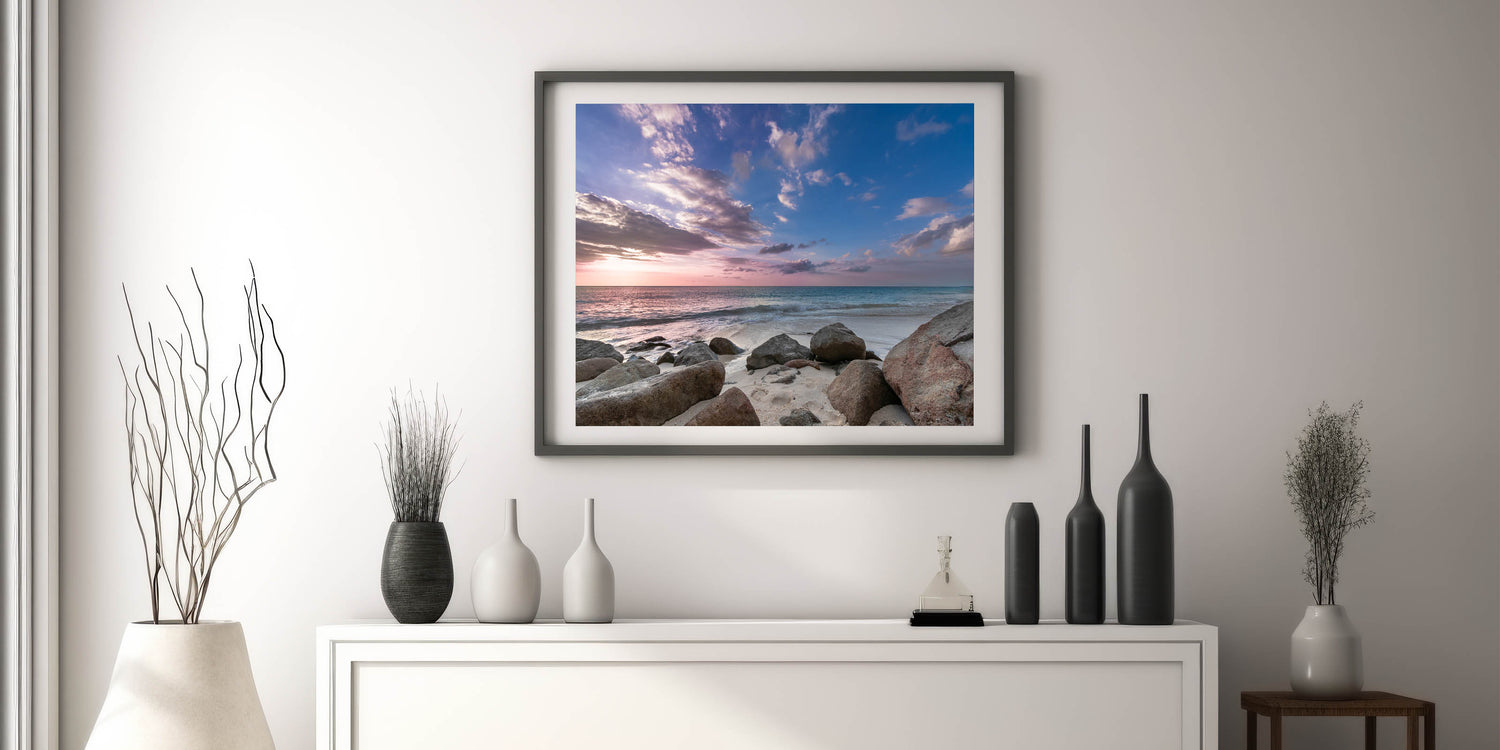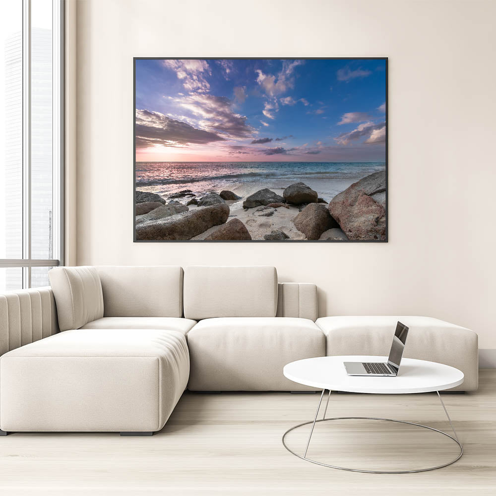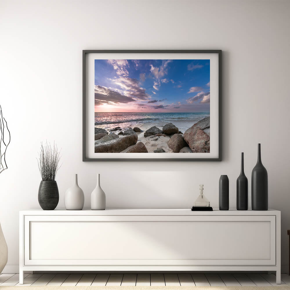 - High-quality print showcasing the beautiful blend of sky colors and the serene, rocky beach setting.