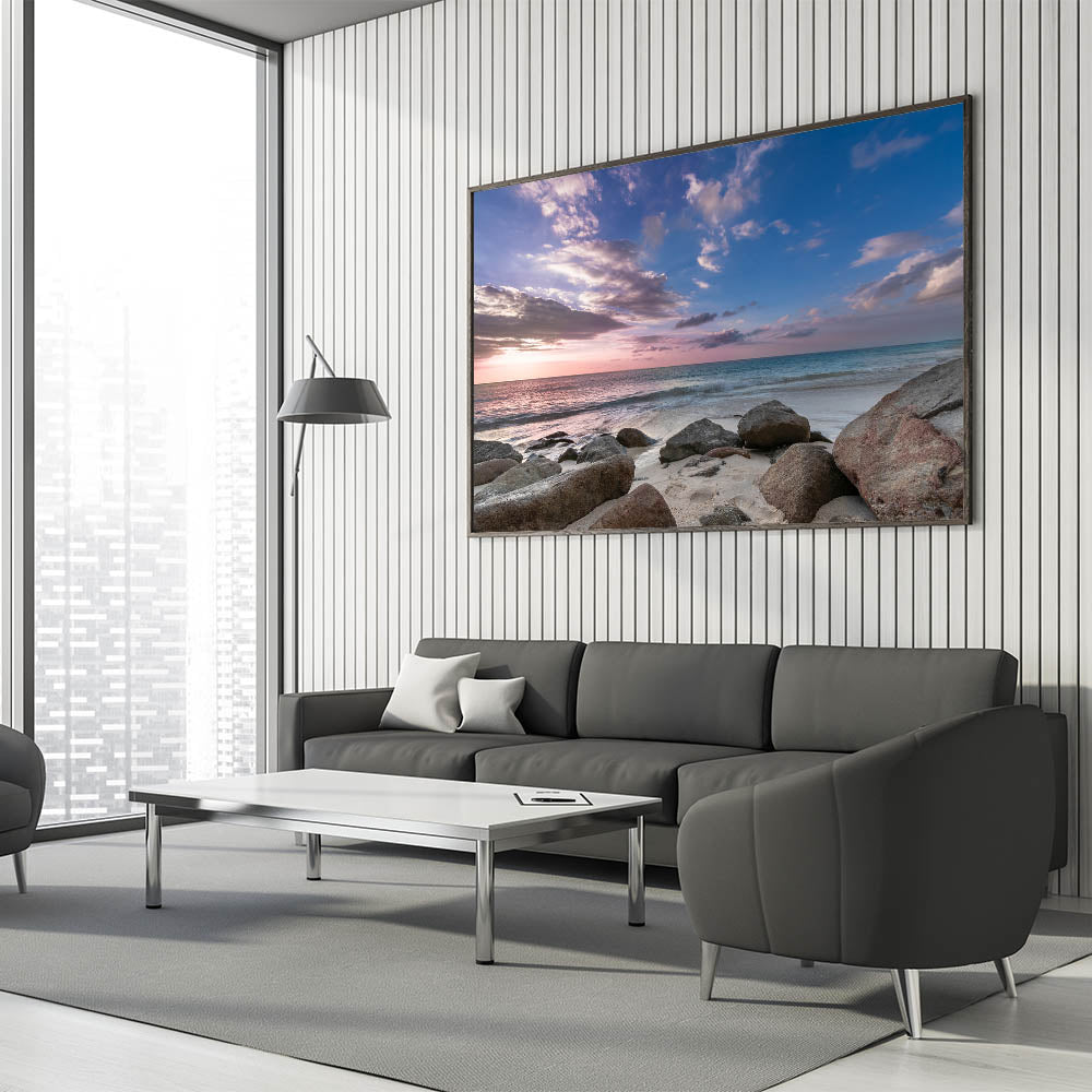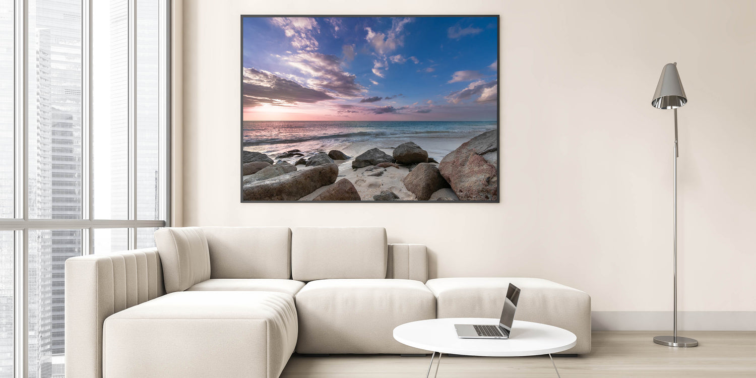 This serene depiction of Antigua’s rocky shores at dusk is perfect for those looking to bring a touch of coastal serenity into their home. Its calming colors and natural textures will enhance any room's decor.