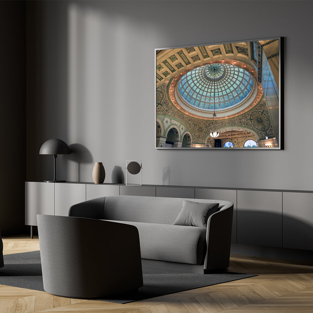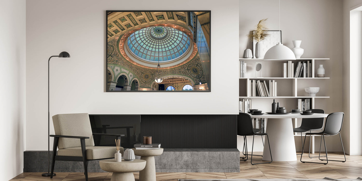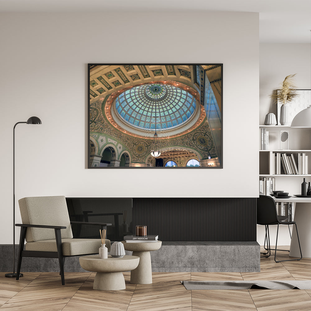 Bring a touch of classic architectural elegance to your space with this stunning domes wall art. Featuring a meticulously detailed dome ceiling adorned with intricate patterns and vibrant colors, this artwork captures the essence of historic architectural beauty. The image showcases a beautifully crafted dome with a mix of green, blue, and gold tones, making it a perfect piece for those who appreciate timeless design and architectural grandeur.