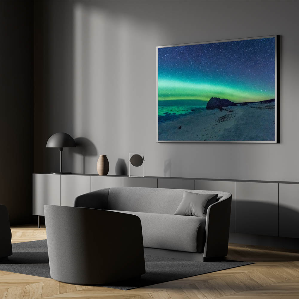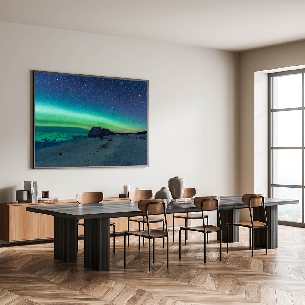 Enhance your decor with this captivating artwork that showcases the beauty of Canada's natural phenomena. Whether for yourself or as a gift, this aurora borealis print is sure to bring a sense of awe to any space.