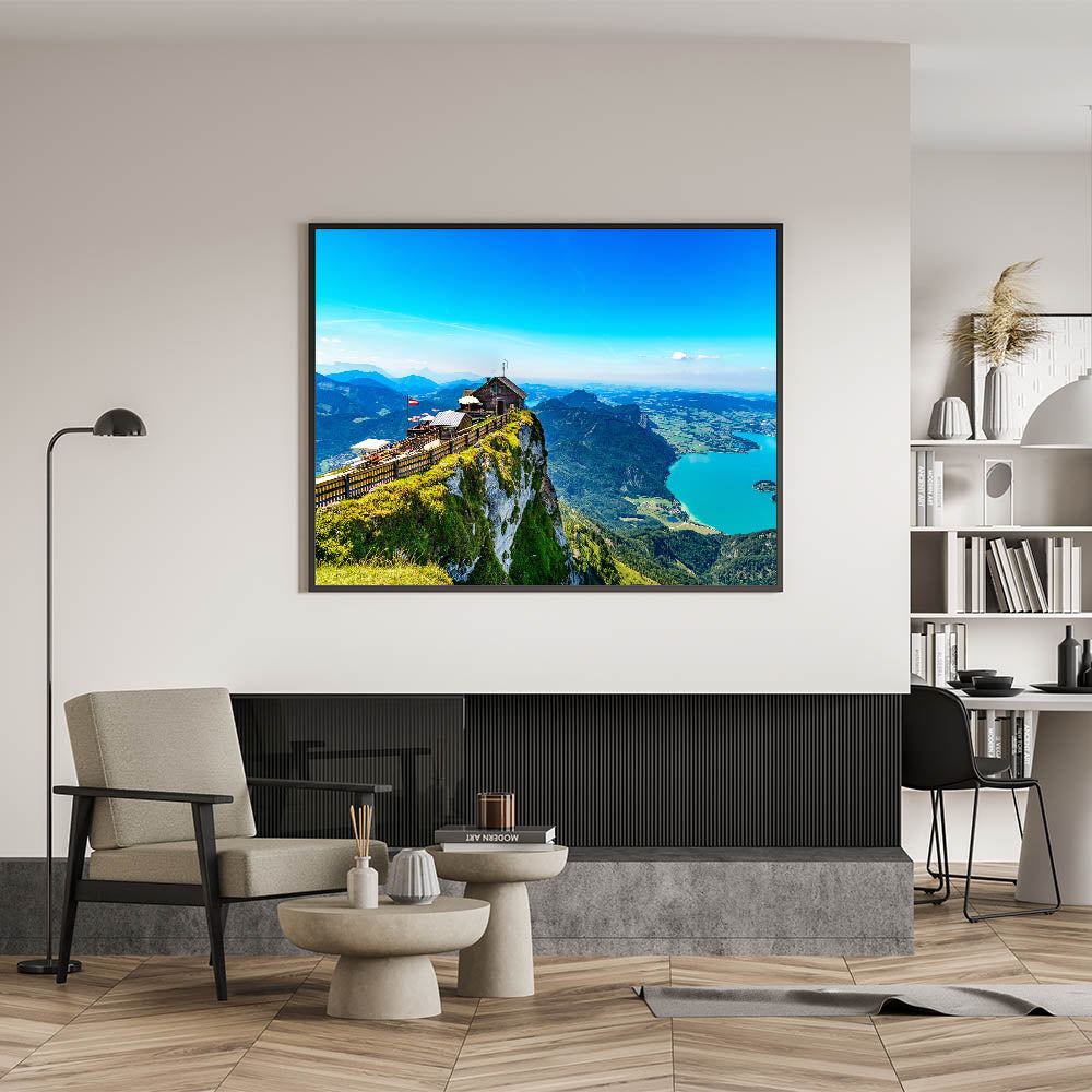 Bring the beauty of the Austrian Alps into your home with this breathtaking wall art featuring an extraordinary view of mountains, serene waters, and rustic architecture perched atop a cliff. This piece captures the peaceful yet majestic essence of Austrian nature landscapes, perfect for enhancing any room with a touch of European charm.