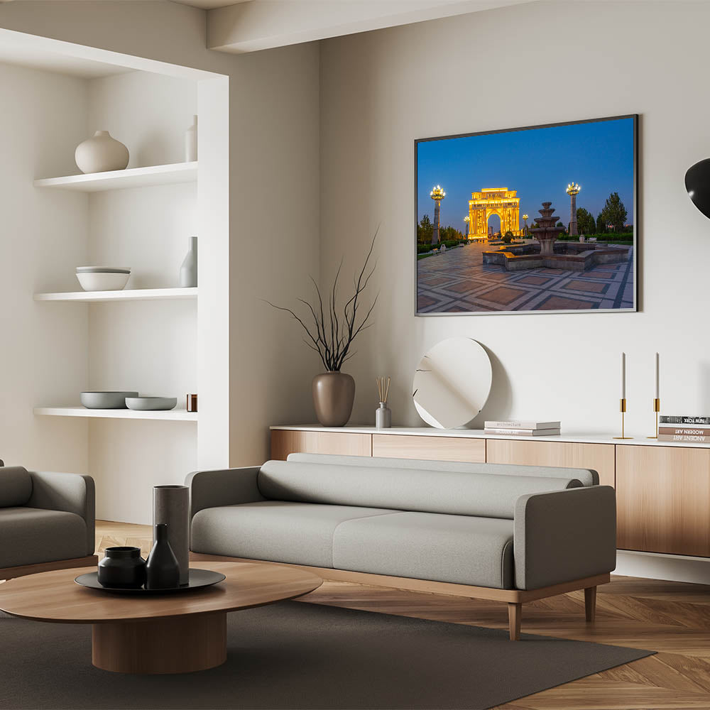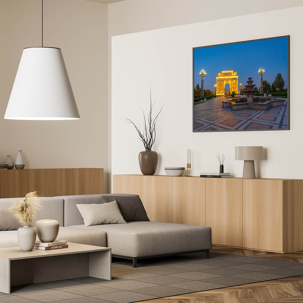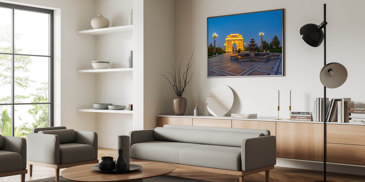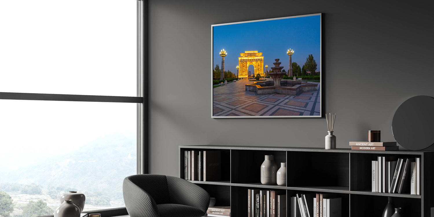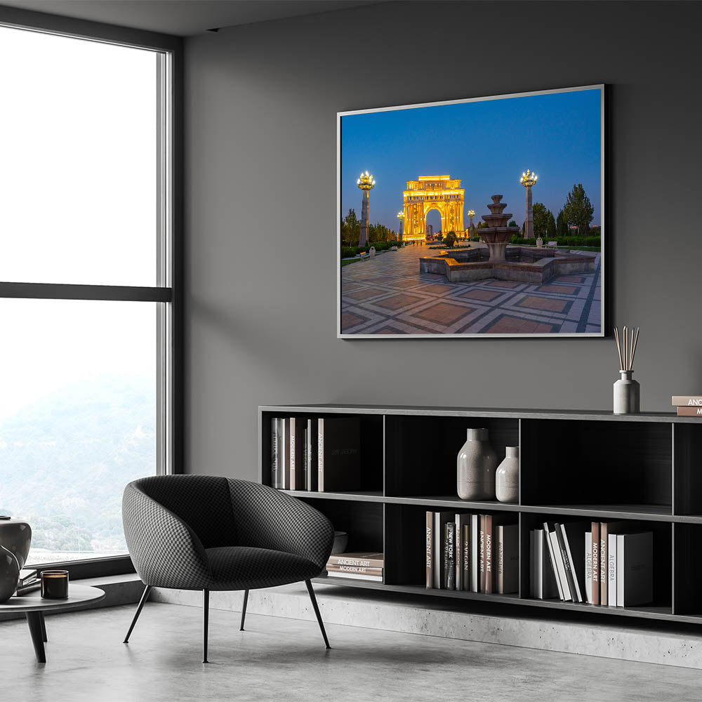 Illuminate your space with the grandeur of Azerbaijan's architecture through this stunning wall art. Featuring a beautifully lit archway in the heart of the city at dusk, this piece captures the elegance and majesty of Azerbaijani design. The soft glow of the lights against the deepening blue sky creates a serene yet striking contrast, highlighting the intricate details of the structure and its surrounding plaza. The fountain and lampposts add depth to the scene, making this artwork a perfect blend of modernity and tradition.