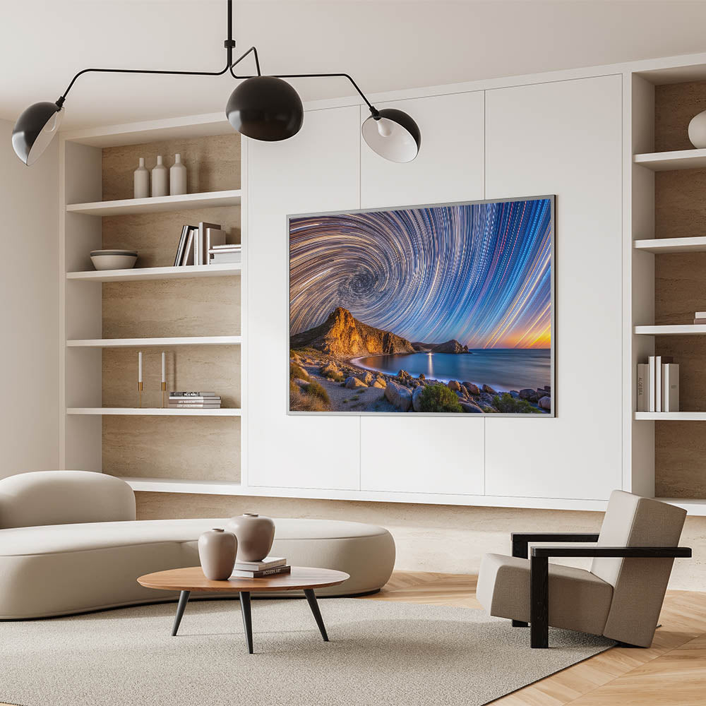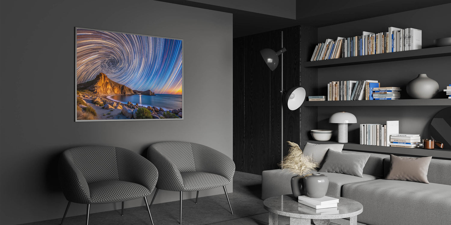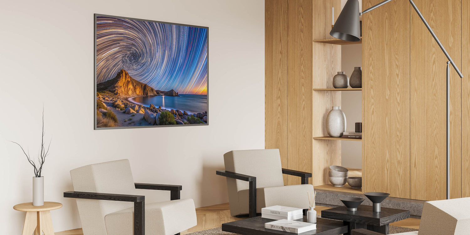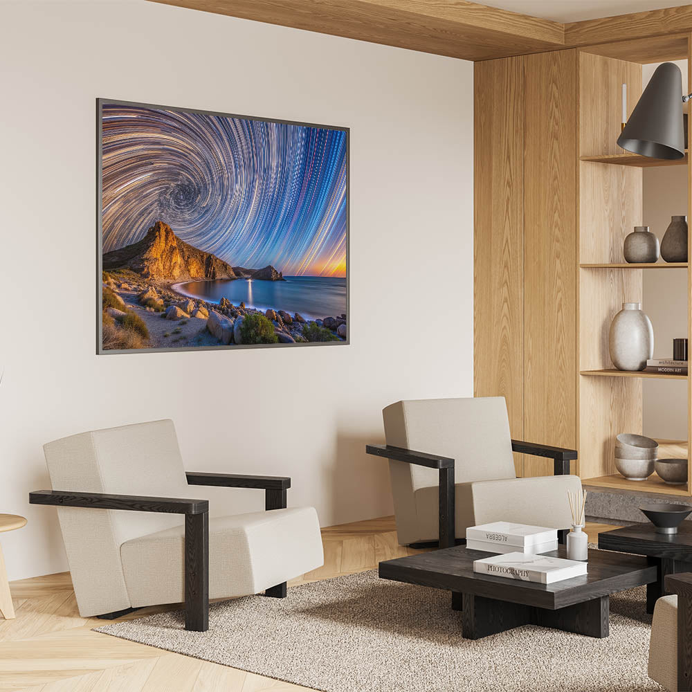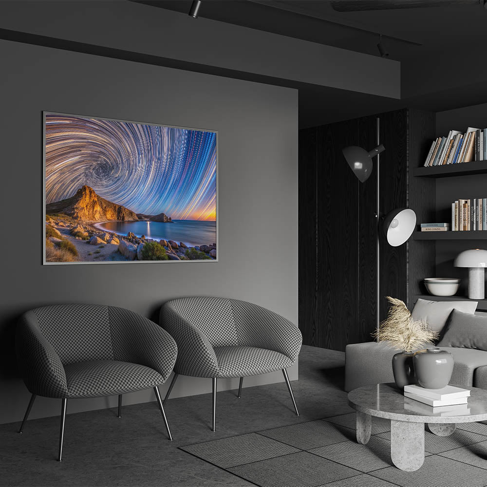 Immerse yourself in the mesmerizing beauty of Baja California Sur with this captivating night sky wall art. Featuring a stunning time-lapse of star trails over the rugged coastal landscape, this piece perfectly captures the serene and awe-inspiring essence of Mexico’s wilderness. The swirling stars create a hypnotic pattern against the deep blues and warm earth tones of the terrain, making this artwork a perfect centerpiece for any room.