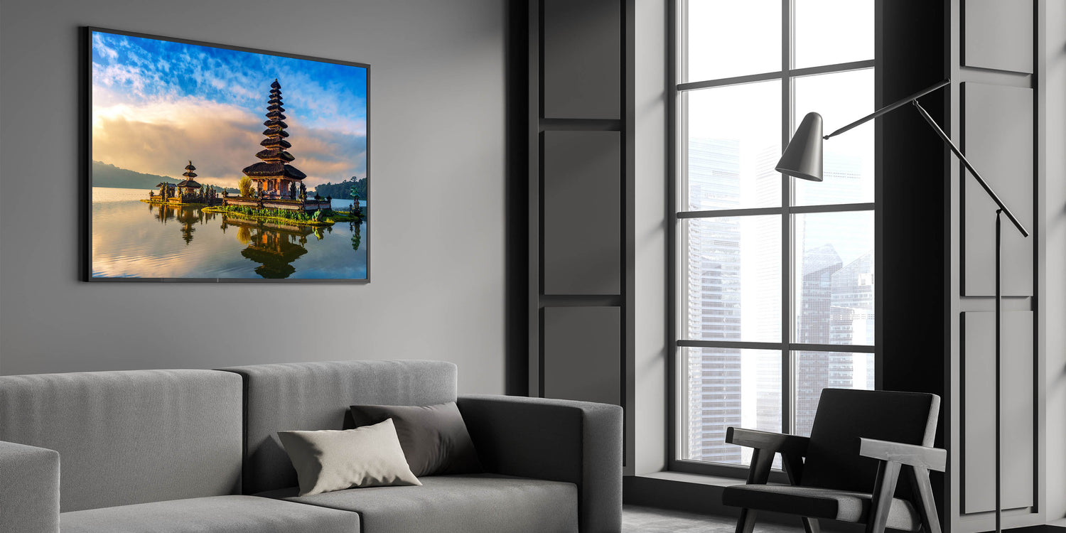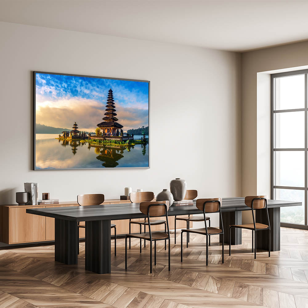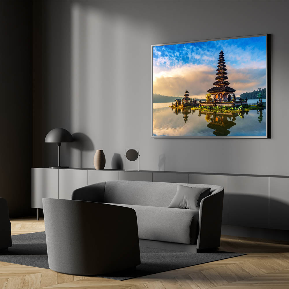 Step into the serene world of Bali with this stunning wall art, featuring a traditional Balinese temple beautifully reflected on calm waters. This captivating scene combines the peaceful atmosphere of a quiet morning with the rich cultural heritage of Bali. The vibrant sky, coupled with the temple’s intricate architecture, creates a breathtaking composition that brings a sense of tranquility and cultural elegance to any space.