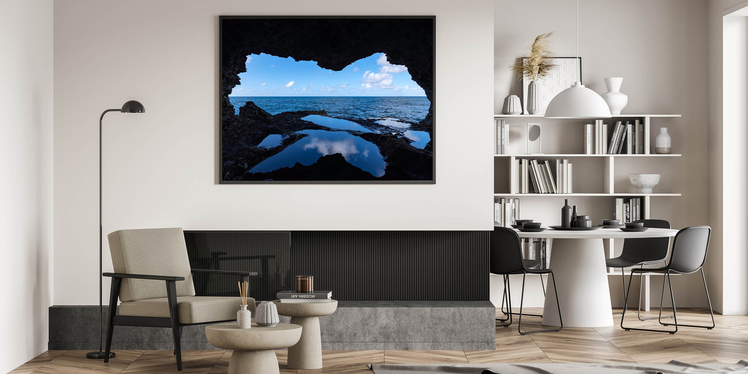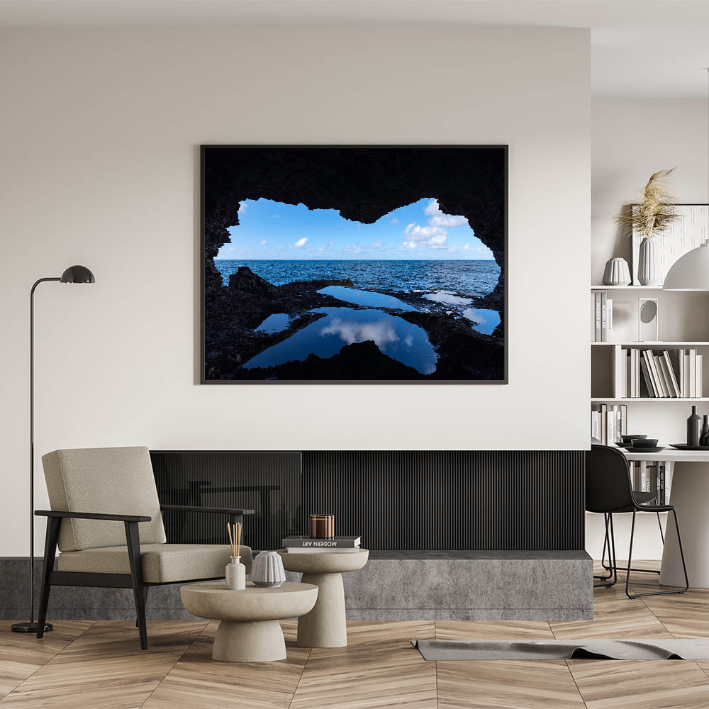 - High-quality print that highlights the rich details and contrast between the cave and ocean view.