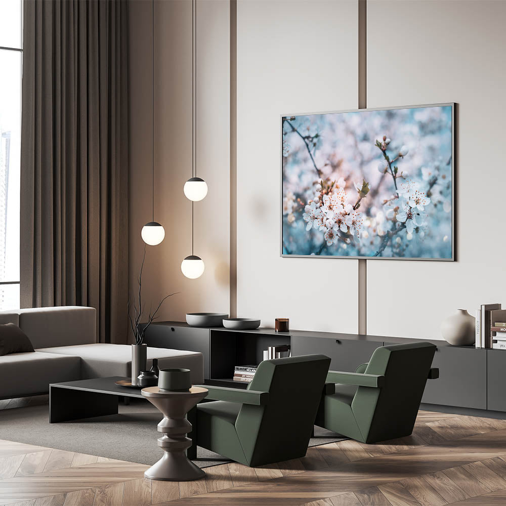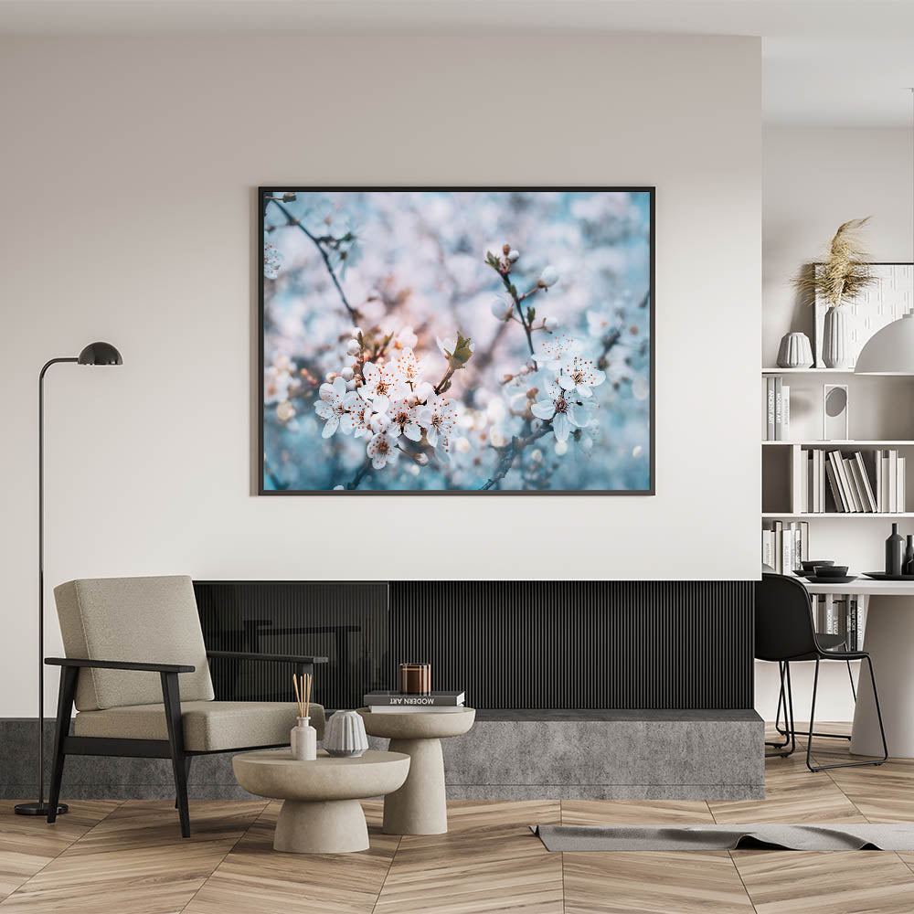 Celebrate the beauty of spring with this captivating floral wall art, showcasing a close-up of delicate cherry blossoms in full bloom. The soft blue and white tones, combined with a stunning bokeh effect in the background, create a dreamy and serene atmosphere. Perfect for bringing a sense of peace and renewal to your living room, bedroom, or office, this flower canvas art will add elegance and charm to any space.