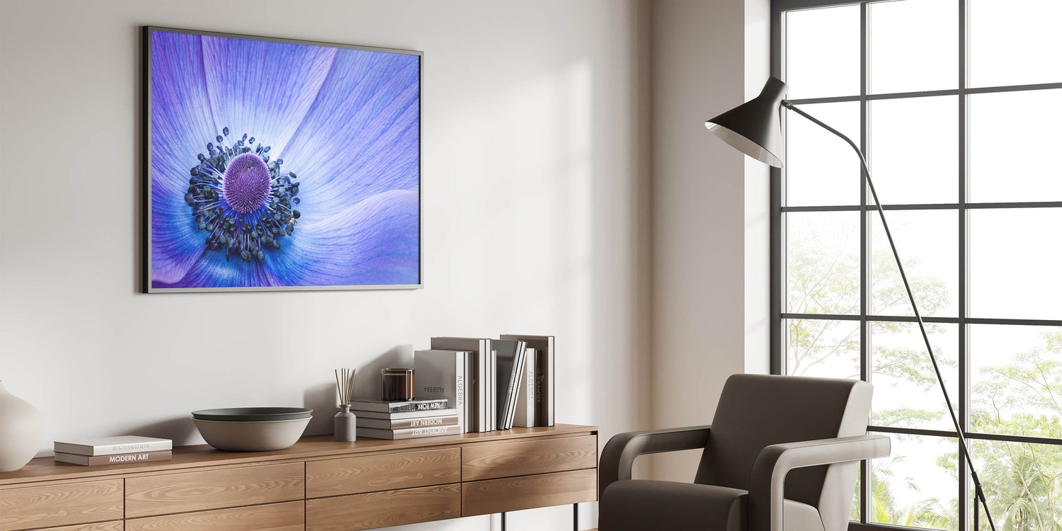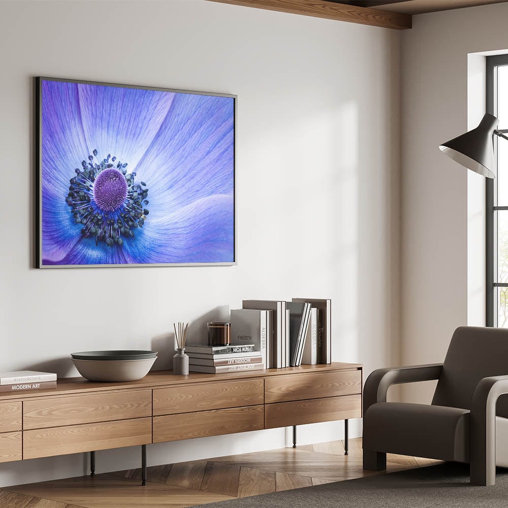 Immerse yourself in the beauty of nature with this exquisite fine art photography acrylic print. Featuring a mesmerizing macro close-up of a blue anemone flower, this piece captures the intricate details of its velvety petals and striking center. The soft gradient of blue and violet hues adds depth, making it a visually soothing and elegant addition to any space.