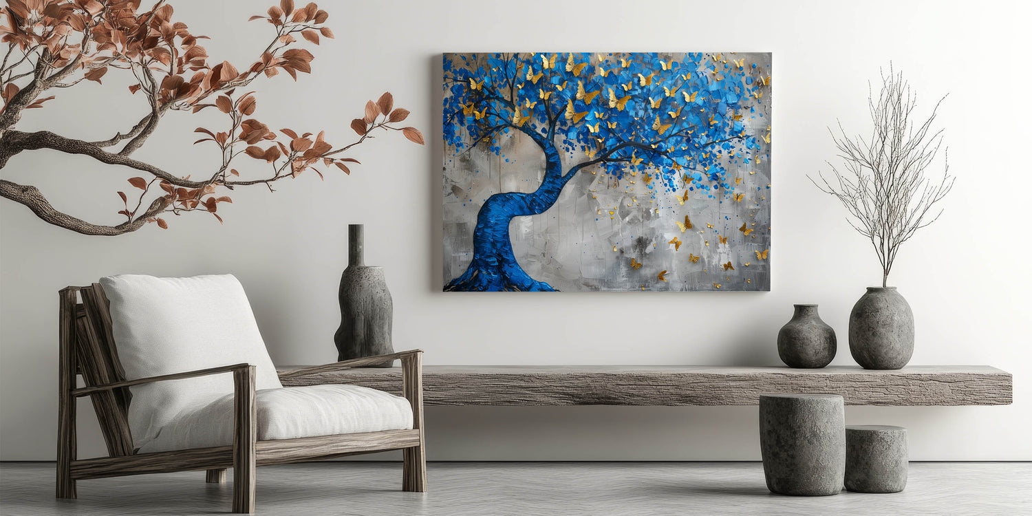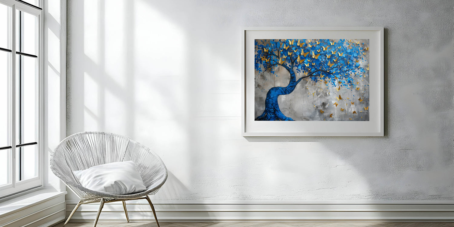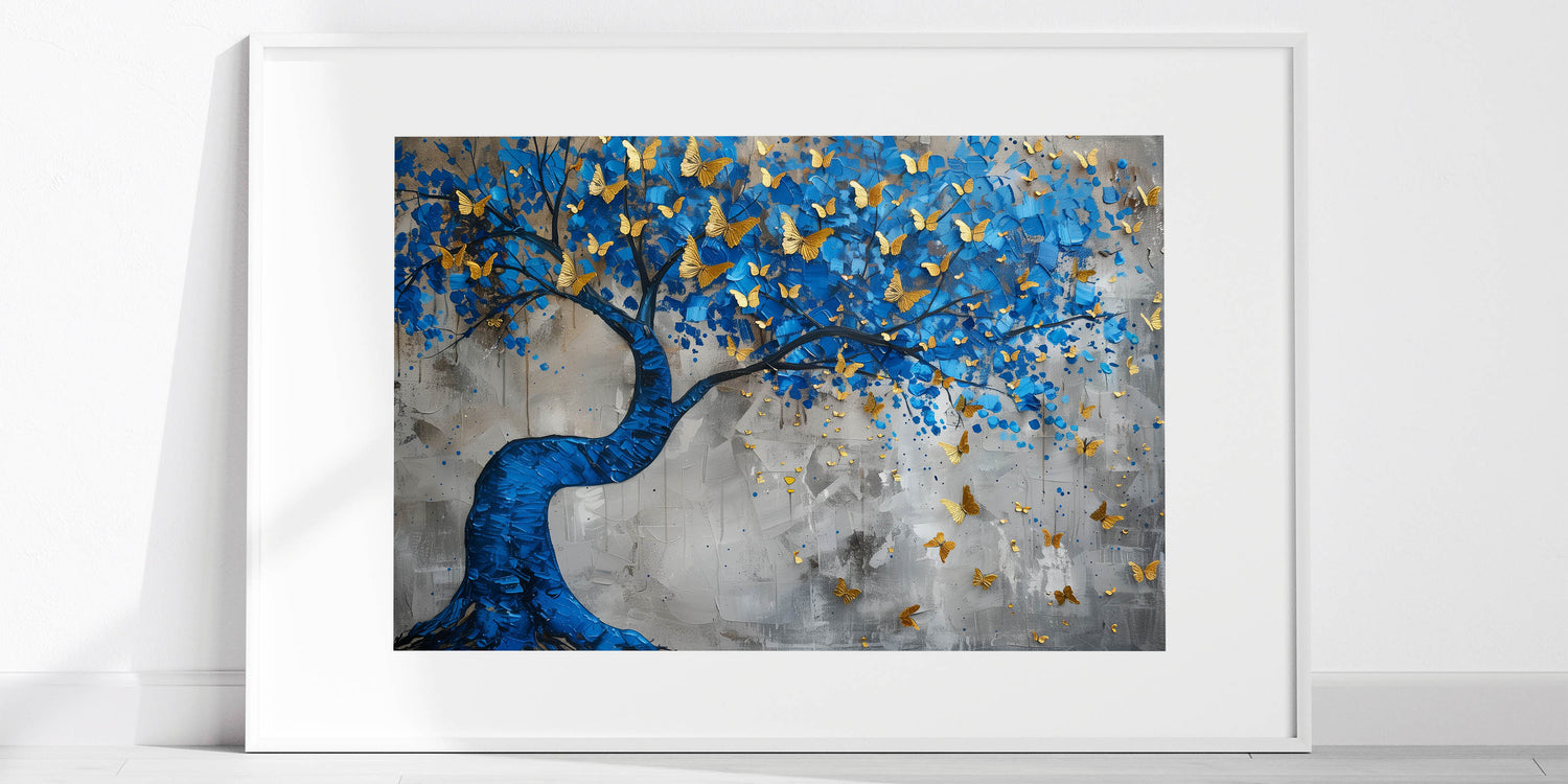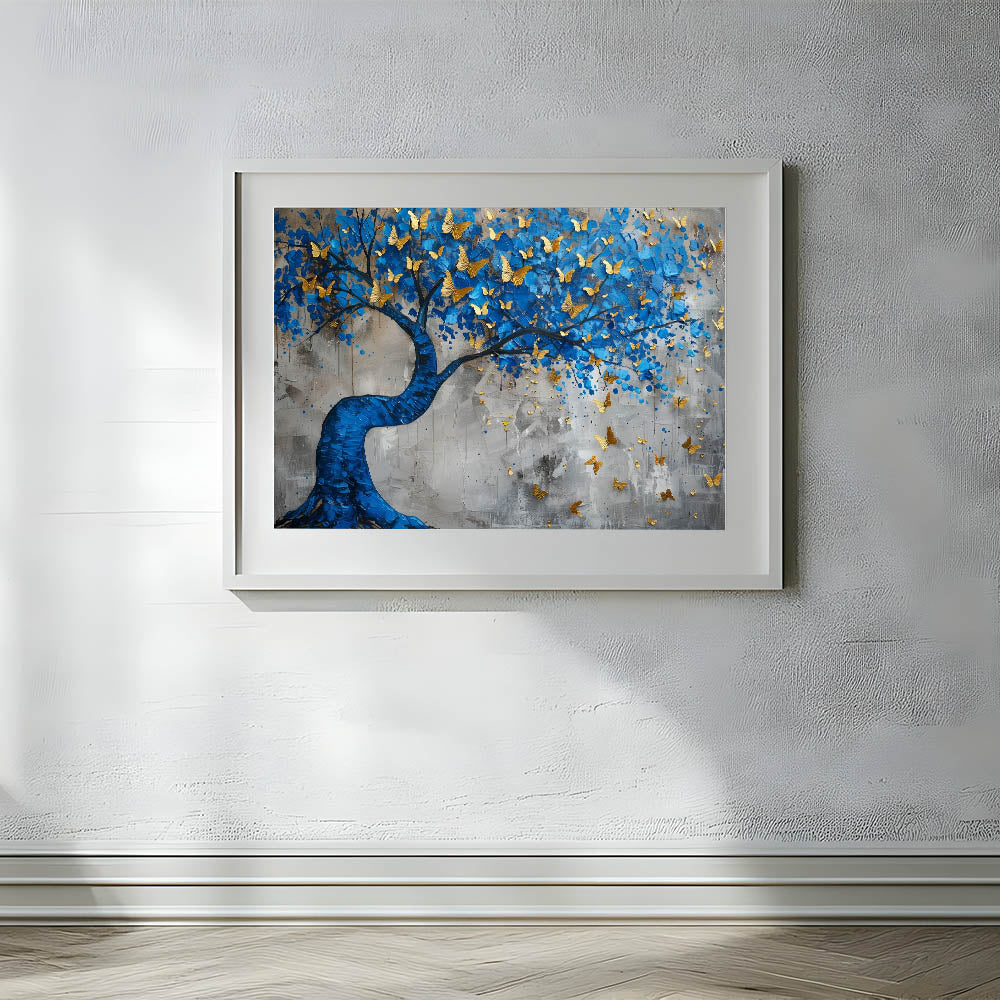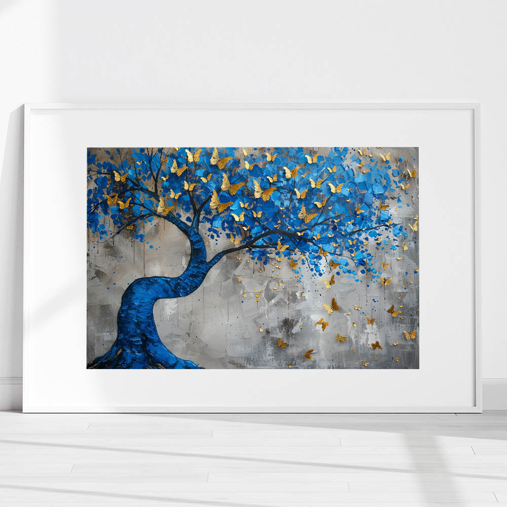 This artwork is not just a decoration; it’s a statement of style and sophistication. The vivid blue tones combined with the shimmering gold butterflies bring a sense of tranquility and luxury to your living space. Ideal for the living room, bedroom, or even an office, this butterfly tree art piece is sure to become a focal point in any room.