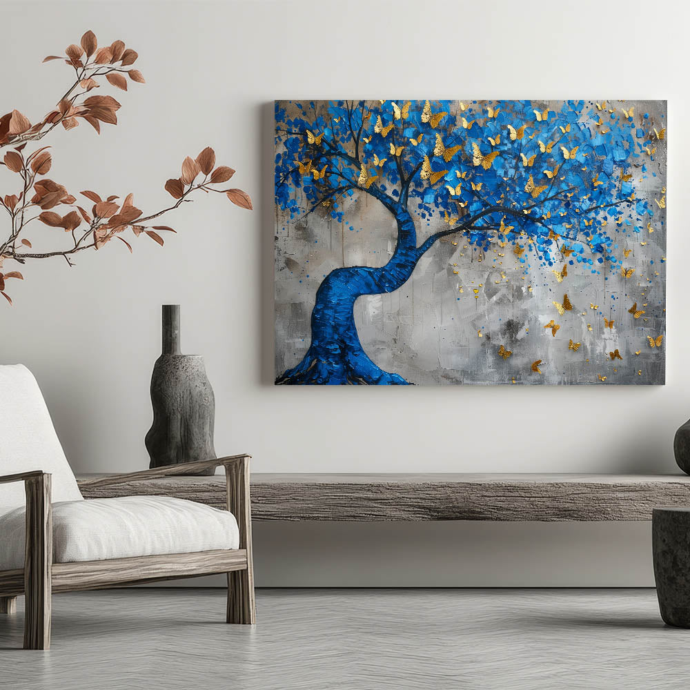 Bring an enchanting touch to your home with this Blue Butterfly Tree Wall Art. This captivating piece features a tree adorned with vibrant blue leaves and delicate gold butterflies, creating a mesmerizing contrast that adds depth and elegance to any space. The intricate design and rich colors make this Butterfly Canvas Print a perfect addition to both modern and classic interiors.