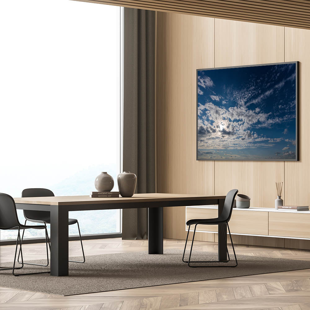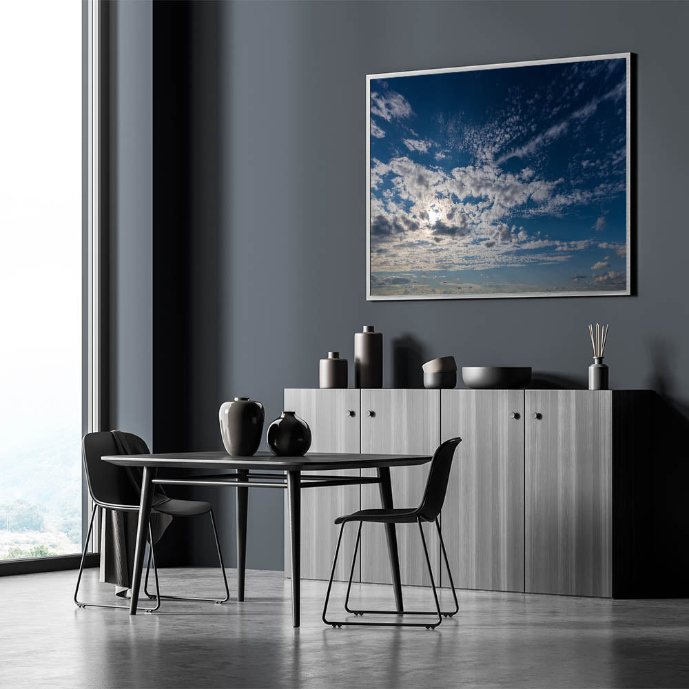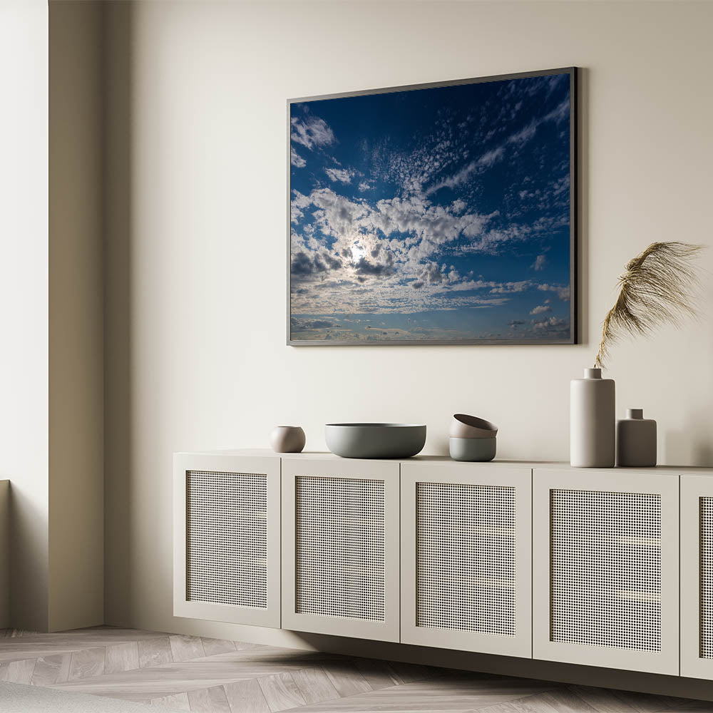 Bring the vastness of the open sky into your home with this captivating cloudscape art, featuring an expansive blue sky dotted with soft, fluffy clouds. This canvas print beautifully captures the peacefulness and endless possibilities of the sky, making it an ideal addition to any room that seeks to inspire and uplift. The interplay of light and shadow across the clouds creates a dynamic visual experience that draws the eye and soothes the soul.