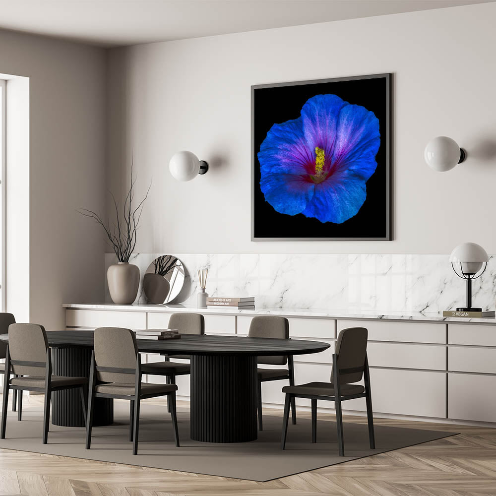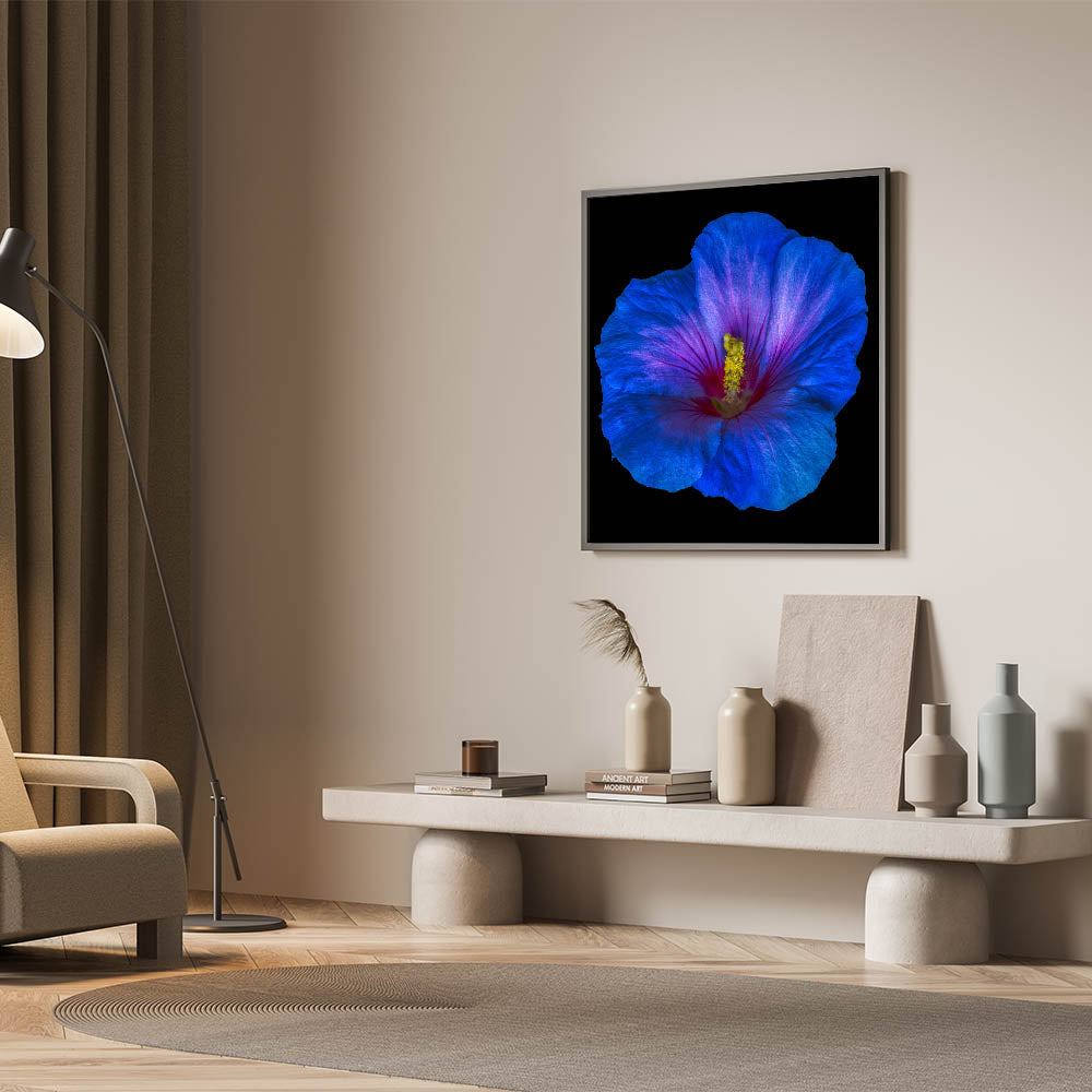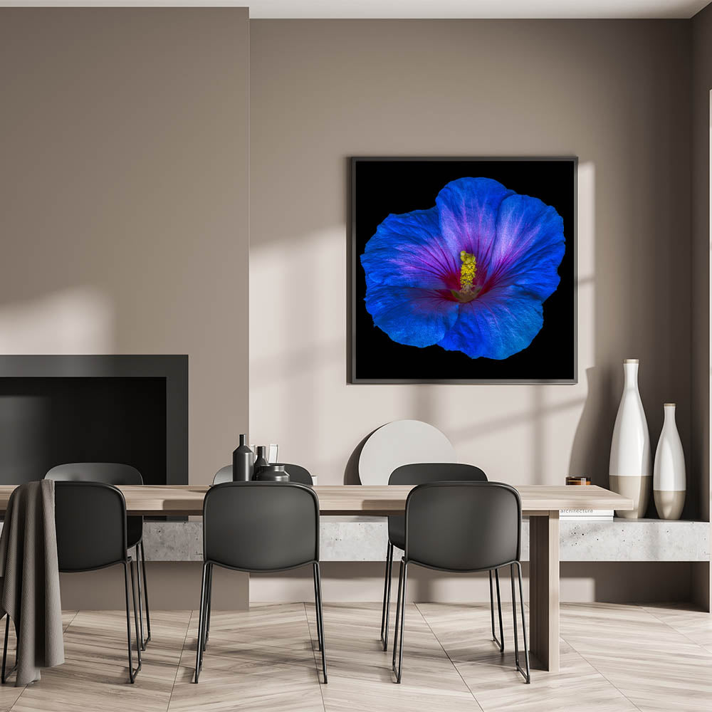 Elevate your space with this Bold Blue Hibiscus Wall Art, a captivating representation of the hibiscus flower in vibrant shades of blue and magenta. The deep blue petals contrasted with magenta and yellow accents create a striking focal point that adds a bold and modern touch to any room. This botanical art piece is perfect for those who want to infuse their space with a unique, nature-inspired artwork that stands out.