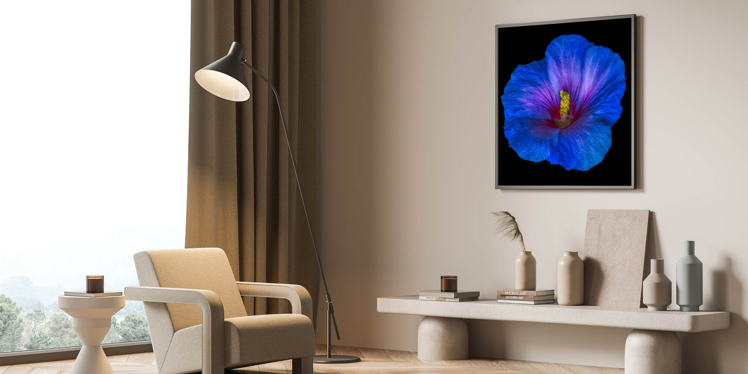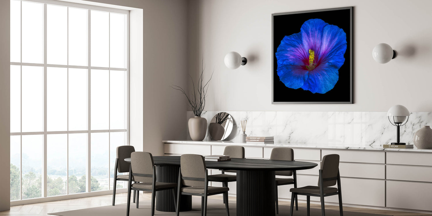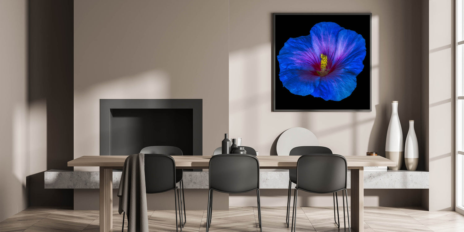 Elevate your space with this Bold Blue Hibiscus Wall Art, a captivating representation of the hibiscus flower in vibrant shades of blue and magenta. The deep blue petals contrasted with magenta and yellow accents create a striking focal point that adds a bold and modern touch to any room. This botanical art piece is perfect for those who want to infuse their space with a unique, nature-inspired artwork that stands out.