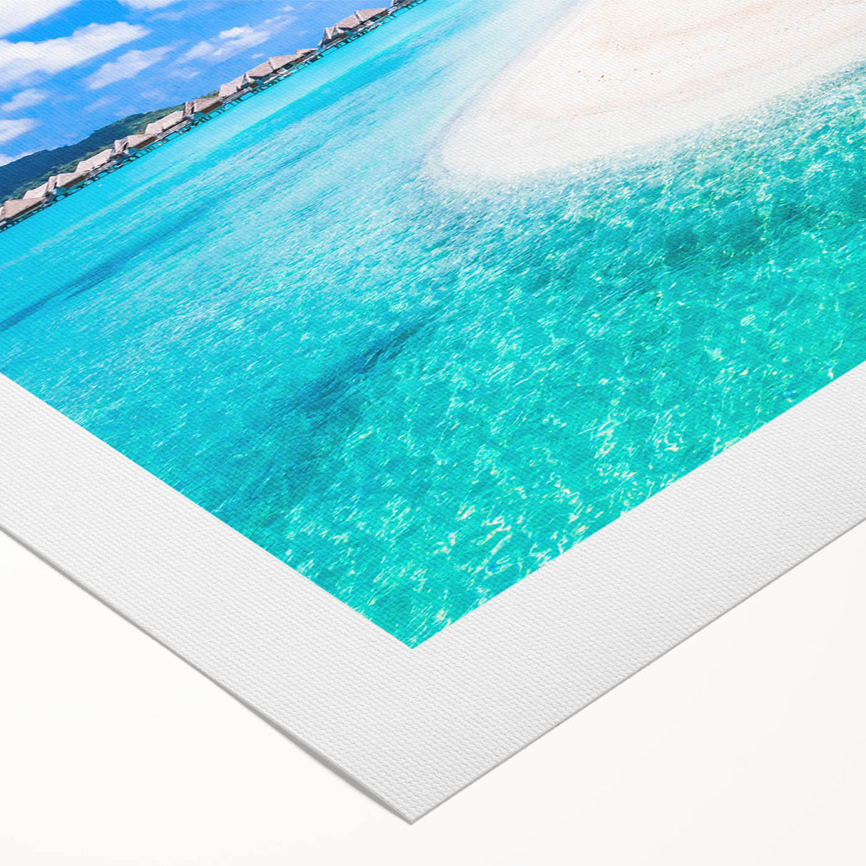 Immerse yourself in the paradise of Bora Bora with our "Tropical Resort Art" canvas. This stunning print features a pristine beach with crystal-clear waters, lined with thatched-roof bungalows and lush palm trees, epitomizing the essence of a luxury tropical getaway.
