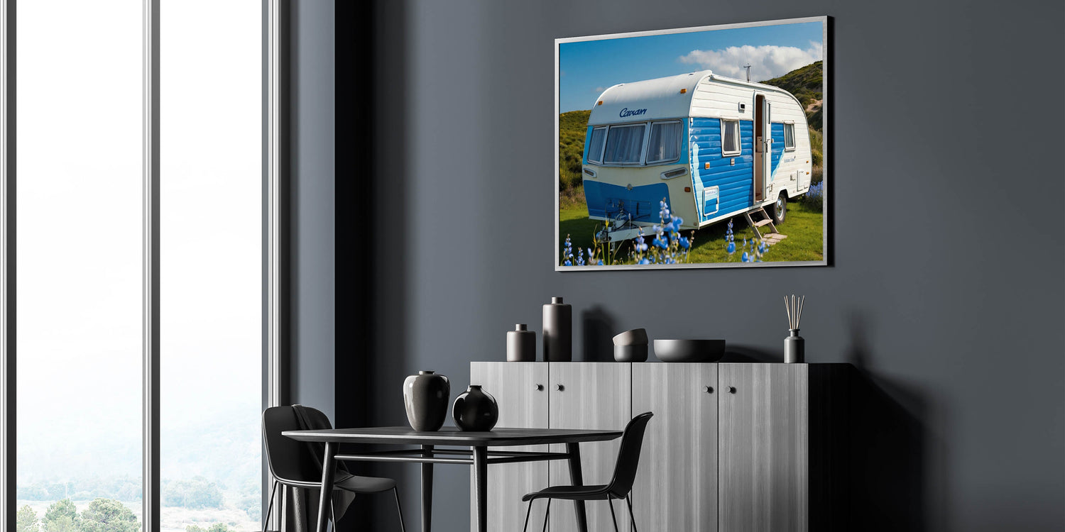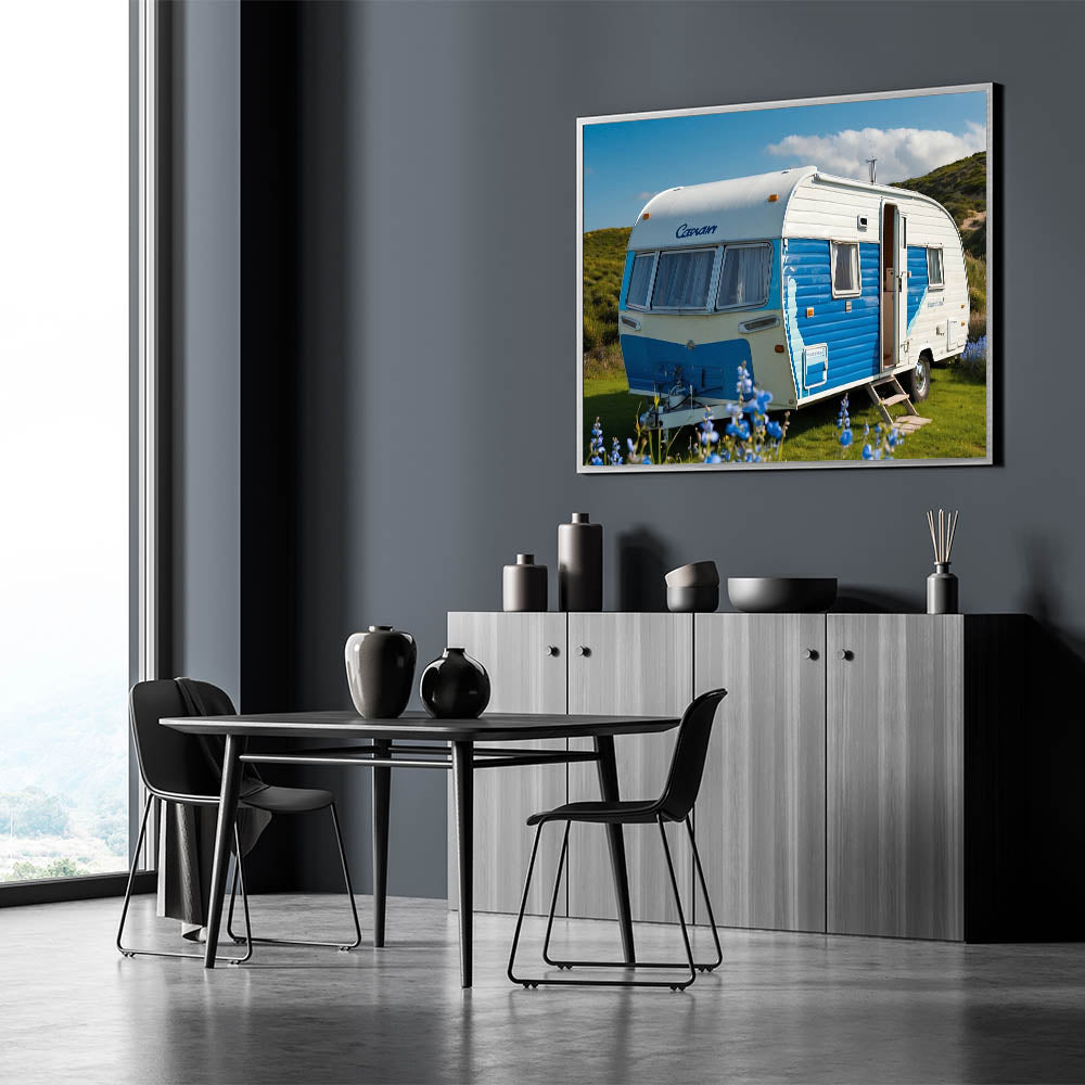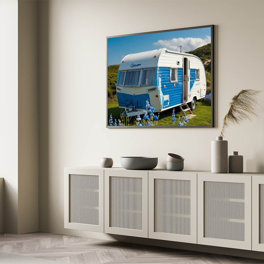 Bring a touch of coastal charm to your home with this bright coastal caravan wall art. Featuring a vibrant blue and white caravan set against a lush green landscape under a clear sky, this artwork exudes a sense of joy and adventure. The vivid colors and cheerful atmosphere make it a perfect piece for anyone who loves the ocean and the carefree spirit of coastal living.