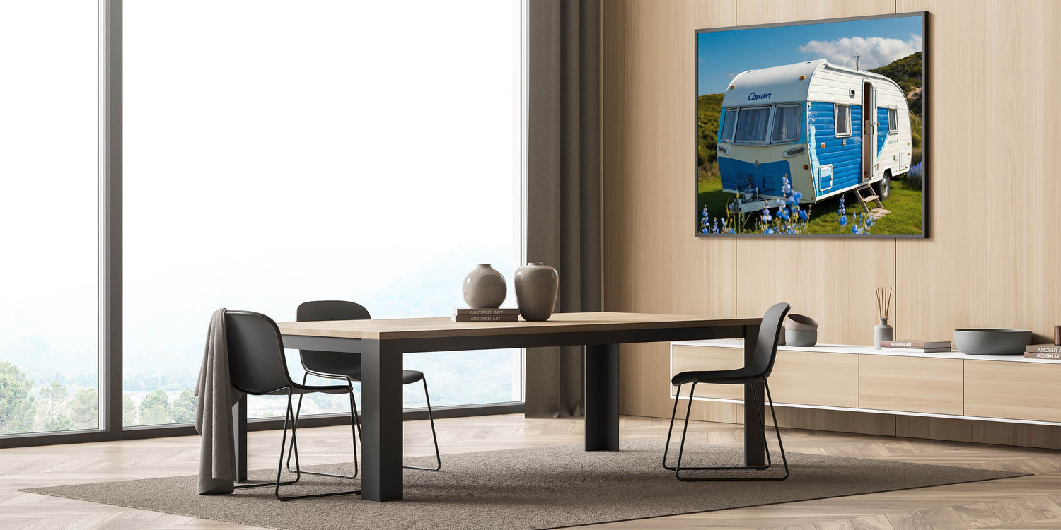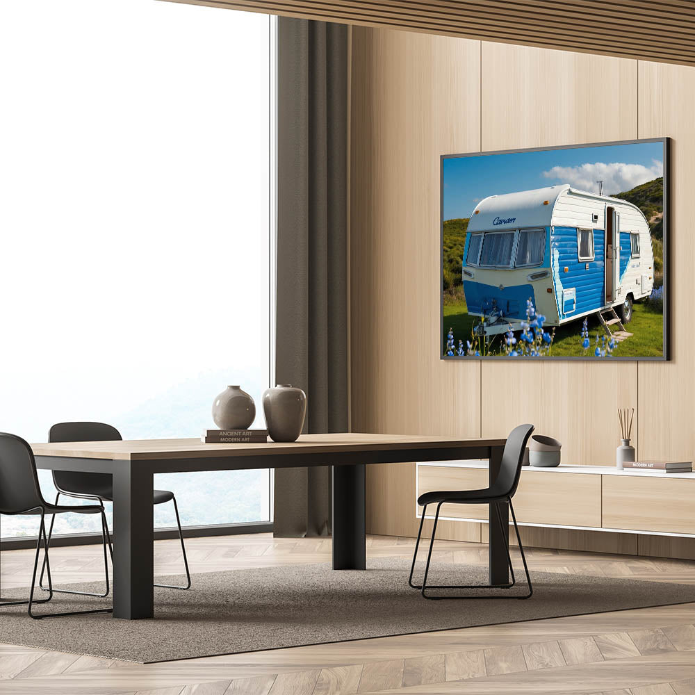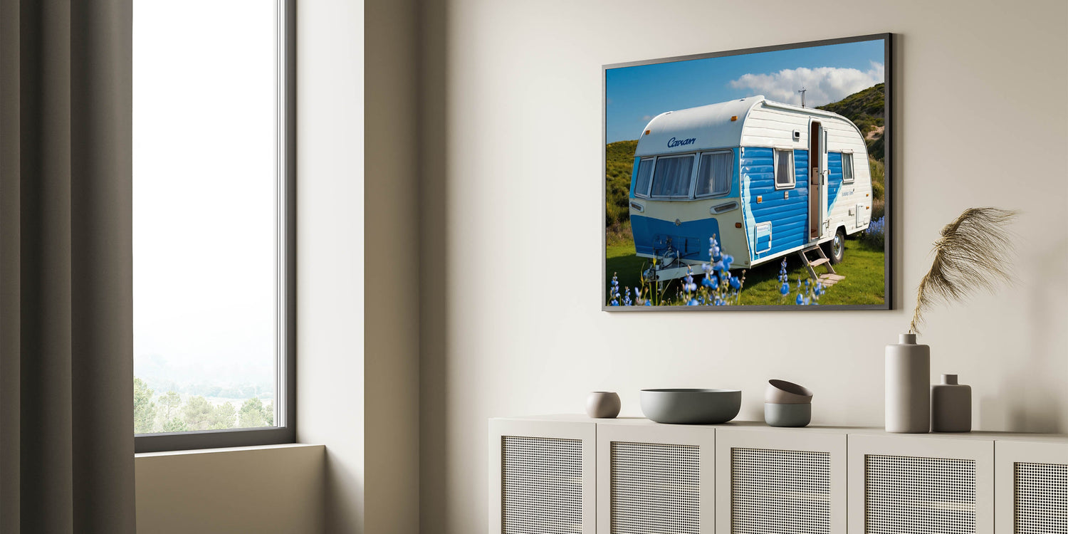 Bring a touch of coastal charm to your home with this bright coastal caravan wall art. Featuring a vibrant blue and white caravan set against a lush green landscape under a clear sky, this artwork exudes a sense of joy and adventure. The vivid colors and cheerful atmosphere make it a perfect piece for anyone who loves the ocean and the carefree spirit of coastal living.