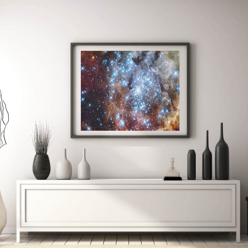 - Galaxy Art Print featuring a dazzling star cluster with brilliant blue hues and celestial light.