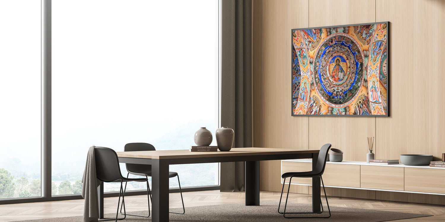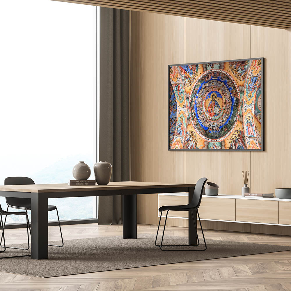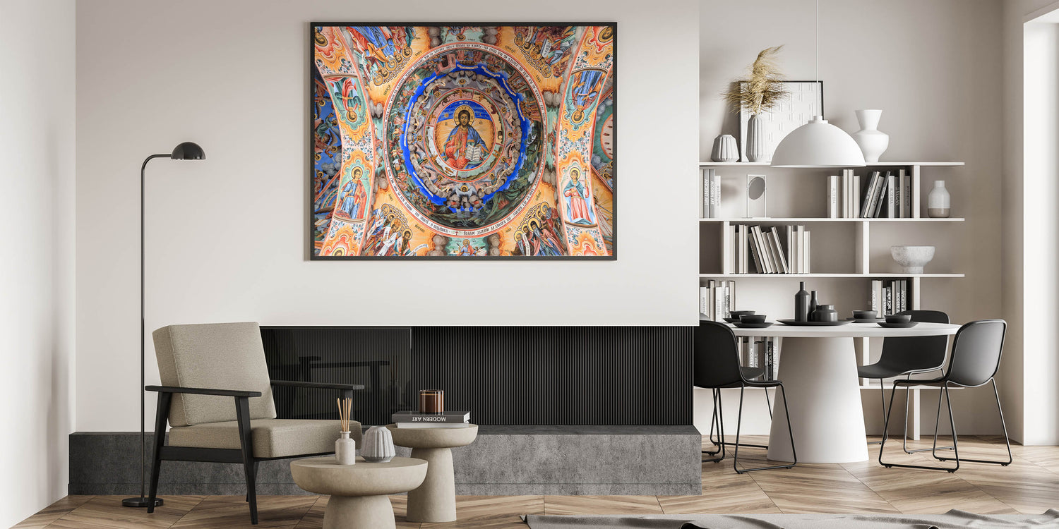 Celebrate the intricate beauty of Bulgaria’s rich cultural and religious heritage with this stunning print of the ceiling fresco from Rila Monastery. Known for its vibrant colors and detailed artistry, this fresco is a masterpiece that reflects the deep spiritual history of Bulgaria. Perfect for adding a touch of sacred beauty and Bulgarian cultural heritage decor to your home or office.