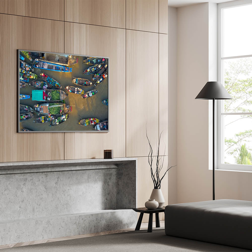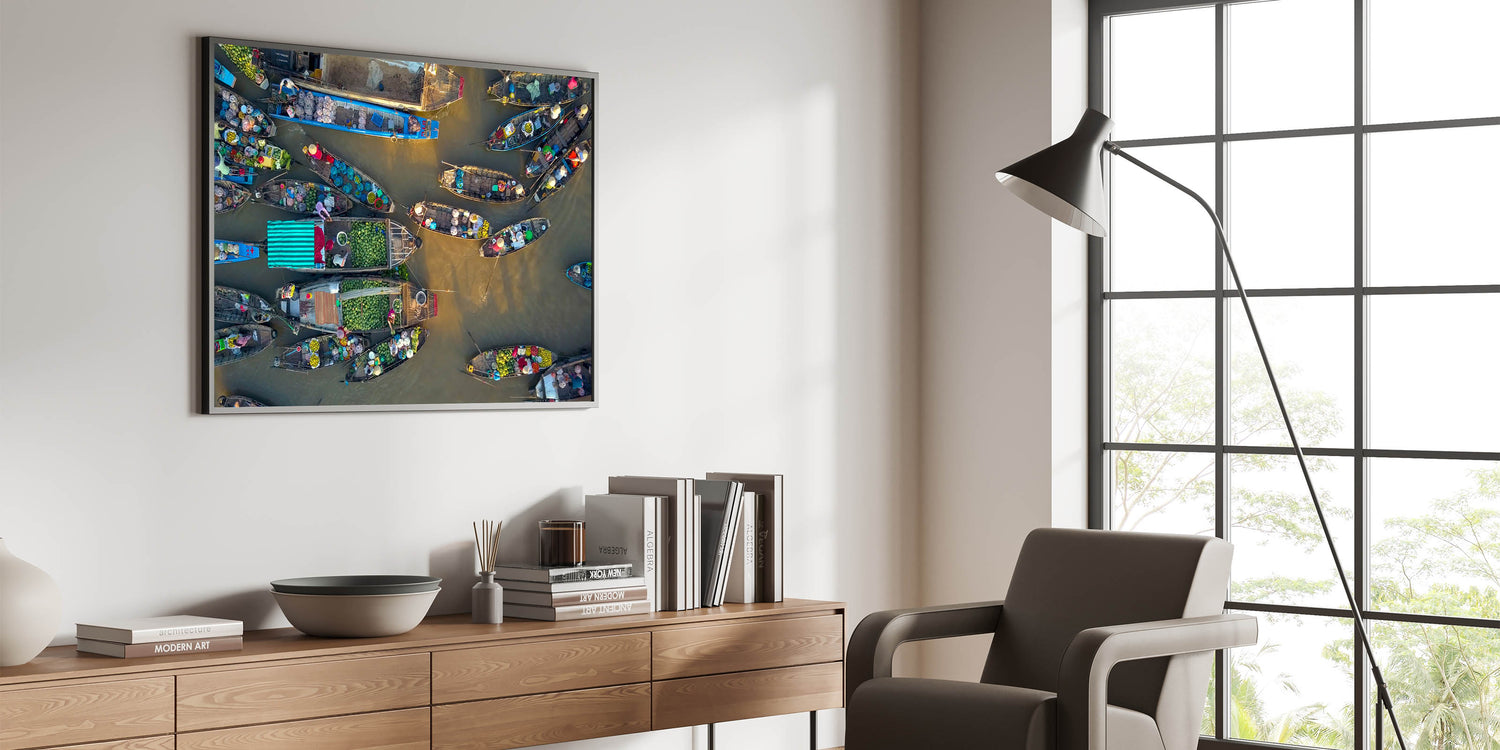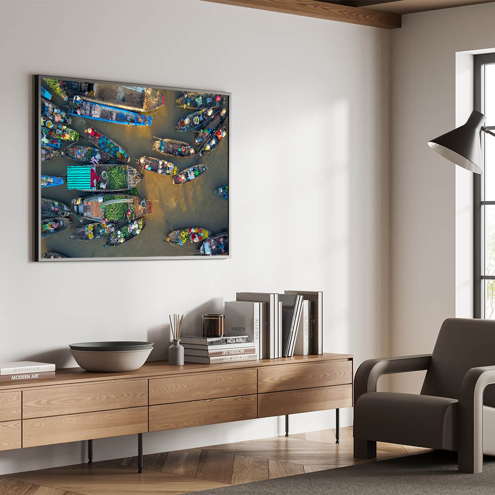 Immerse yourself in the vibrant hustle and bustle of a Vietnamese floating market with our "Bustling Vietnam Market Boats" wall art. This aerial view captures the colorful chaos and lively spirit of daily trade on the water, featuring an array of boats laden with fresh produce and goods.