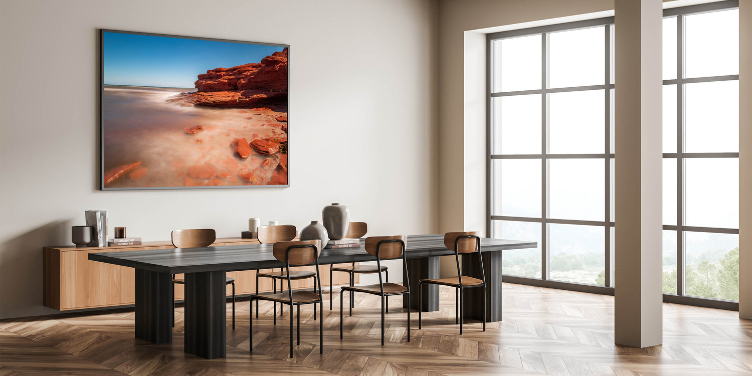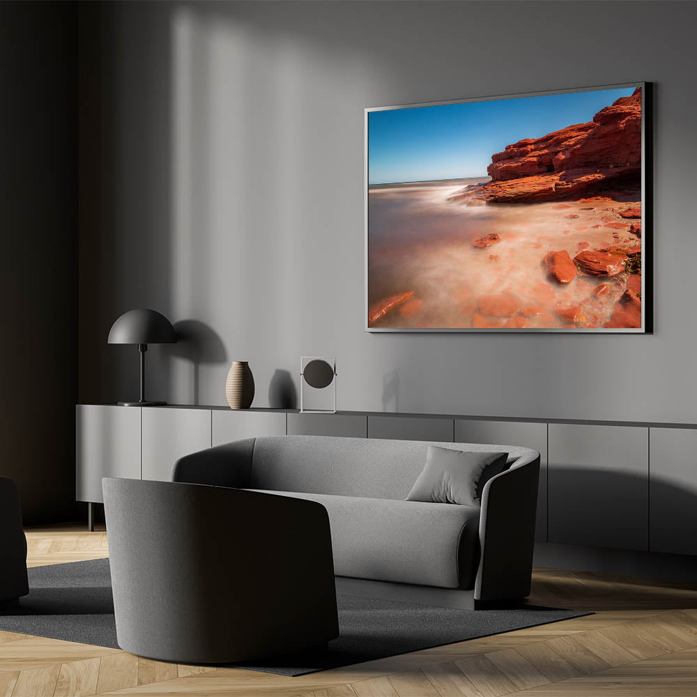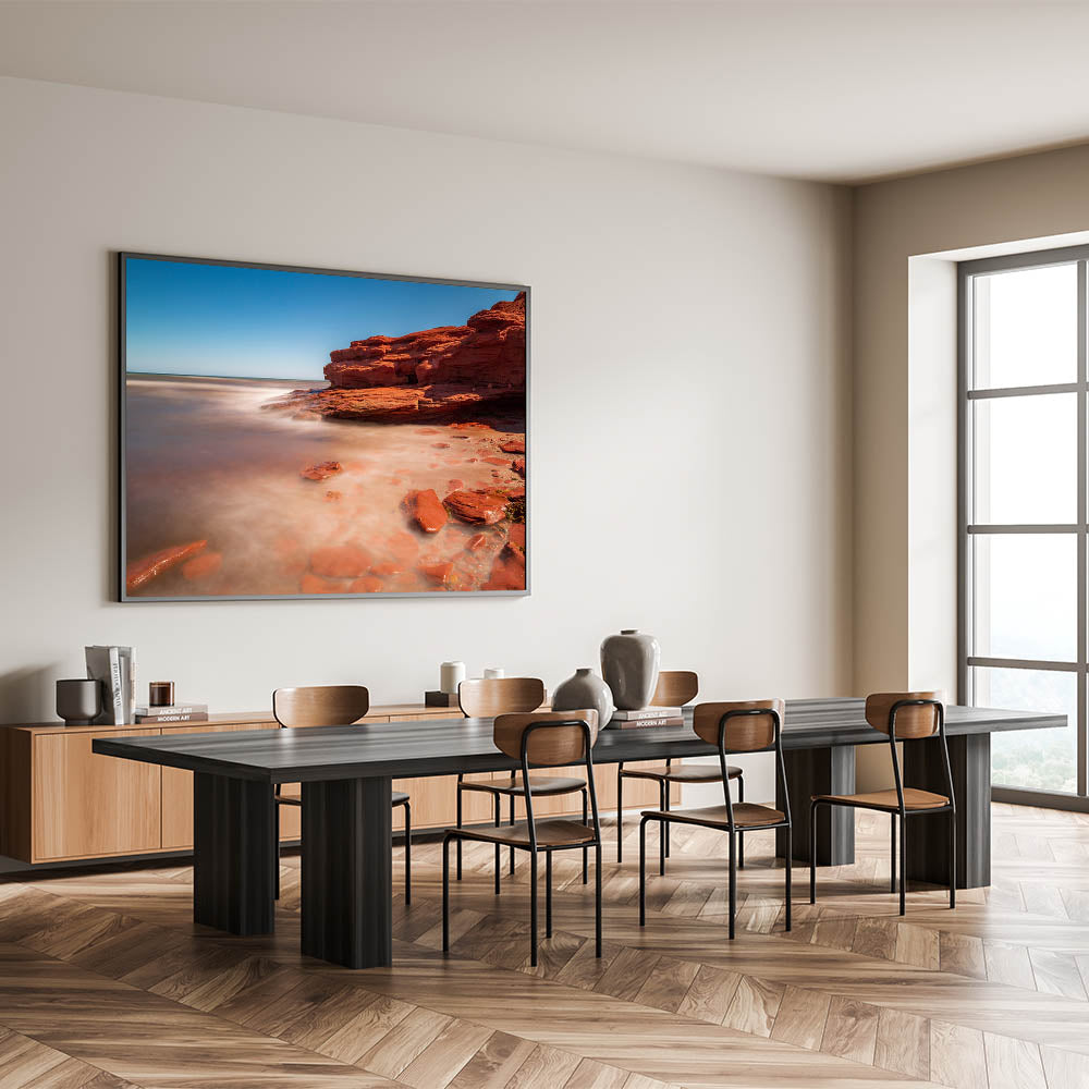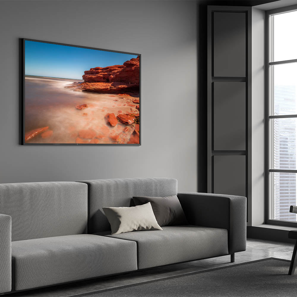 Immerse yourself in the peaceful beauty of Prince Edward Island’s red rock shores with this captivating wall art. The soft waves gently lap against the distinctive red sandstone, creating a tranquil and meditative scene that captures the unique coastal beauty of PEI. The combination of vibrant red rocks and the smooth, misty water creates an ethereal atmosphere, perfect for transforming any space into a serene retreat.