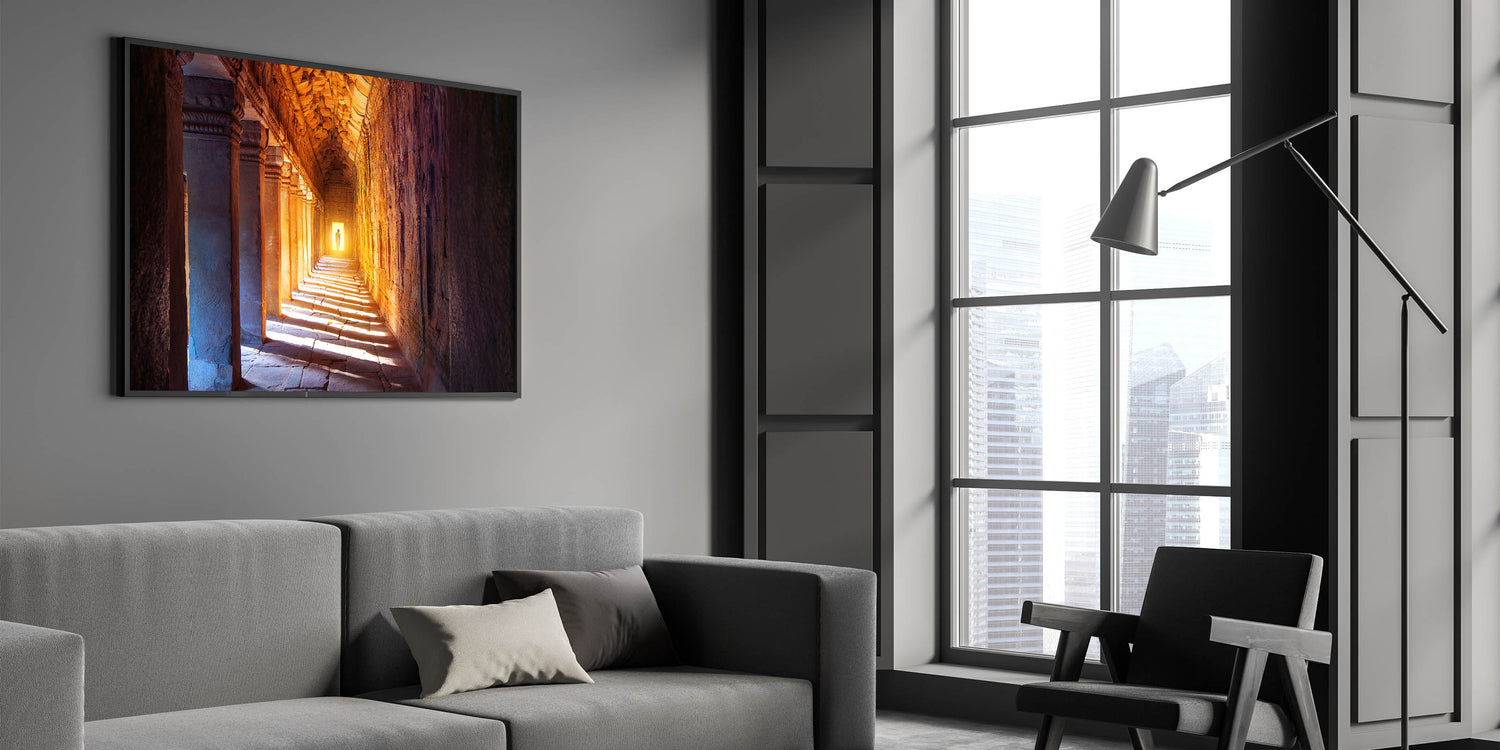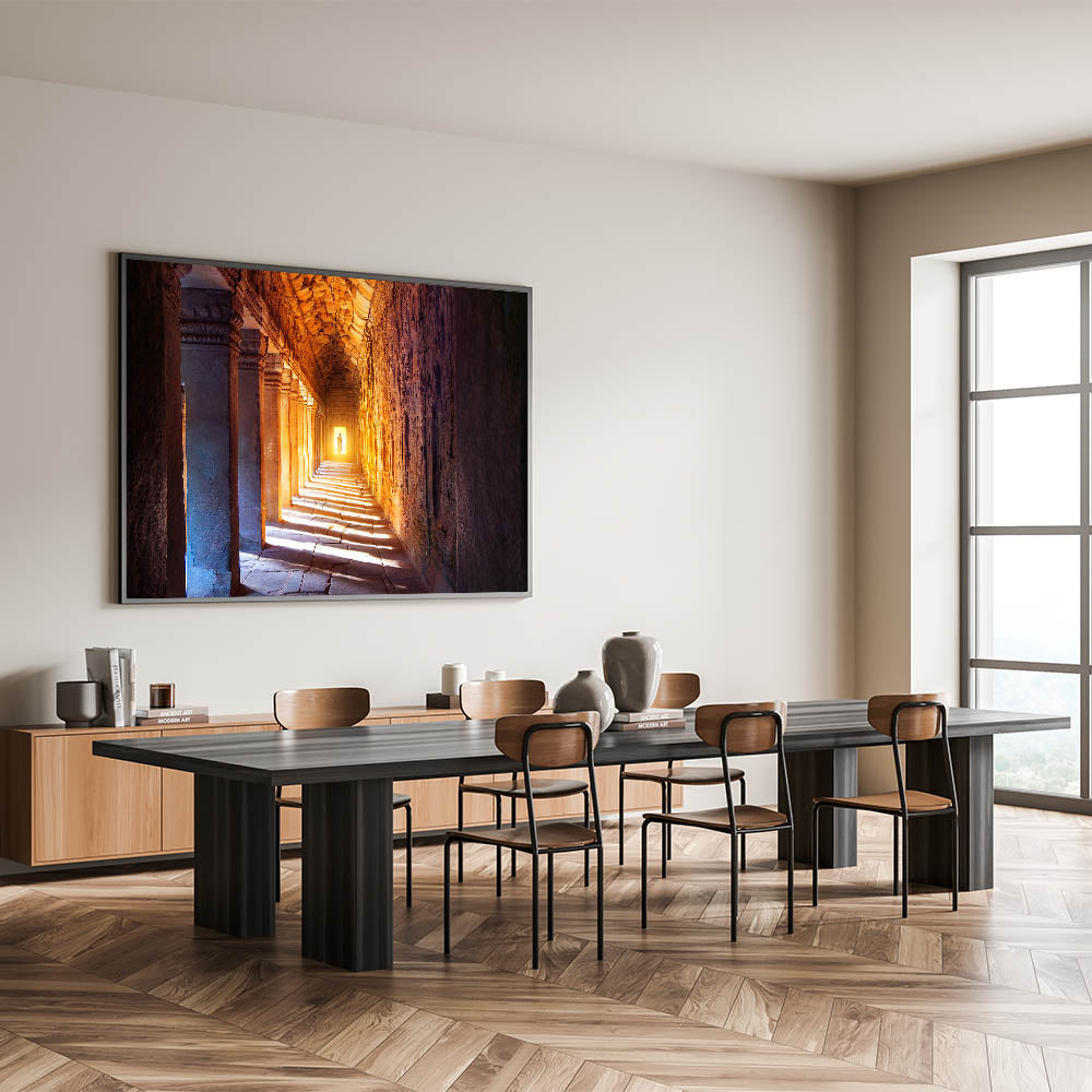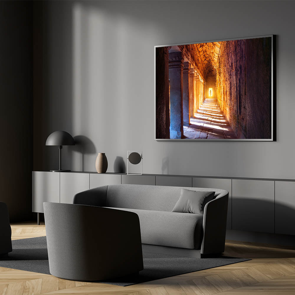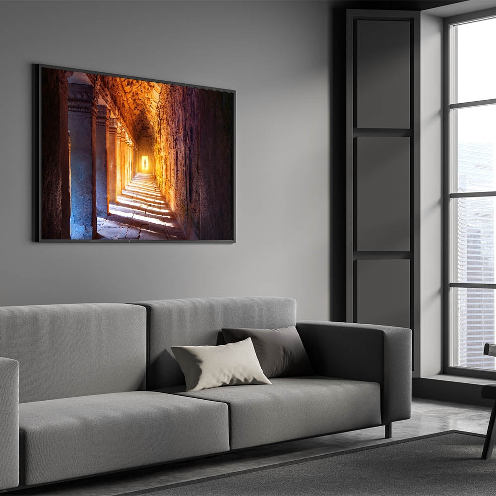Step into the mystical allure of Angkor Wat with this stunning Cambodian landscape canvas, capturing the golden light streaming through an ancient temple corridor. The play of light and shadow across the stone floor creates a mesmerizing pathway leading to a distant figure, evoking a sense of wonder and tranquility. This artwork perfectly encapsulates the timeless beauty and spiritual depth of one of Cambodia’s most revered sites.