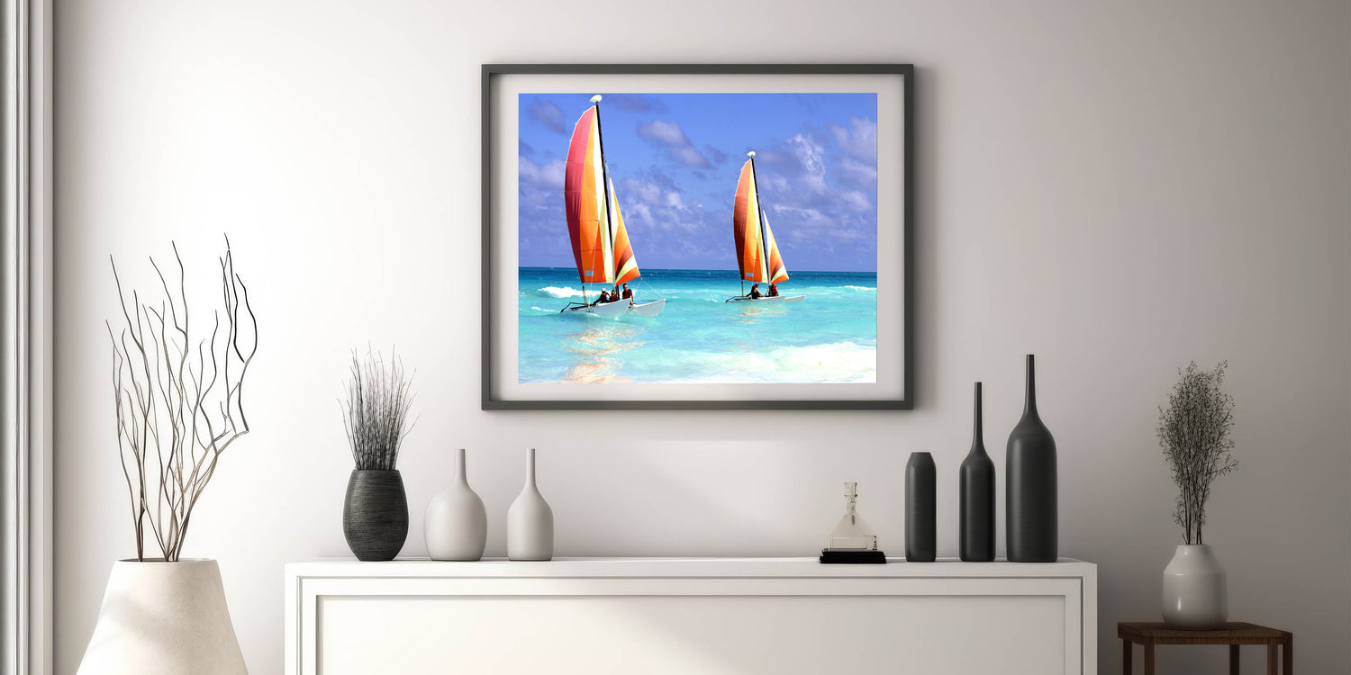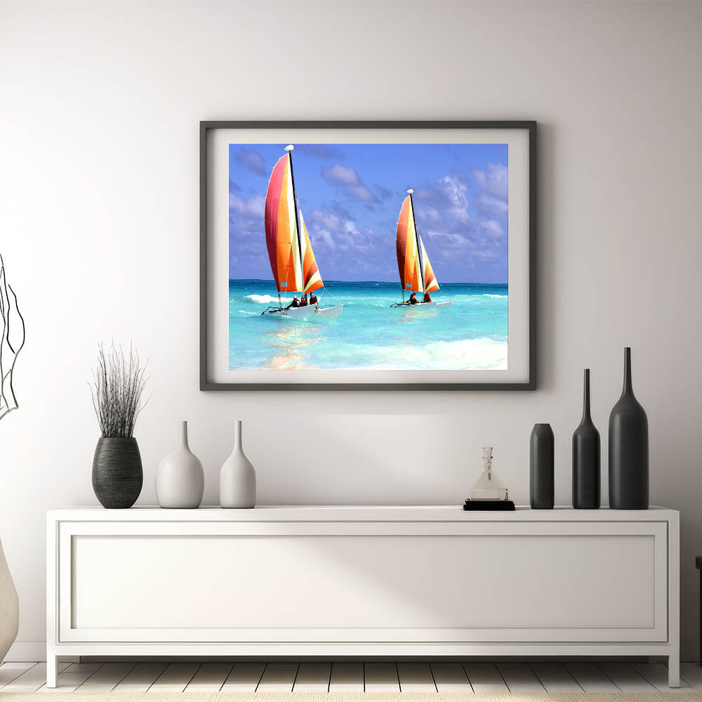 Add a splash of color and movement to your decor with this vibrant Barbados wall art, featuring two colorful sailboats skimming across the crystal-clear turquoise waters of the Caribbean. The bright orange and yellow sails contrast beautifully against the serene blue sky and water, creating a dynamic and energizing scene that instantly uplifts any room. Perfect for coastal, tropical, or nautical-themed spaces, this artwork is a true representation of the joy and adventure of island life.