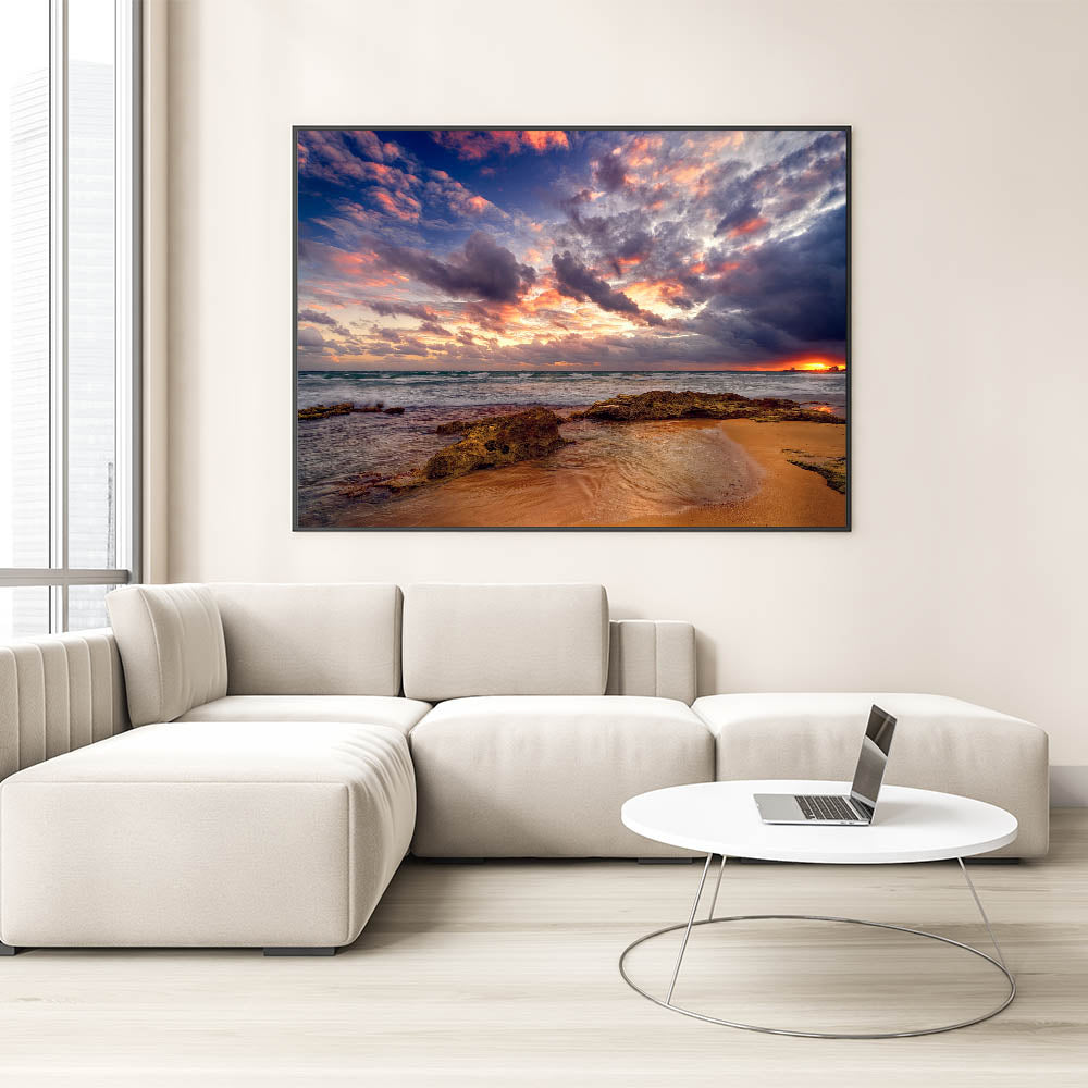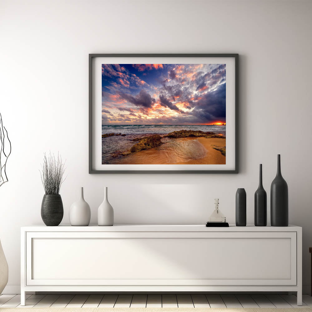 This breathtaking artwork is perfect for anyone seeking to enhance their decor with Puerto Rican scenery. The striking combination of vivid sunset hues and the tranquil beach landscape makes this piece ideal for those who want to bring a slice of tropical paradise into their home.