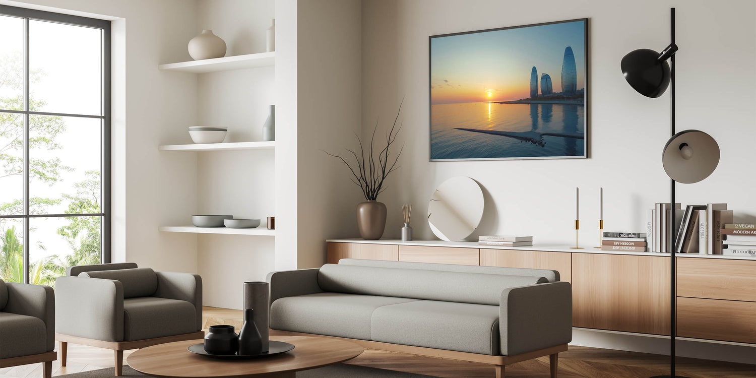 Experience the serene beauty of Baku with this breathtaking wall art, capturing the modern skyline of the city reflected in the tranquil waters of the Caspian Sea at sunset. The soft gradient of the sunset’s warm hues blends seamlessly into the calm blues of the evening sky, creating a peaceful yet striking contrast. The sleek, reflective towers stand tall along the horizon, their mirrored images dancing on the water's surface, perfectly encapsulating the blend of tradition and modernity that defines Baku.