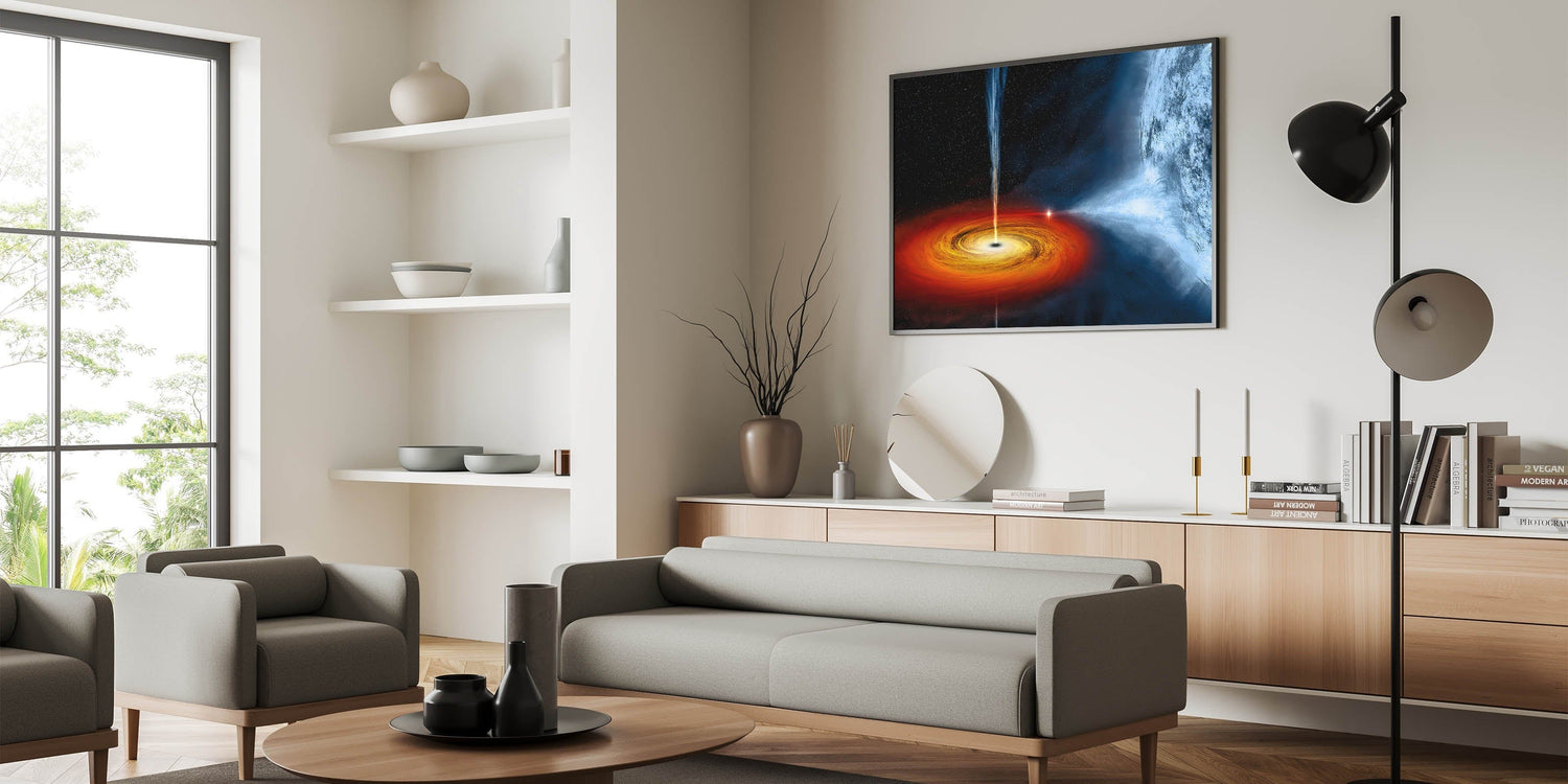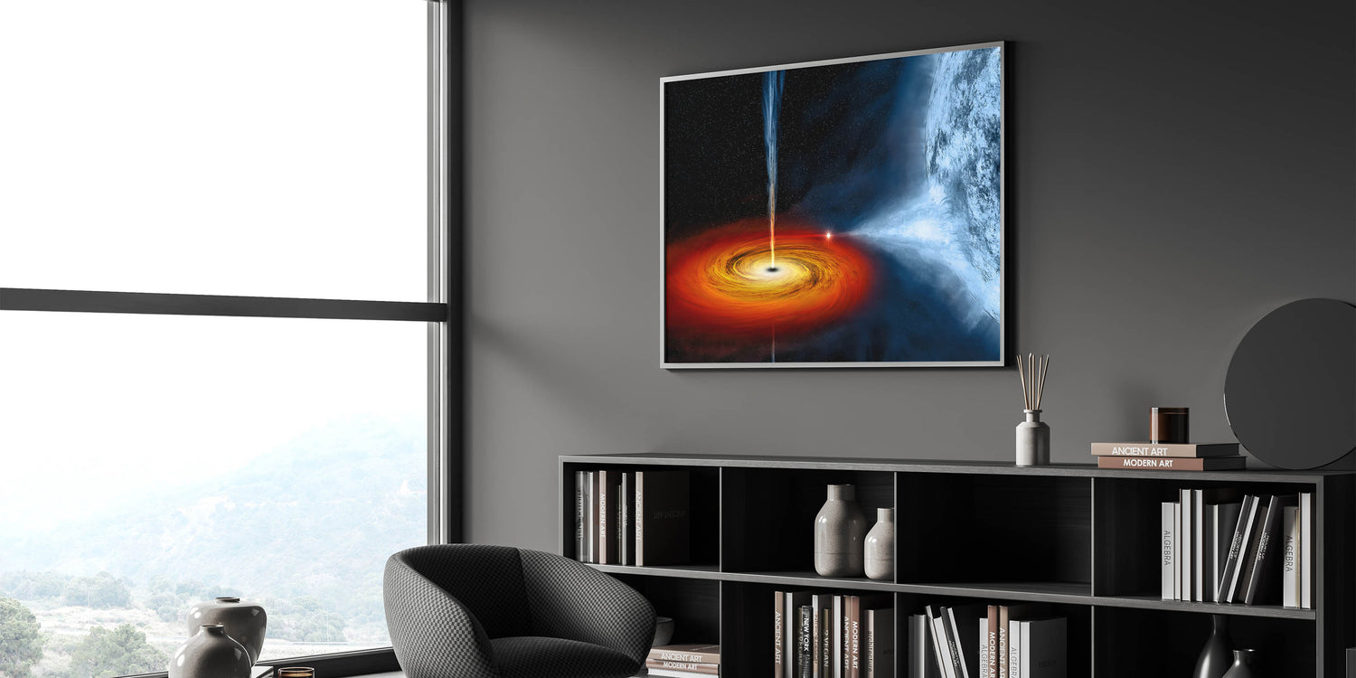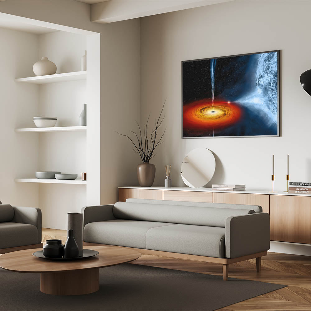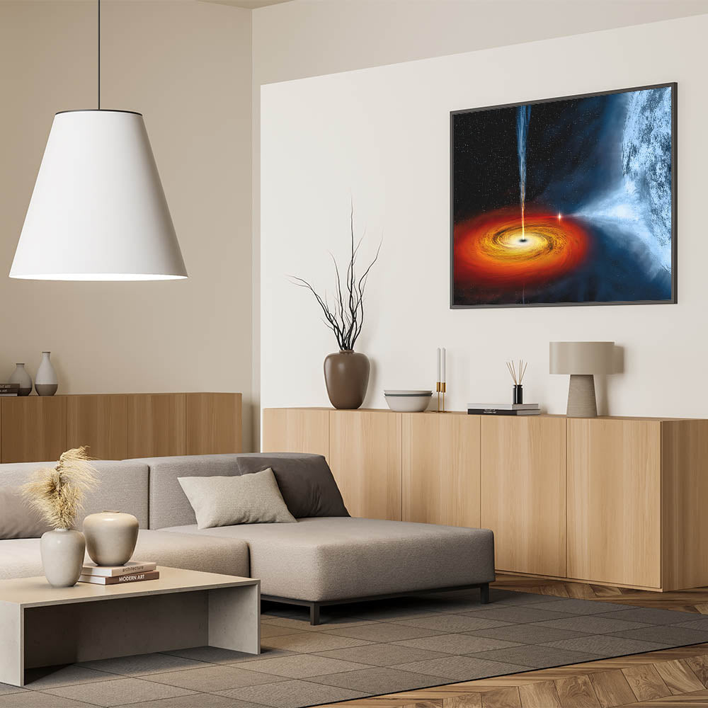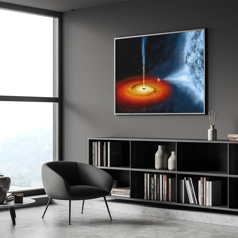 This dynamic black hole artwork is designed to capture the awe-inspiring power and energy of space. With its bold colors and detailed design, it is sure to be a conversation starter in any room.