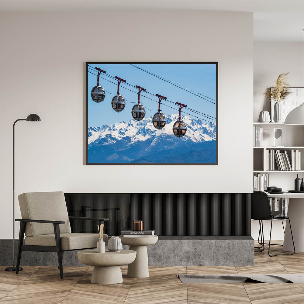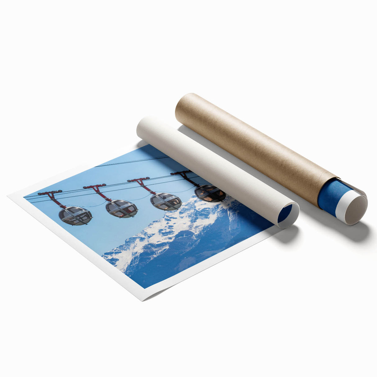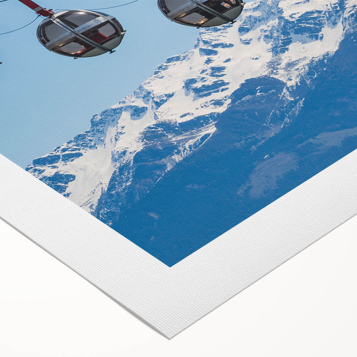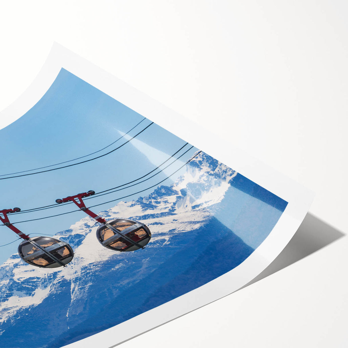 Add a touch of adventure to your space with this stunning French Alps wall art, featuring the iconic cable cars of the Chamonix Mont Blanc region. The bold red cable cars stand out against the crisp blue sky and majestic snow-covered peaks, creating a dynamic and thrilling scene. This art piece perfectly captures the essence of alpine life, where nature’s beauty meets the excitement of mountain exploration.