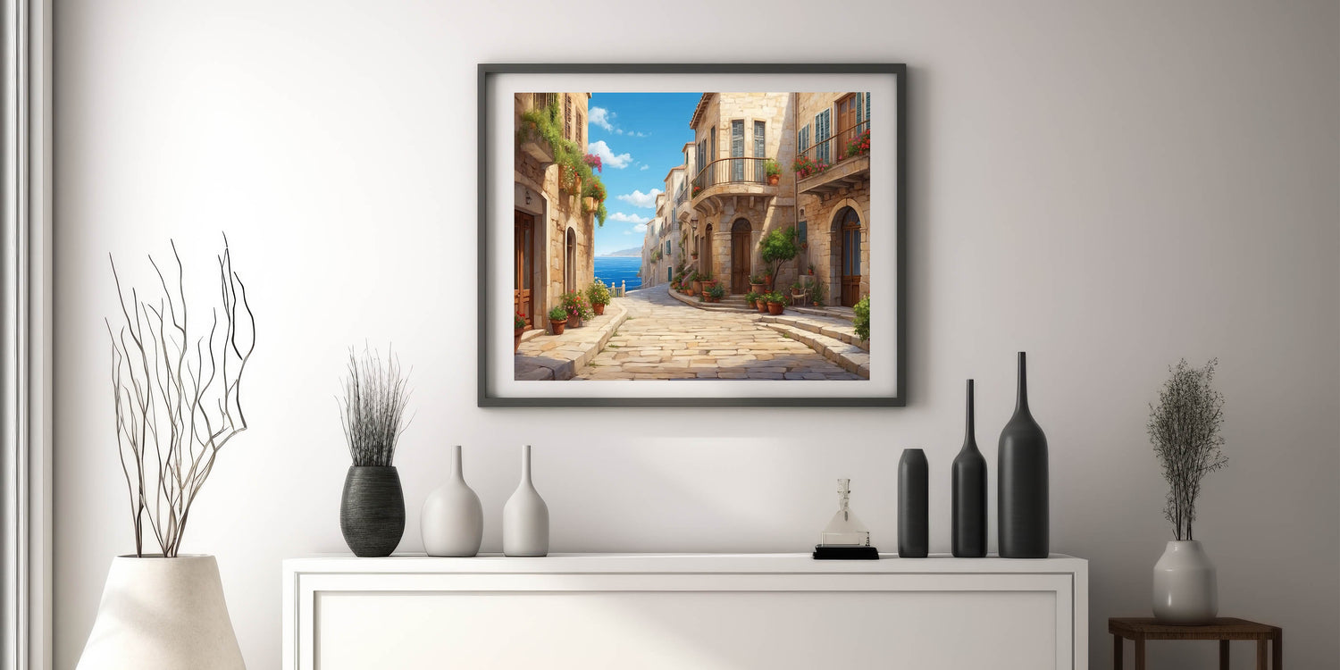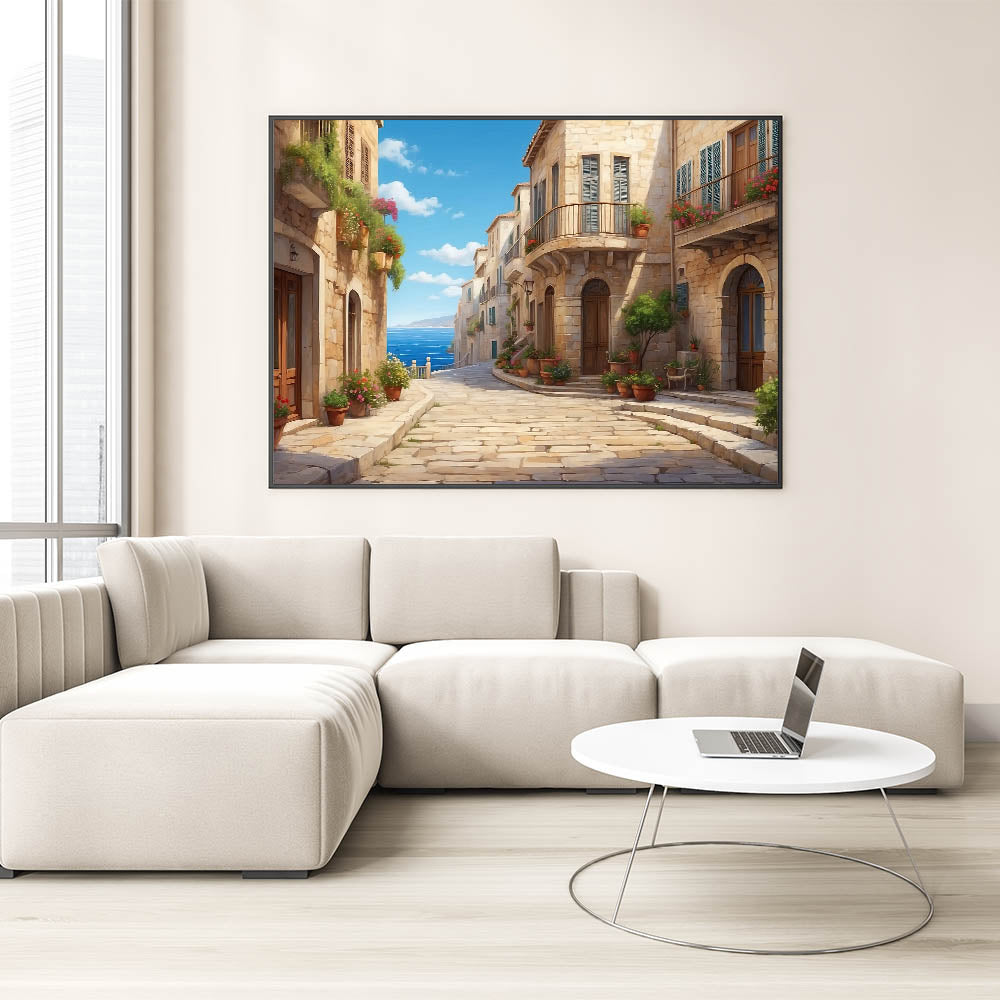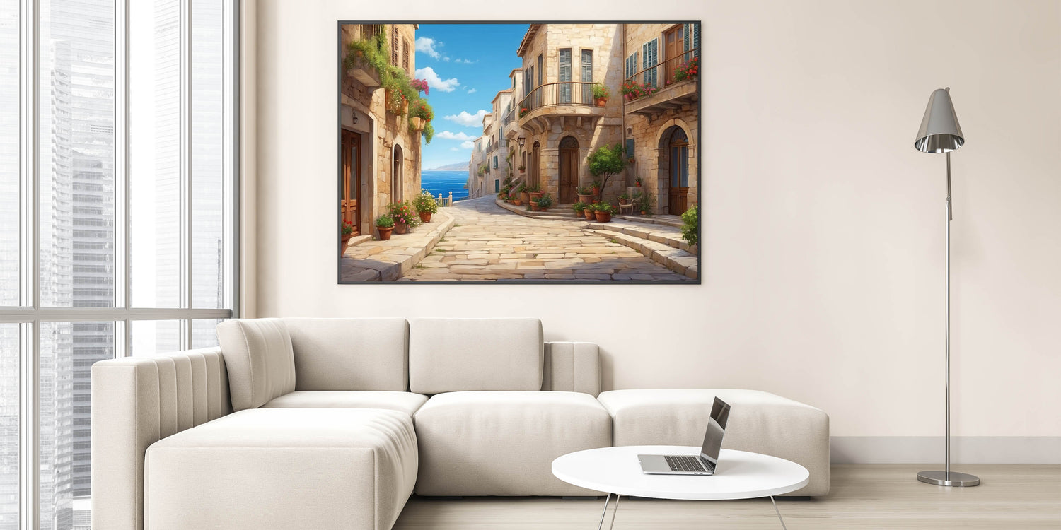 Transport yourself to a tranquil Mediterranean coastal village with this Charming Seaside Village Art Print. This artwork captures the serene beauty of a sunlit stone street, where rustic buildings adorned with vibrant flowers overlook the sparkling blue sea. The peaceful ambiance, combined with the warm, earthy tones of the architecture, creates a scene that invites relaxation and daydreaming.