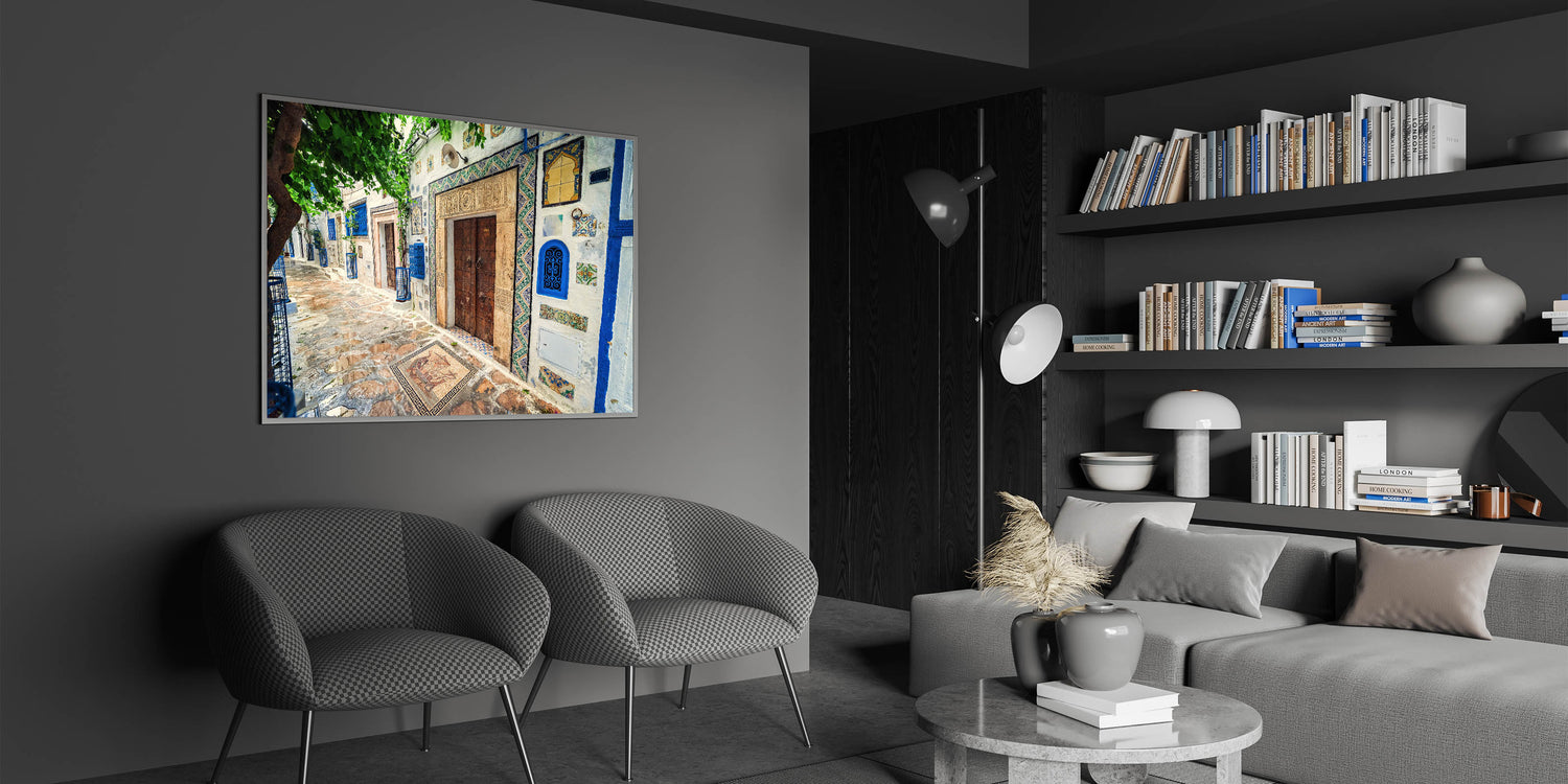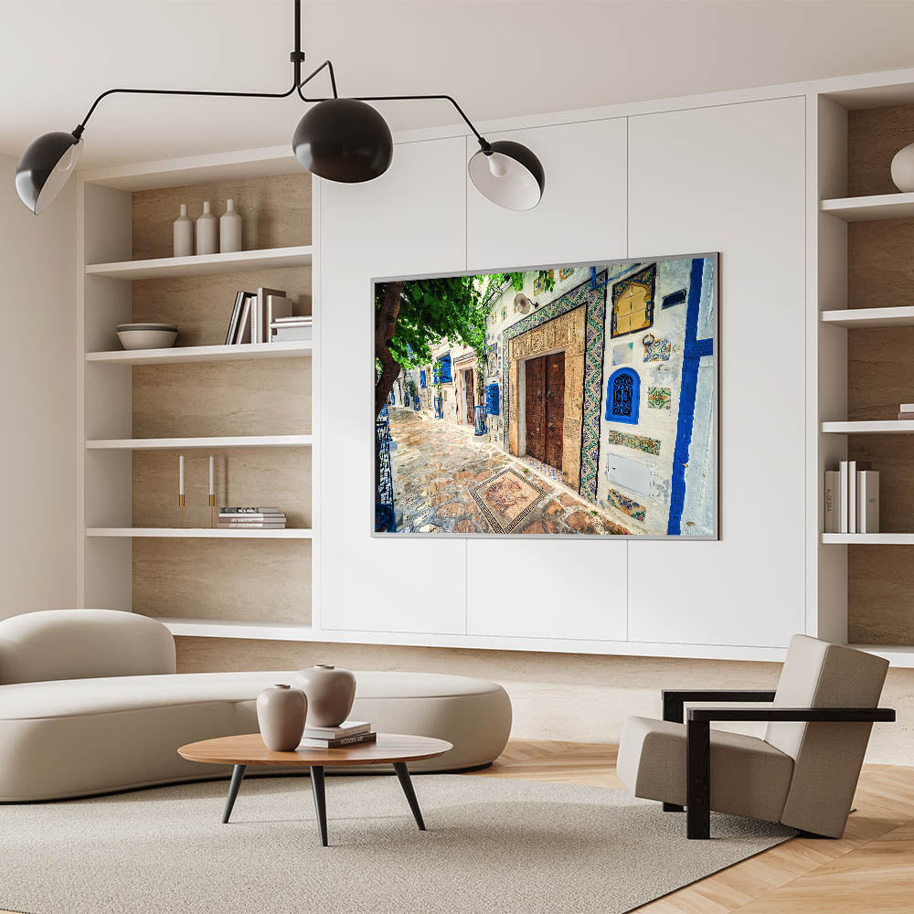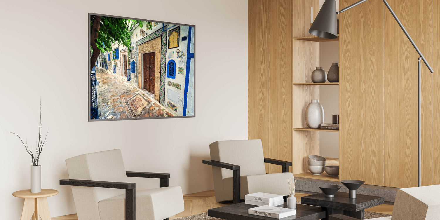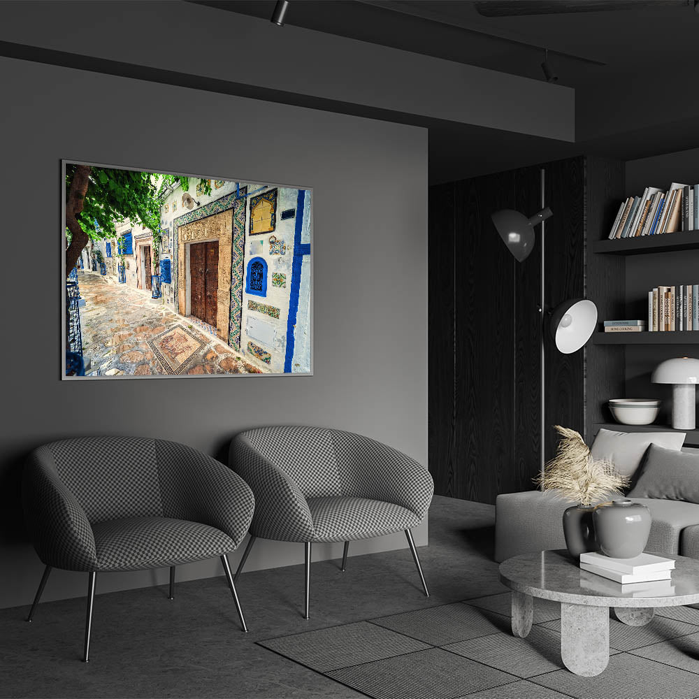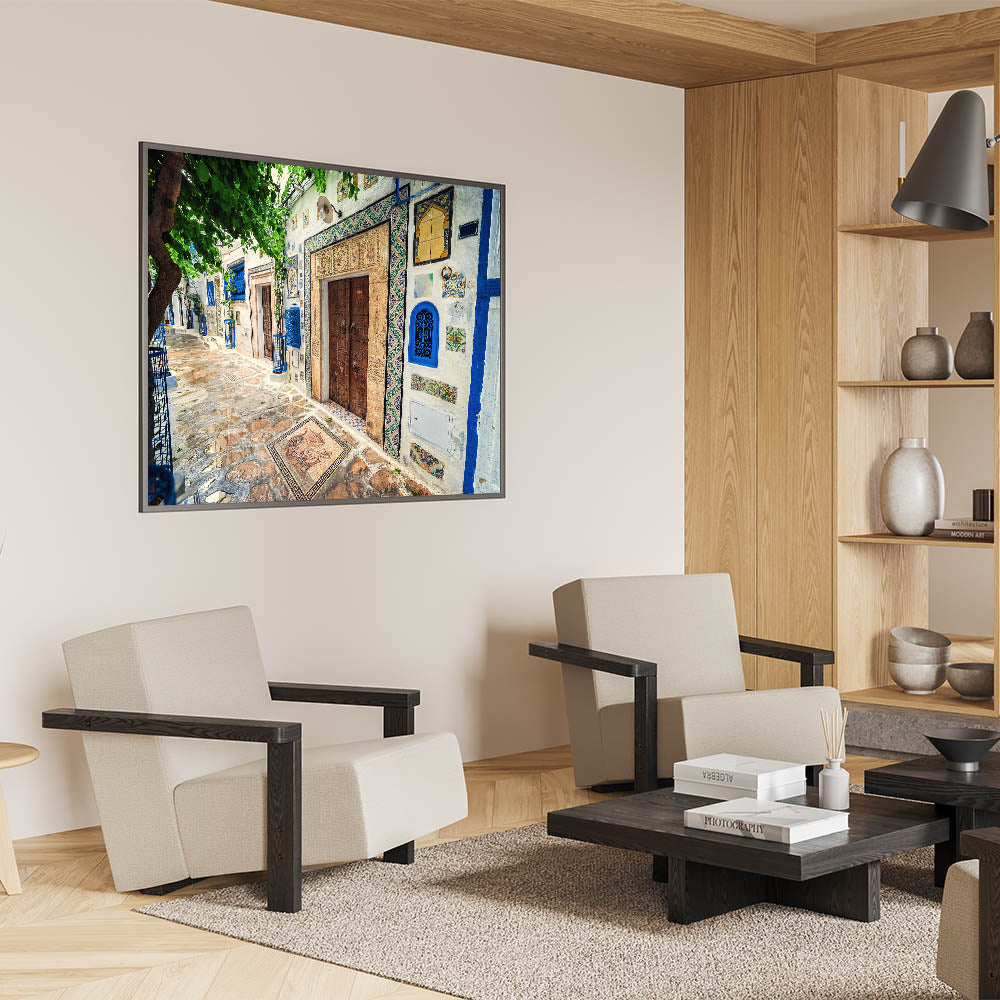 - High-quality print capturing the vivid colors and detailed tilework of Tunisian streets.