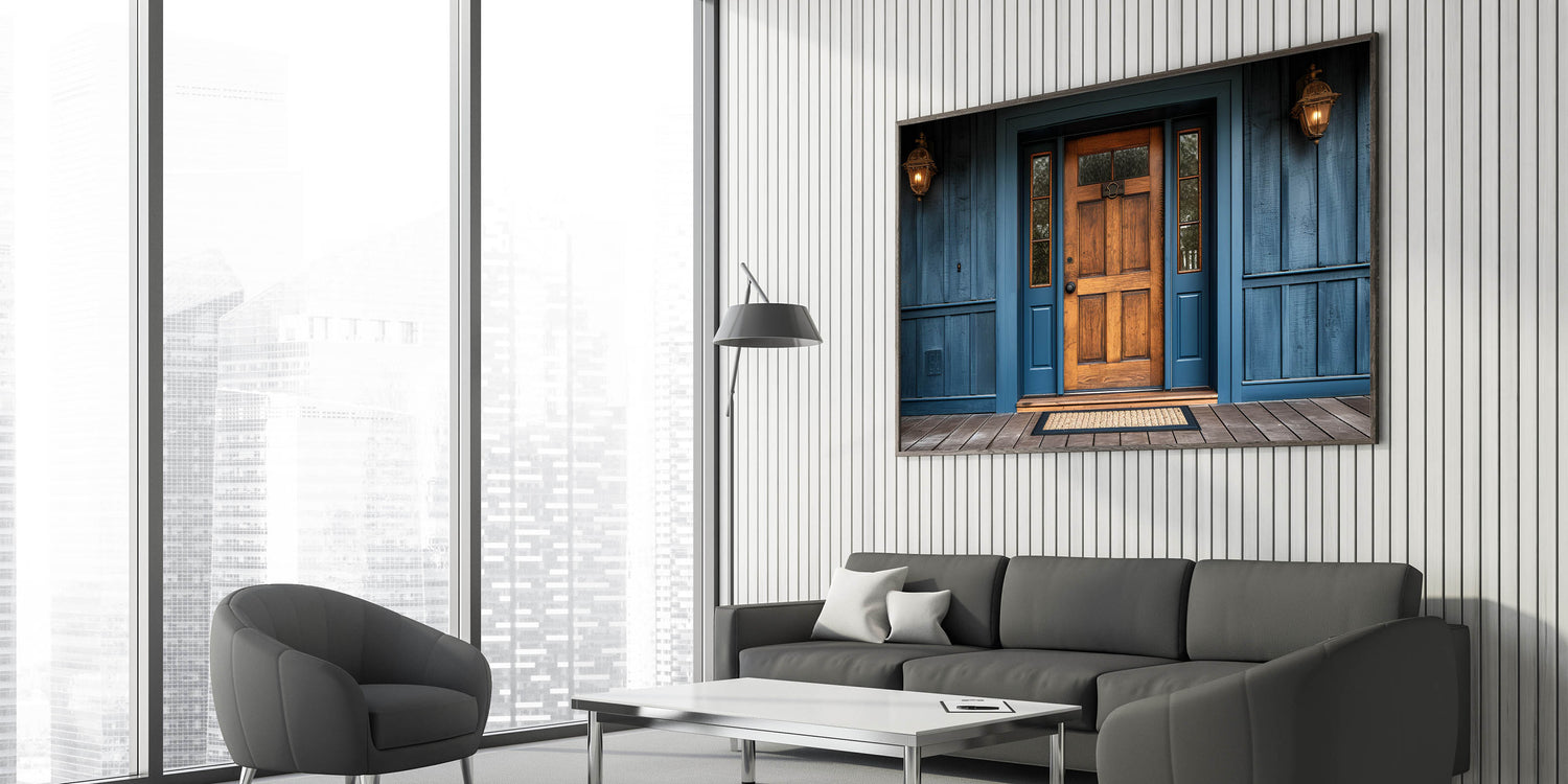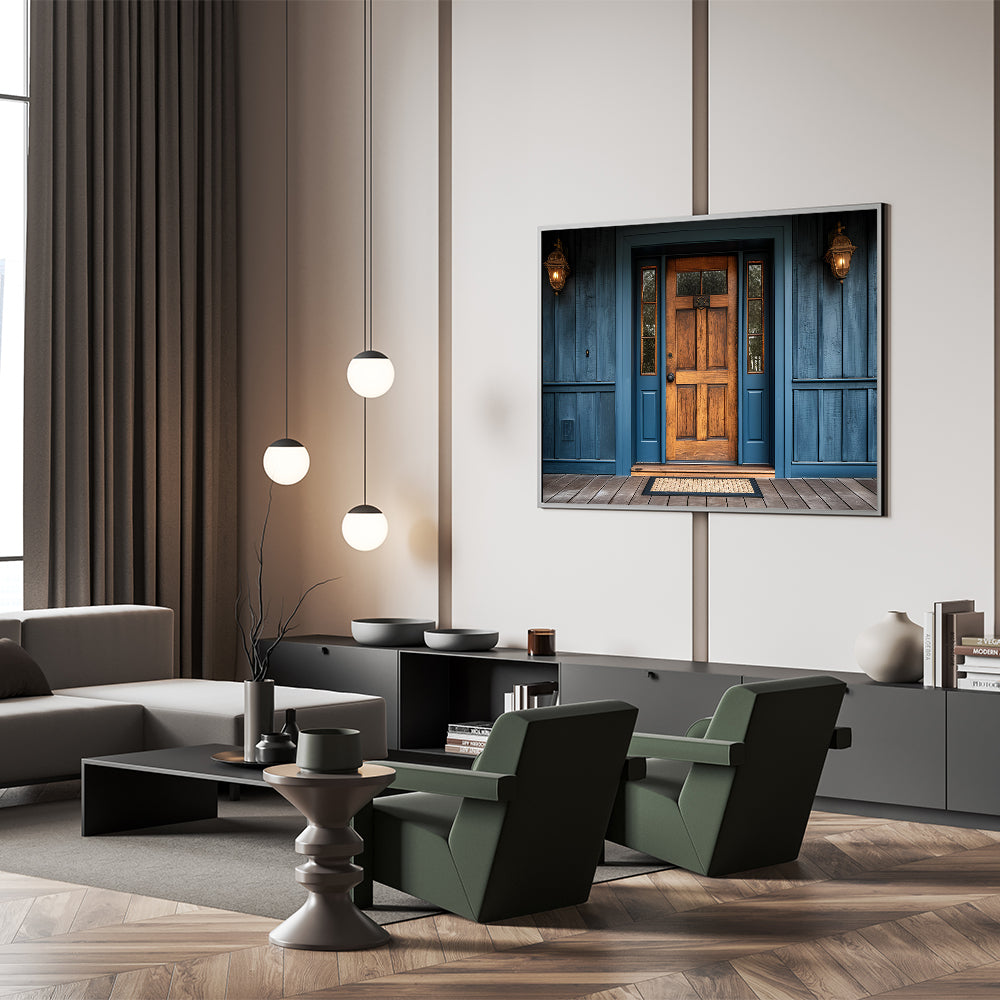 Enhance the warmth and charm of your space with this "Classic Wooden Door Wall Art." This artwork features a beautifully crafted wooden door, set against a deep blue exterior with rustic lanterns adding a touch of vintage elegance. The rich wood tones of the door contrast perfectly with the cool blue walls, creating a welcoming and timeless aesthetic. This piece is ideal for those who appreciate the blend of rustic and classic architectural styles, making it a perfect addition to any home or office decor.