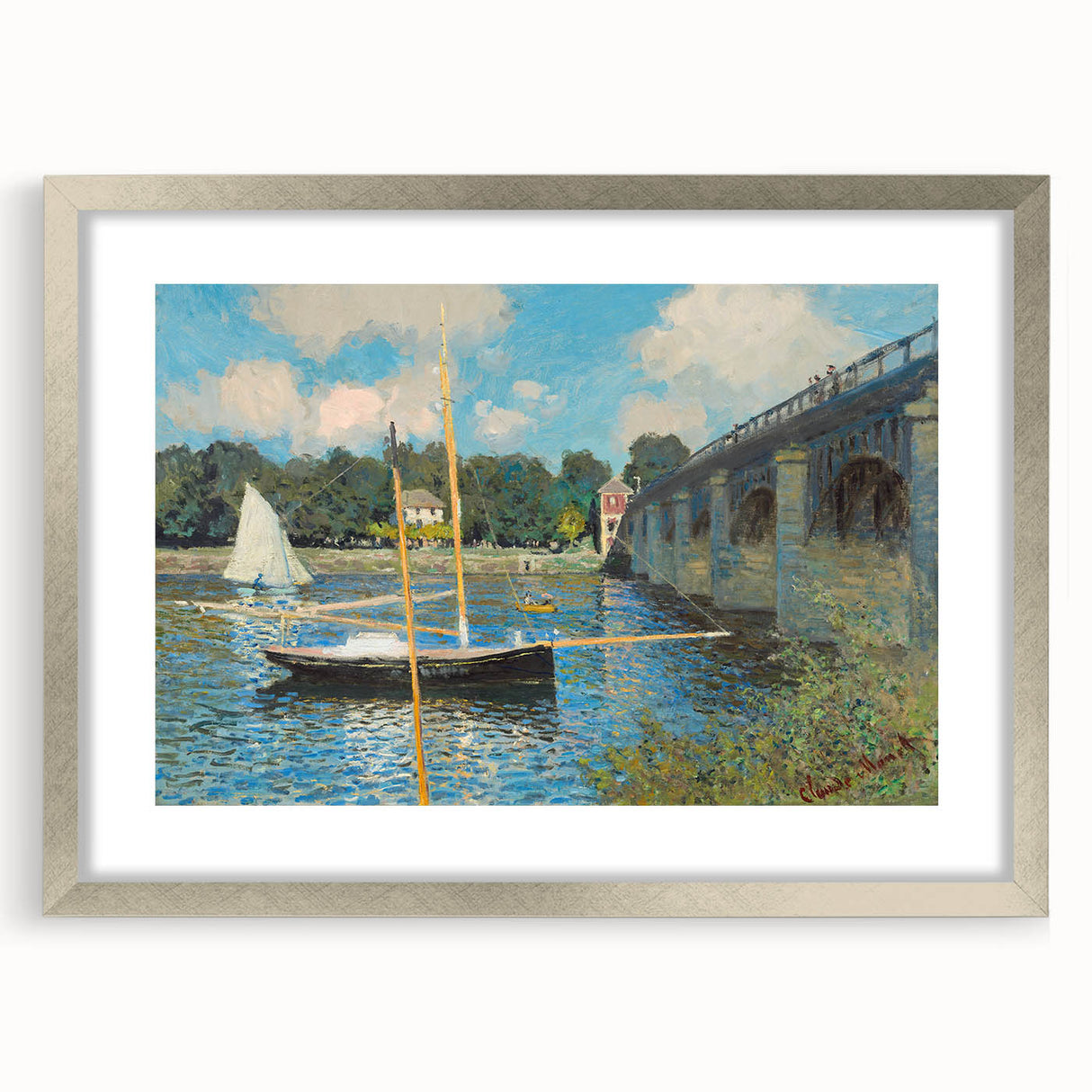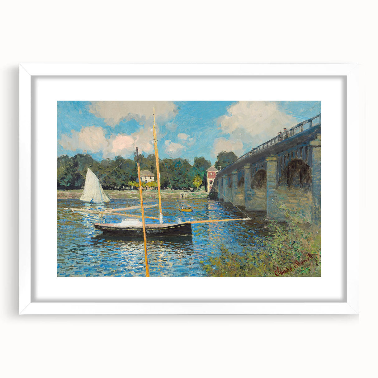 Capture the tranquility of Claude Monet's iconic "The Bridge at Argenteuil, 1874." This stunning Impressionist masterpiece showcases a serene scene of sailboats gently floating on the water beneath the bridge, with reflections of the clear blue sky shimmering on the surface. The play of light and color in this painting is characteristic of Monet's style, bringing life to the peaceful setting. Perfect for anyone looking to add a piece of Impressionist art to their décor, this artwork brings a calm, refined aesthetic to any room.