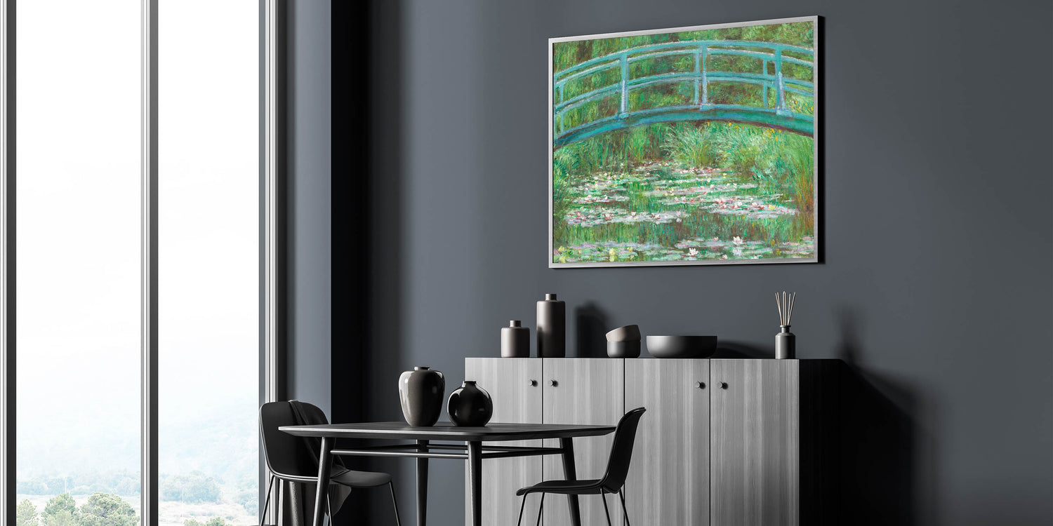 Add a touch of elegance and tranquility to your home with Claude Monet's iconic painting, "The Japanese Footbridge, 1899." This Impressionist masterpiece captures the serene beauty of Monet's garden at Giverny, with its famous Japanese footbridge spanning a lush water lily pond. The soft greens and blues create a calming atmosphere, while Monet’s signature brushstrokes bring the scene to life. This artwork is perfect for those who appreciate Monet's nature-inspired landscapes and are looking to add a timeless piece to their décor.