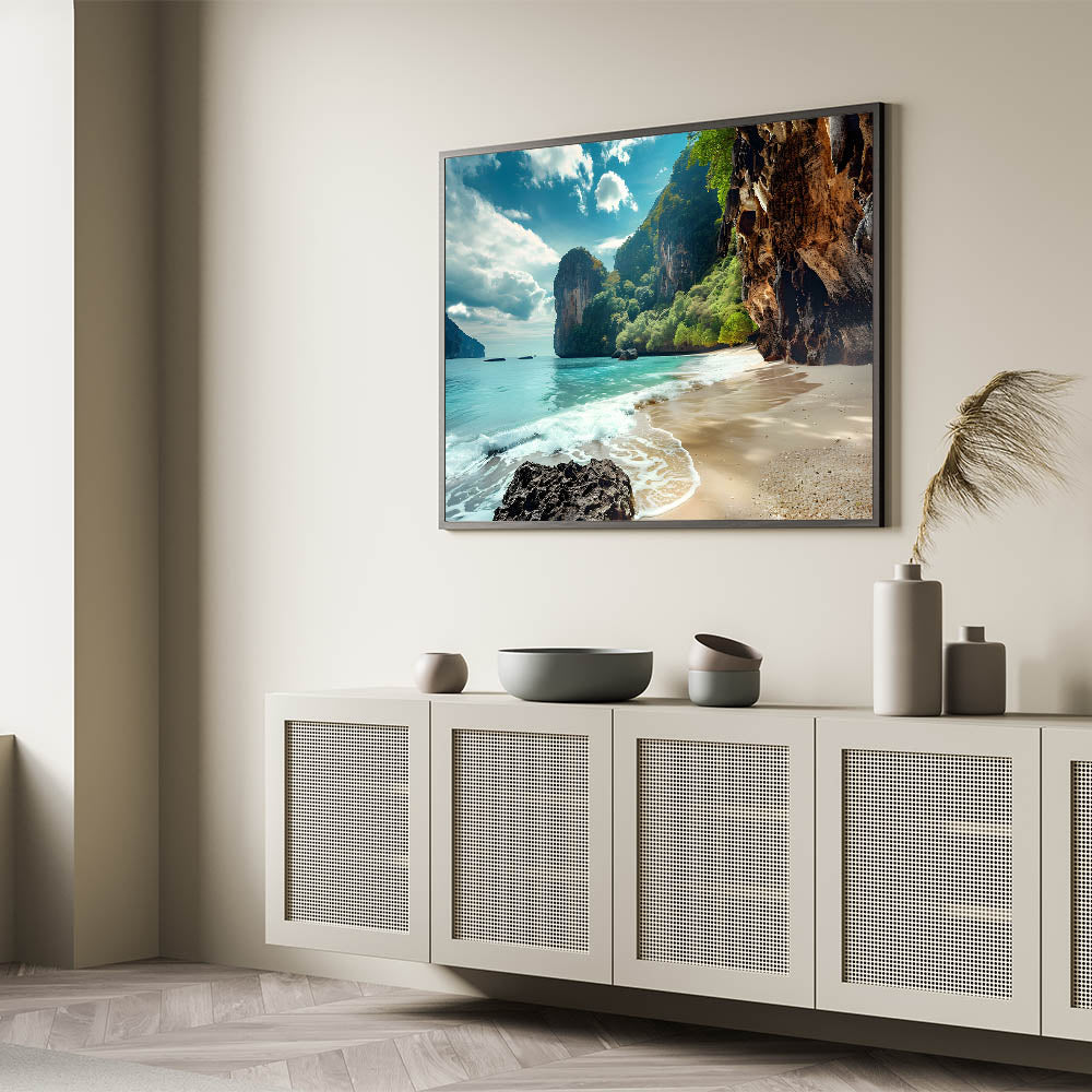 Bring the awe-inspiring beauty of nature into your home with our Cliffside Beach Serenity Wall Art. This stunning piece captures a tranquil beach framed by towering cliffs and lush greenery, with the gentle waves lapping at the shore under a dramatic sky. The intricate details and vivid colors of this artwork make it a perfect addition to any room, creating a peaceful retreat that reflects the natural beauty of coastal landscapes.