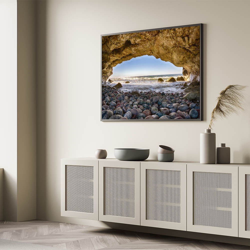 Discover the hidden beauty of Newfoundland’s coastline with this stunning cave view wall art. Featuring a serene scene of ocean waves gently rolling onto a pebble-covered shore, framed by the rugged arch of a natural cave, this artwork brings a sense of calm and connection to nature. Perfect for lovers of unique coastal landscapes, this piece captures the untouched beauty of Newfoundland’s hidden treasures.