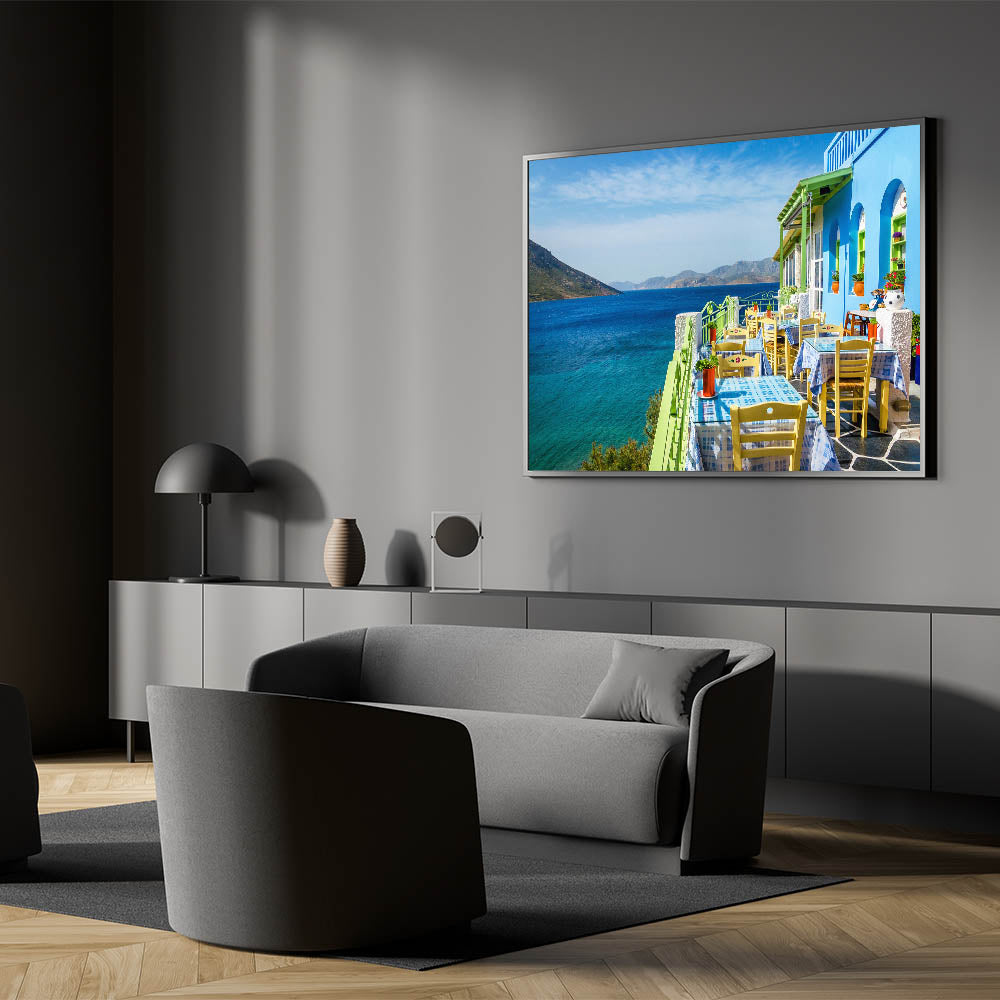 Experience the charm of Cyprus with our "Seaside Café Canvas Art," featuring a picturesque café overlooking the crystal-clear waters of the Mediterranean. This piece is a vibrant addition to our Cyprus Scenery By Region collection, perfect for anyone seeking to bring a slice of coastal life into their home.