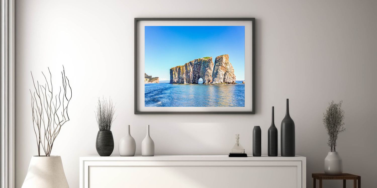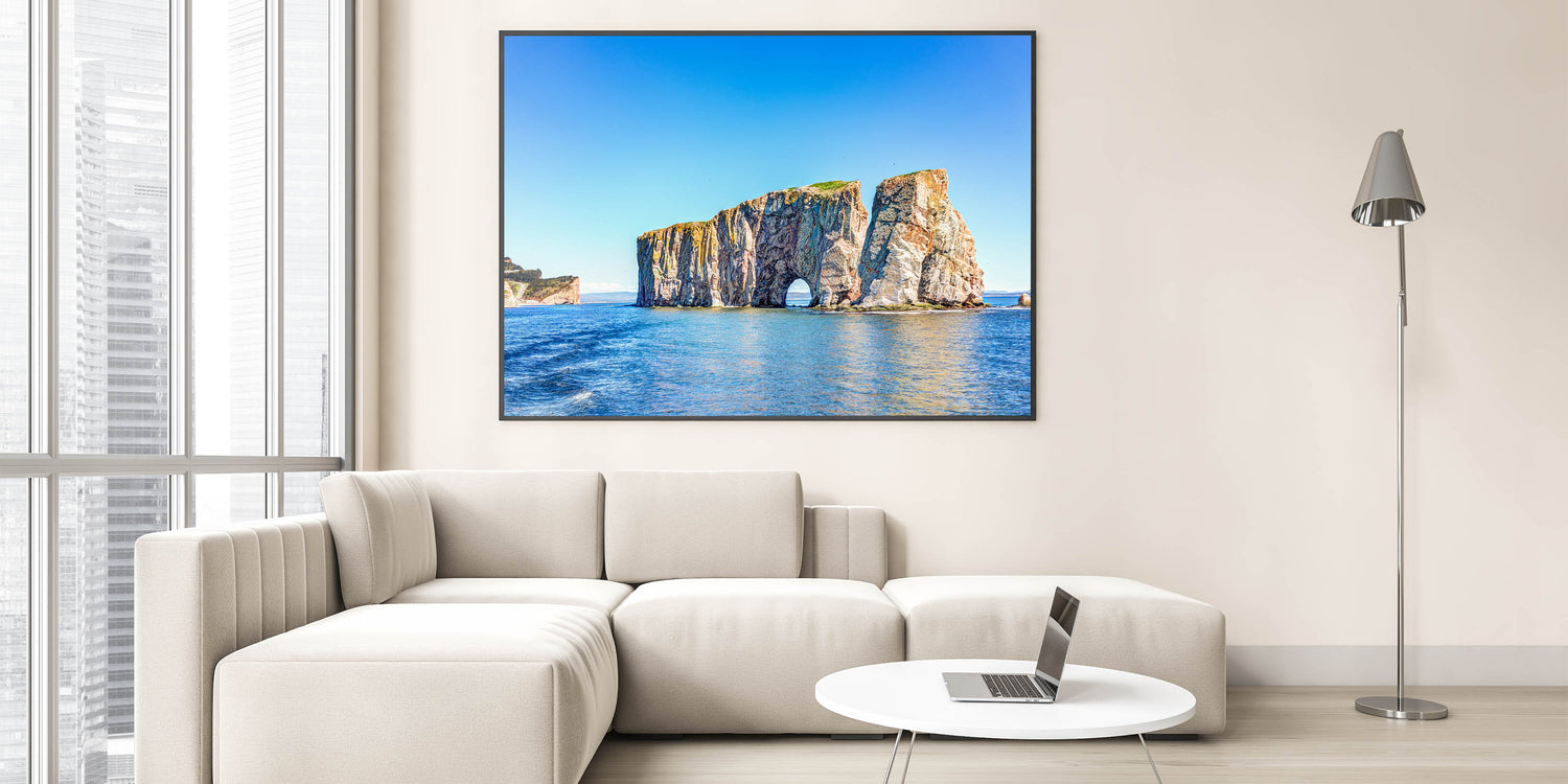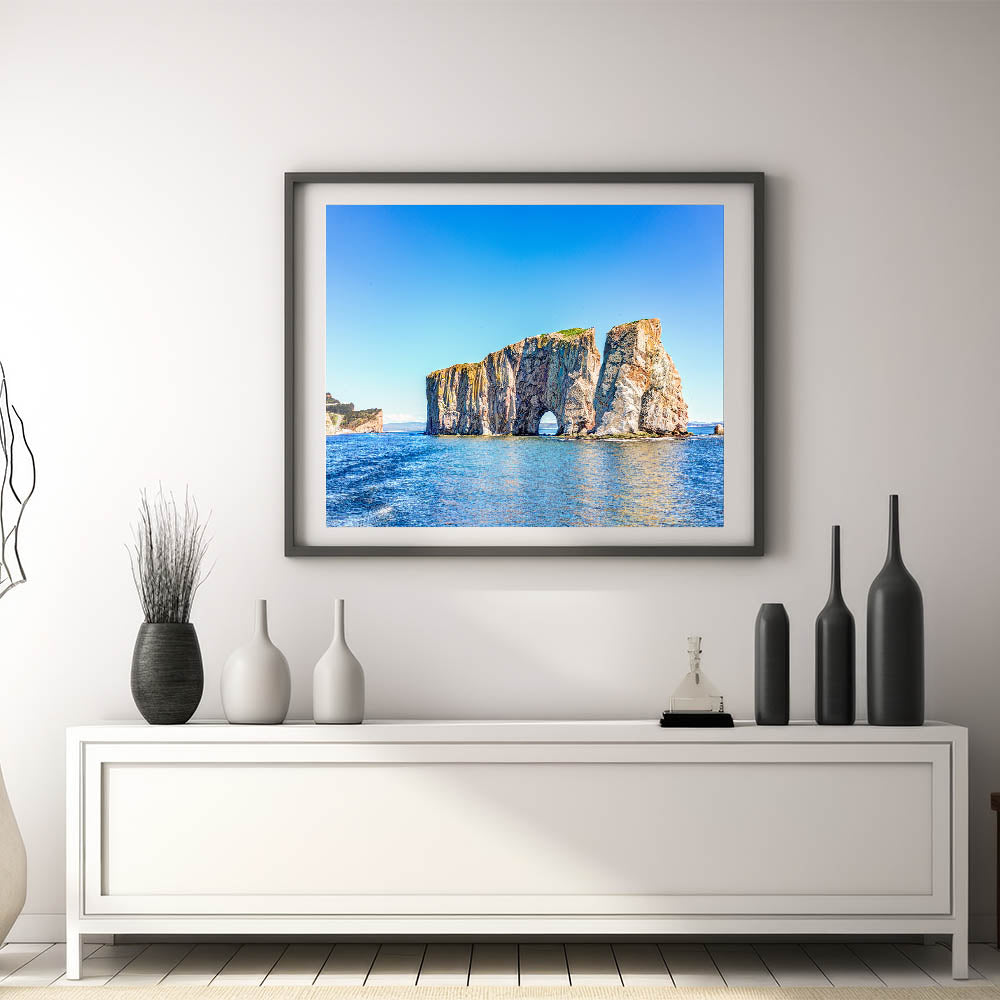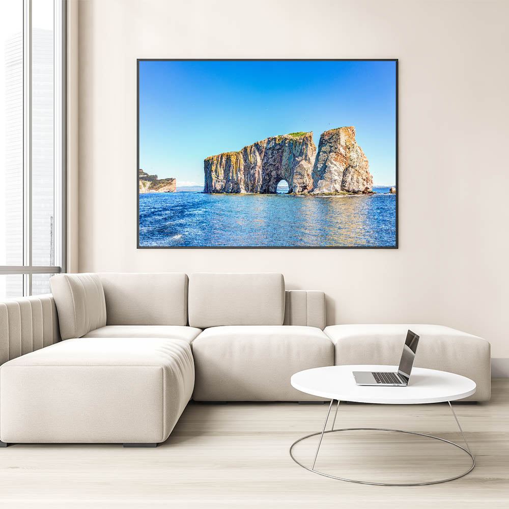 Bring the beauty of the coast into your home with this stunning wall art featuring a magnificent rock arch rising from the serene blue waters. The vivid contrast between the vibrant blues of the ocean and sky and the earthy tones of the rock formations creates a breathtaking scene that captures the essence of nature's raw beauty. Perfect for adding a touch of coastal charm to any room, this artwork will transport you to the tranquil shores every time you look at it.
