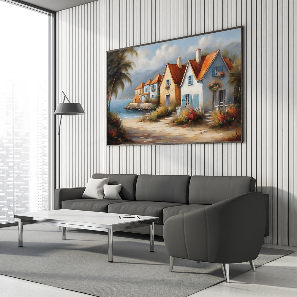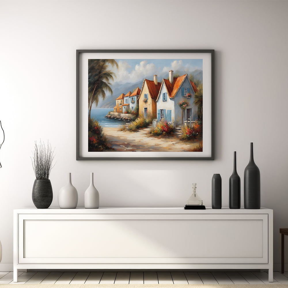 This coastal village art is more than just a decor piece; it’s an invitation to escape to a charming seaside retreat. Perfect for those who appreciate coastal decor and are looking for house decor ideas that blend vibrant color with serene beauty.
