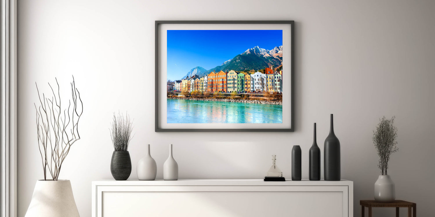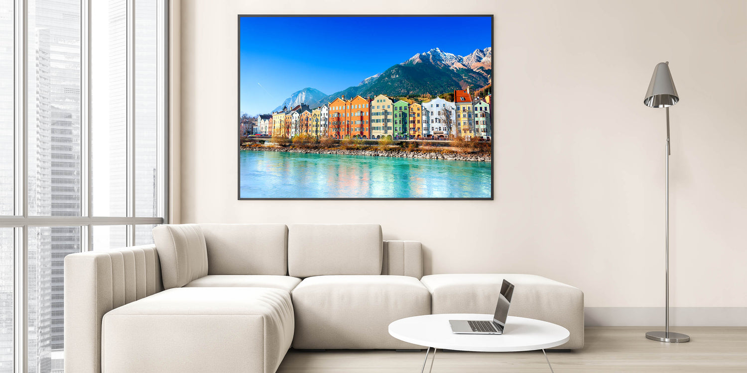 This Idyllic village canvas print invites you to enjoy the harmonious blend of vibrant architecture and natural beauty, making it an ideal piece for those who appreciate colorful landscapes and dynamic scenes. Let this artwork bring energy and scenic beauty to your space.