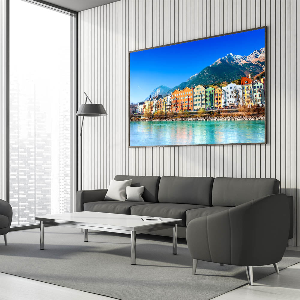 Brighten your space with the vibrant charm of a colorful riverside village set against a backdrop of majestic mountains in this stunning Village landscape painting. The scene features rows of brightly colored buildings reflecting in the serene waters of the river, with towering mountains providing a breathtaking natural frame. This Village scene wall decor perfectly captures the lively atmosphere and scenic beauty of this idyllic location, making it a standout piece in any room.