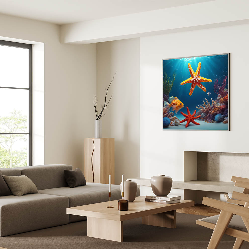 Dive into the vibrant underwater world of Seychelles with this striking ocean scene wall art. Featuring bright starfish, colorful coral, and tropical marine life, this Seychelles wall art brings the beauty of the ocean into your home. The rich blues of the water contrast with the vibrant orange of the starfish, creating a bold and exotic aesthetic perfect for tropical island decor.