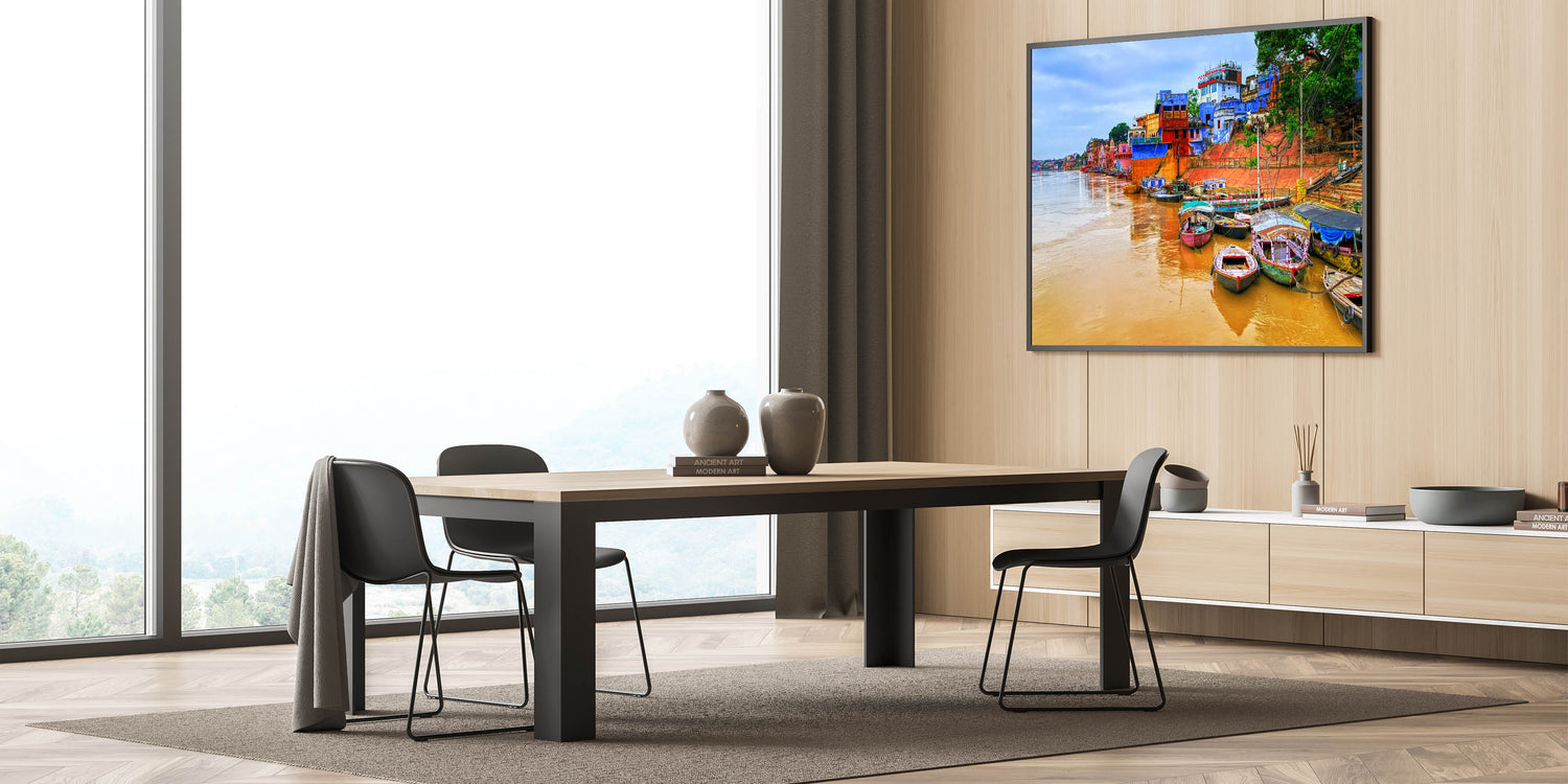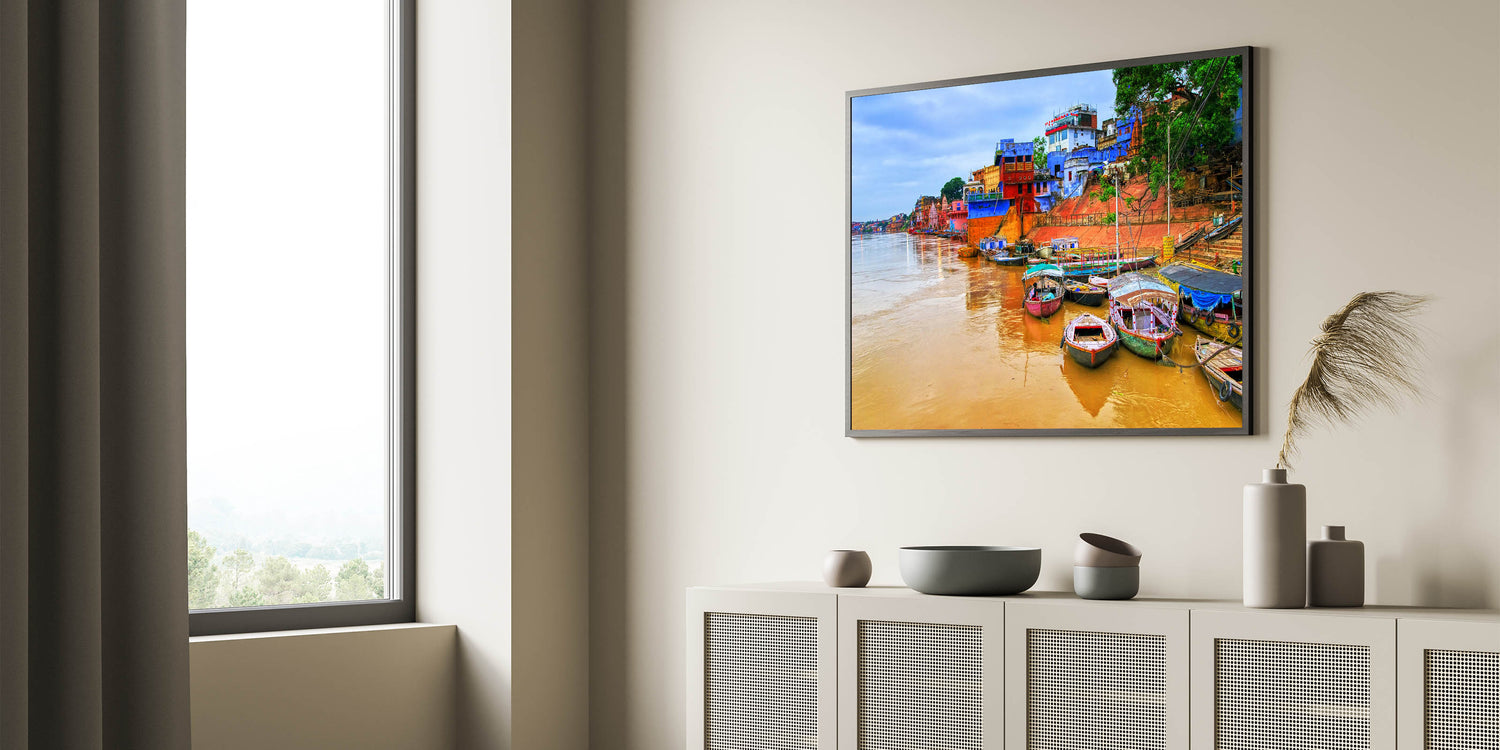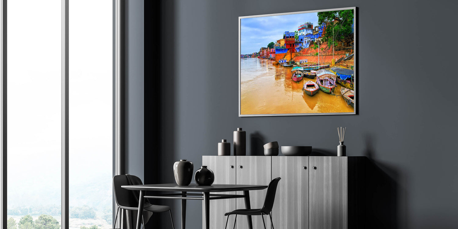 This Indian landscape wall art is perfect for those who admire the vibrancy and spirituality of India. The colorful buildings and boats make this piece a captivating focal point, ideal for adding life and energy to your space.