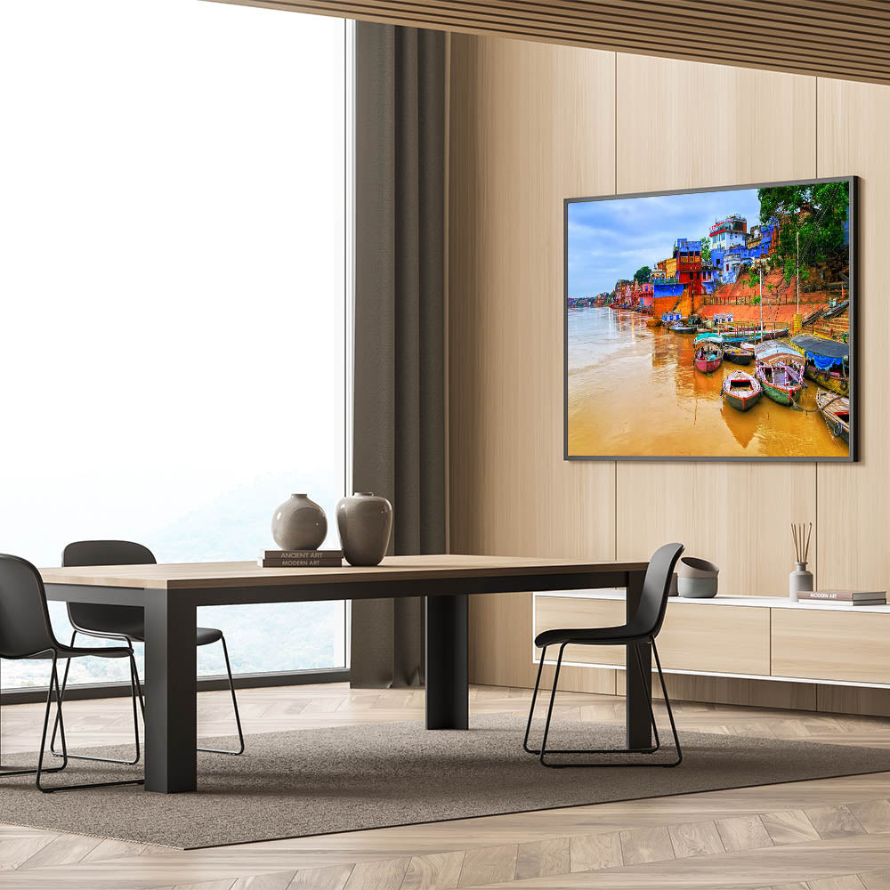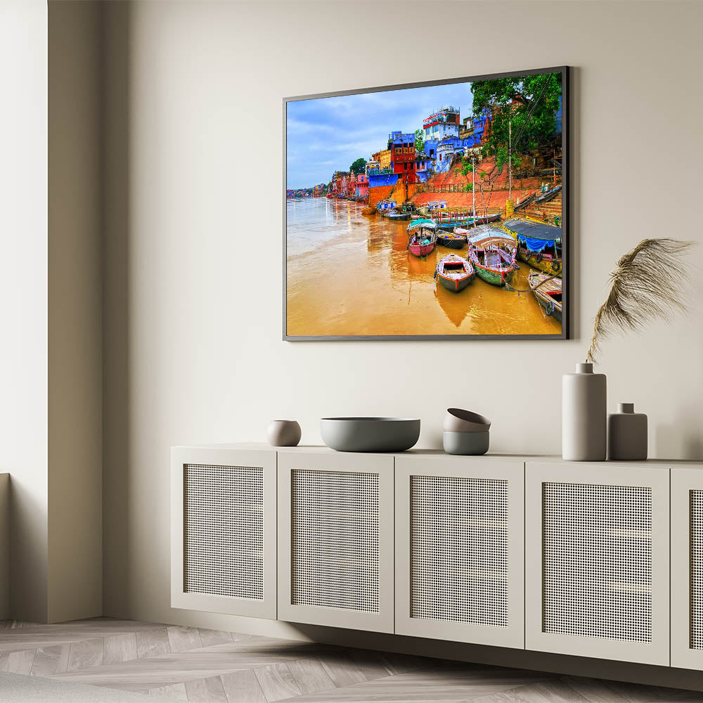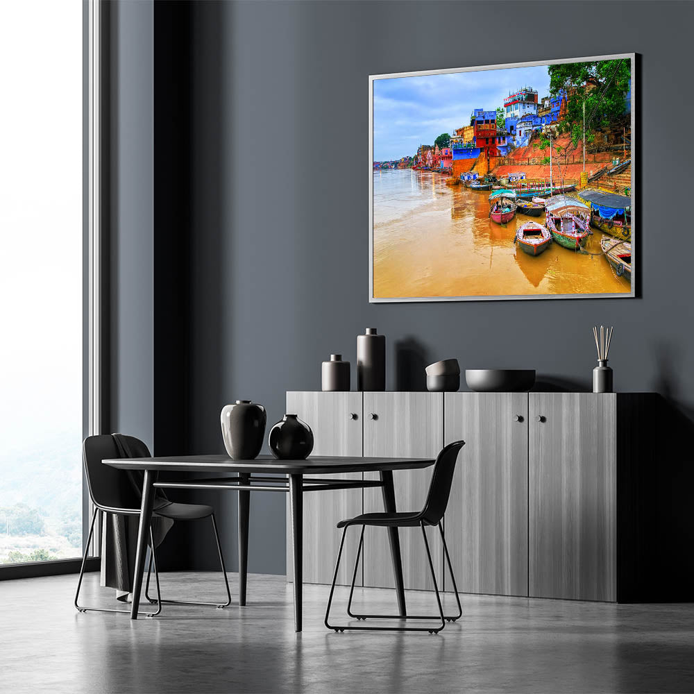 Bring the lively and colorful energy of Varanasi Riverside into your home with this stunning Scenic Ganges River Wall Art. This vibrant canvas print captures the famous ghats of Varanasi, where colorful buildings, boats, and the peaceful flow of the Ganges River come together to create a captivating and iconic scene. The vibrant reds, blues, and earthy tones of the riverside architecture, along with the calm river, make this piece perfect for adding a cultural and artistic touch to any room.