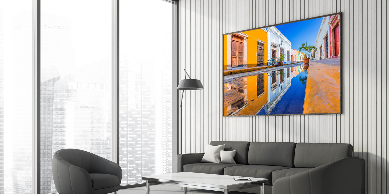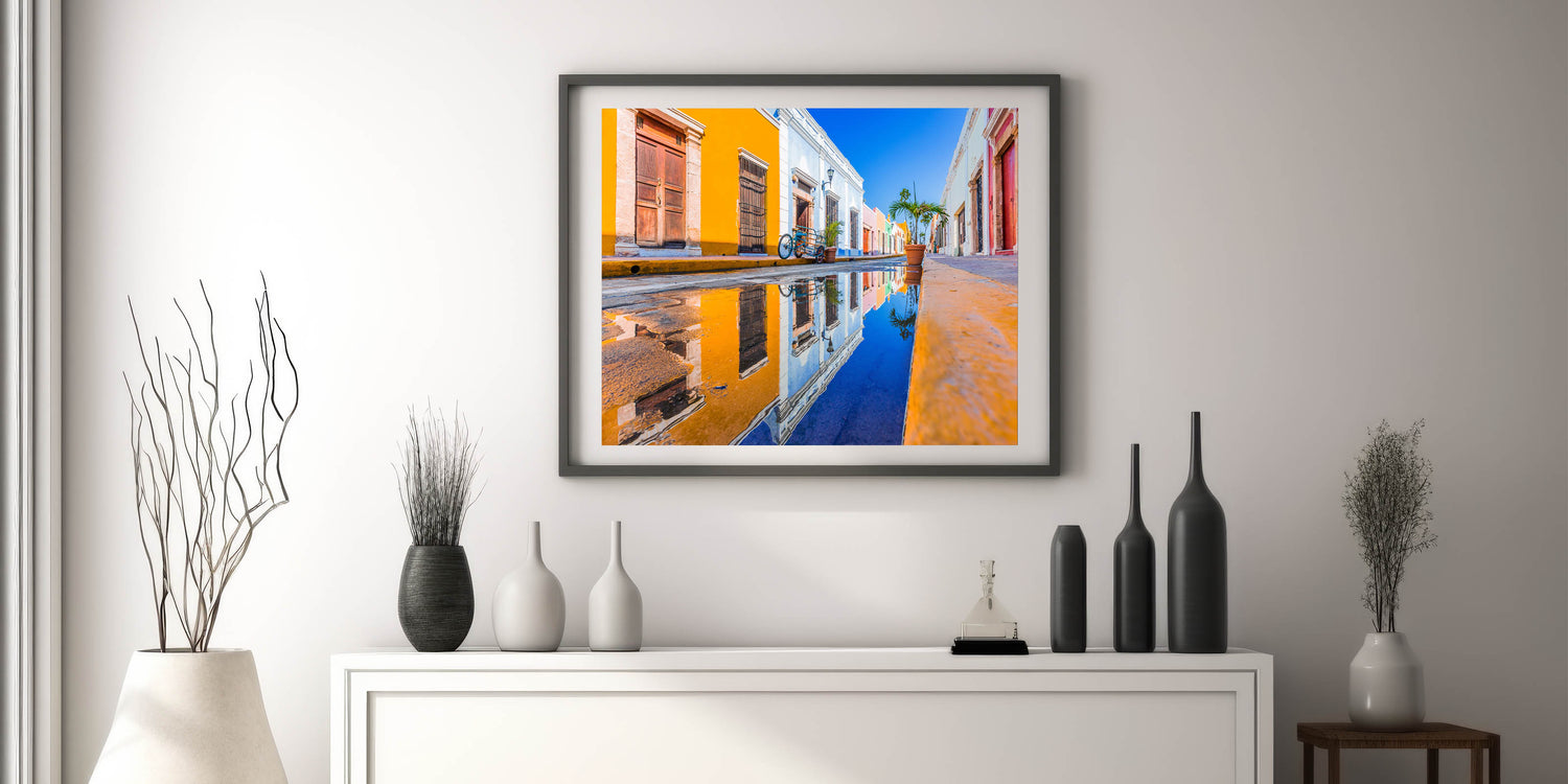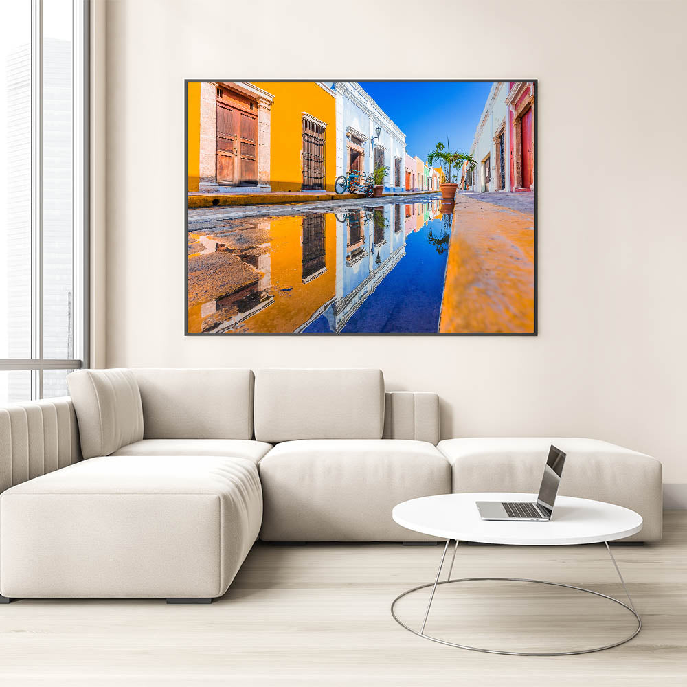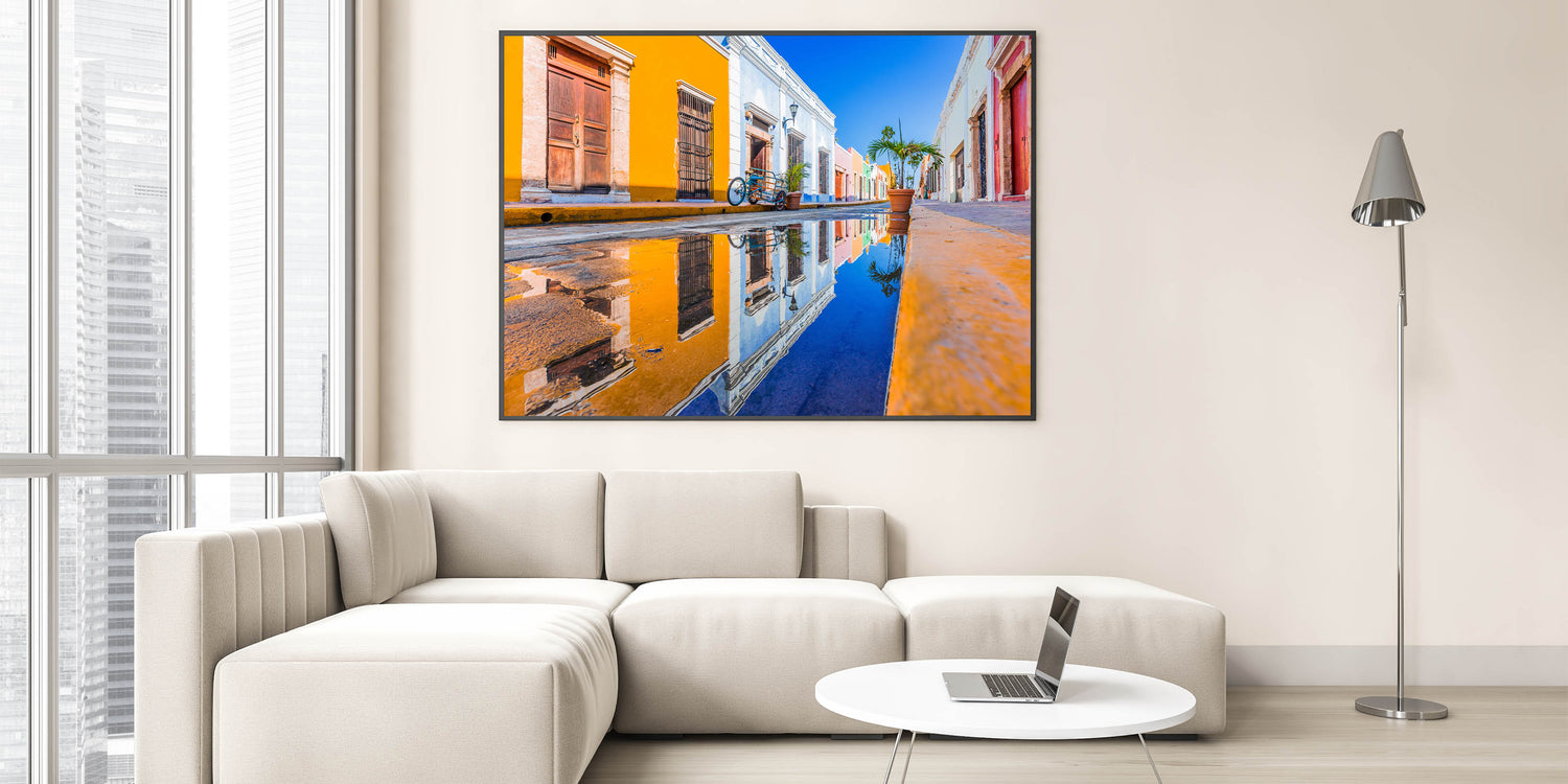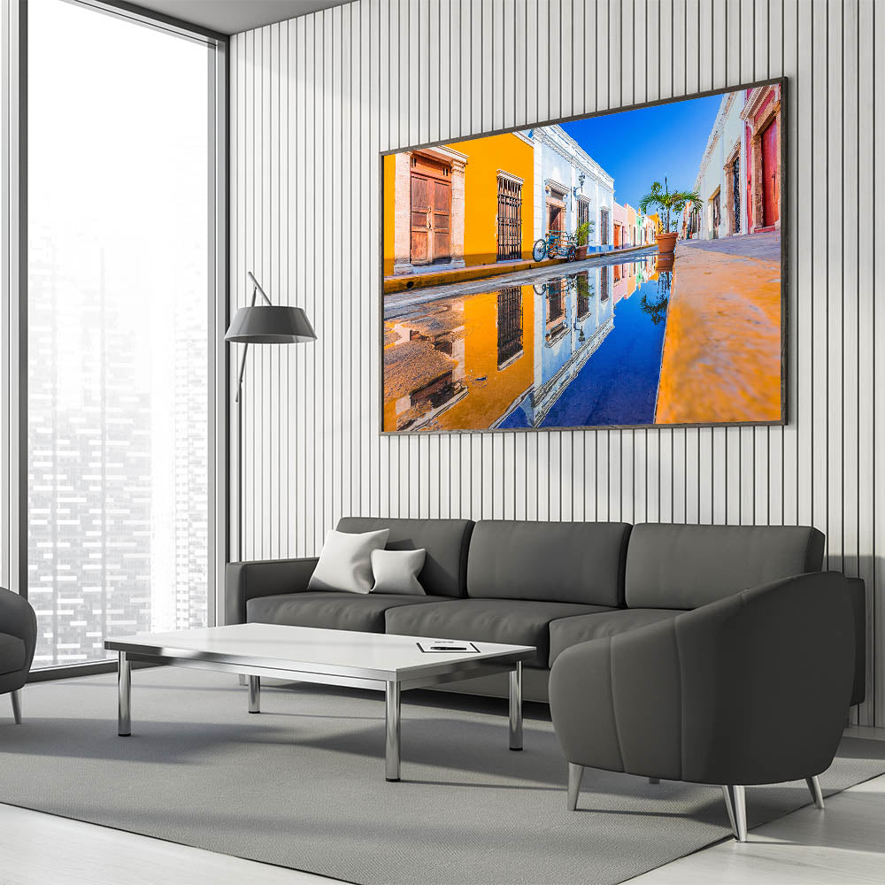 Add a pop of color to your home with this striking wall art featuring a vibrant Yucatan street scene. Captured after a rainfall, the colorful facades of historic buildings are reflected beautifully in a puddle, highlighting the charm and culture of the Yucatan Peninsula. This Yucatan canvas art piece is perfect for lovers of Mexican cultural art and those seeking bold, lively decor.