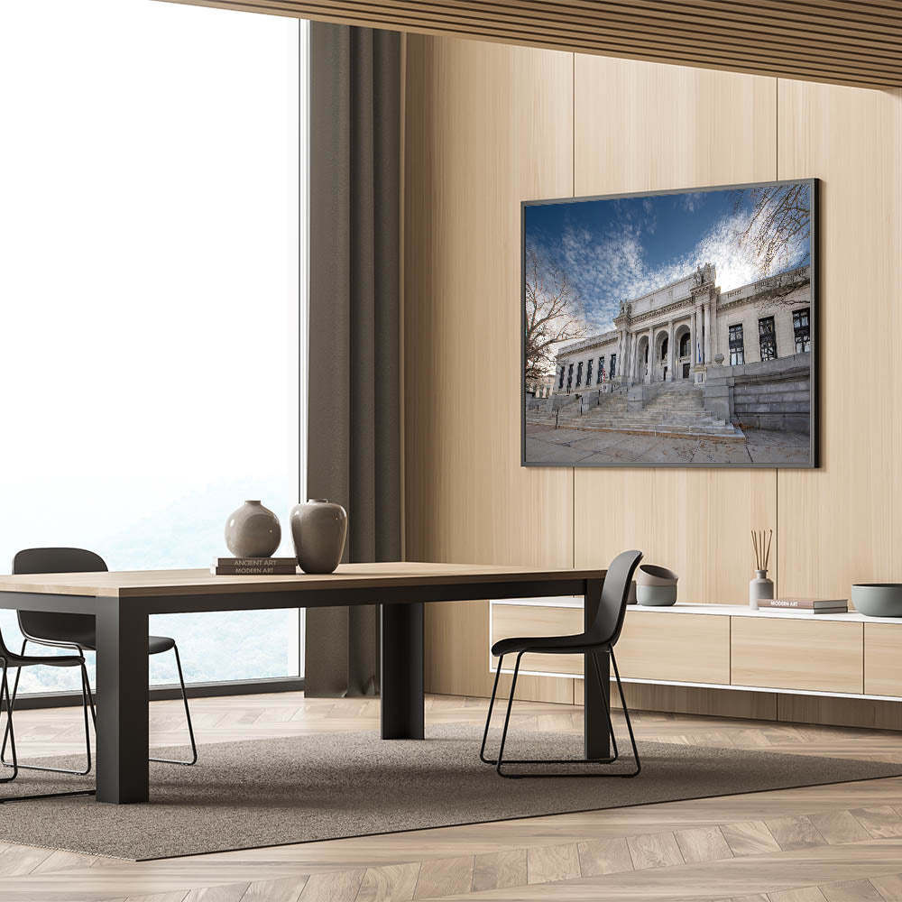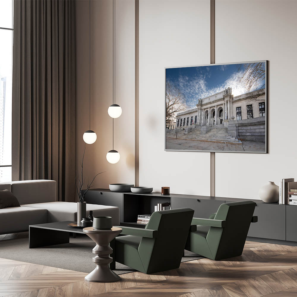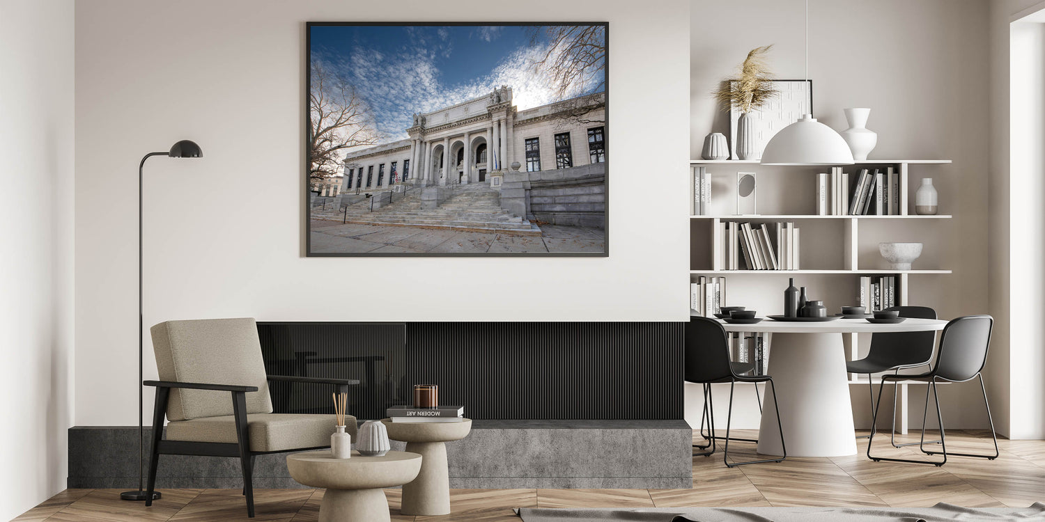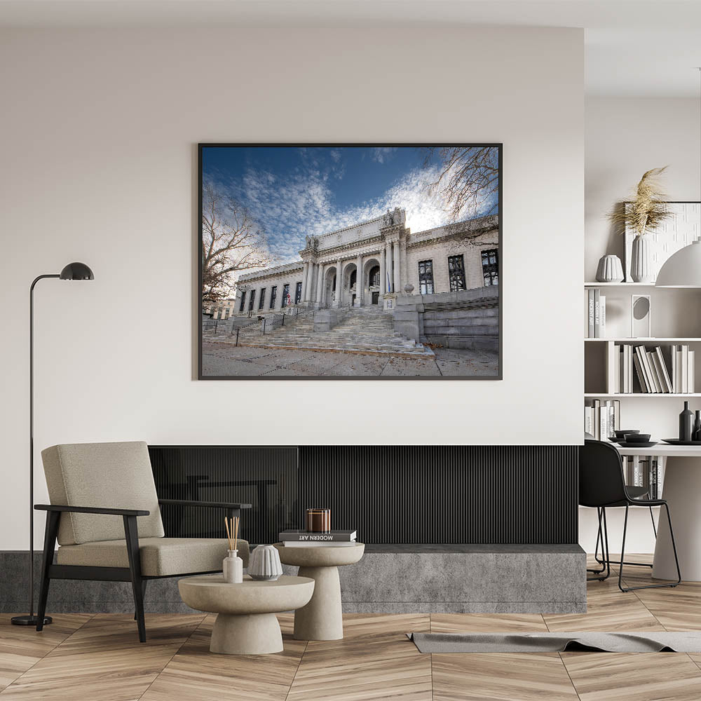 This elegant Connecticut art print captures the grandeur of a historic courthouse building, showcasing its classical columns and intricate architectural details. The imposing structure, set against a sky dotted with soft clouds, reflects the timeless beauty of traditional design. The stairs leading up to the grand entrance invite the viewer to appreciate the craftsmanship of this iconic building, making it a perfect piece for architecture lovers and history enthusiasts.
