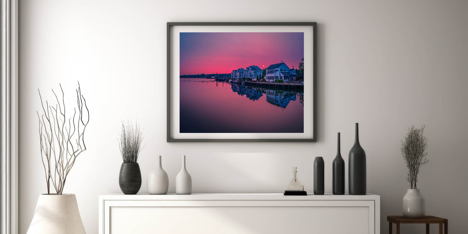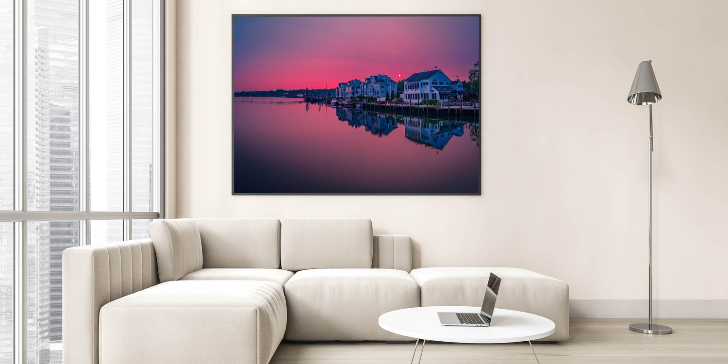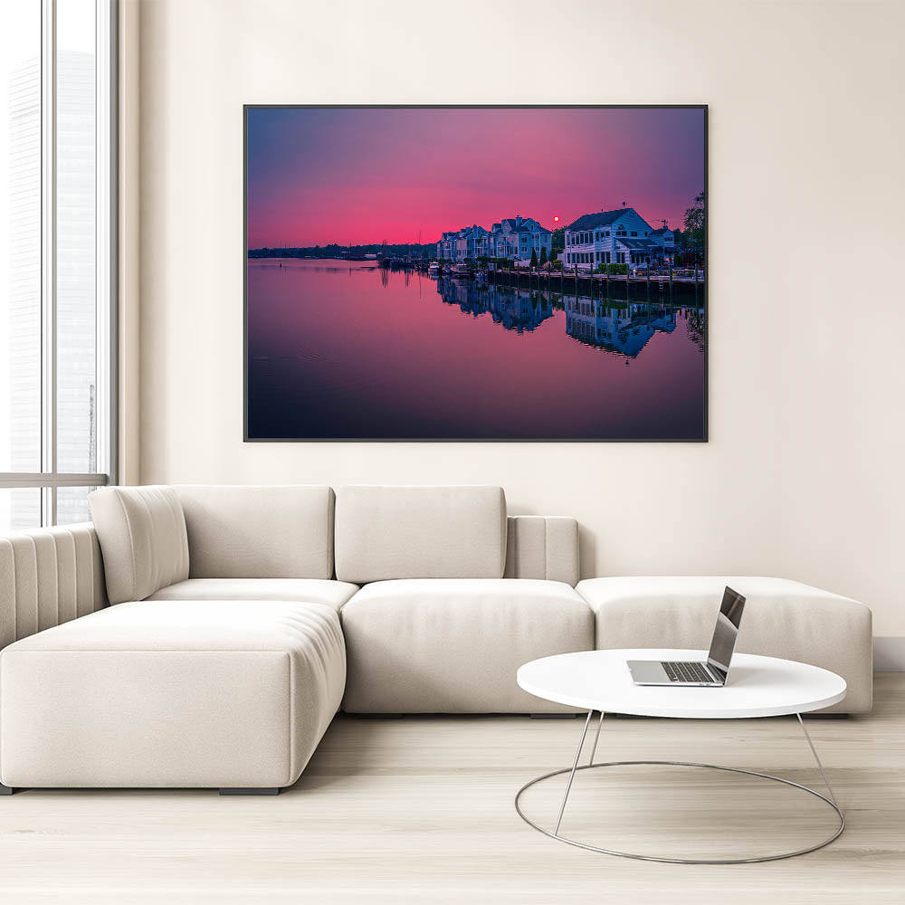 This stunning Connecticut wall art captures the beauty of a peaceful waterfront at sunset, with vibrant pink and purple hues reflected in the calm water. The houses along the shoreline and their perfect reflections add a sense of balance and tranquility to this scenic view. The setting sun in the distance completes the scene, casting a soft glow over the entire landscape. This artwork is perfect for those who appreciate the calm and beauty of coastal living.