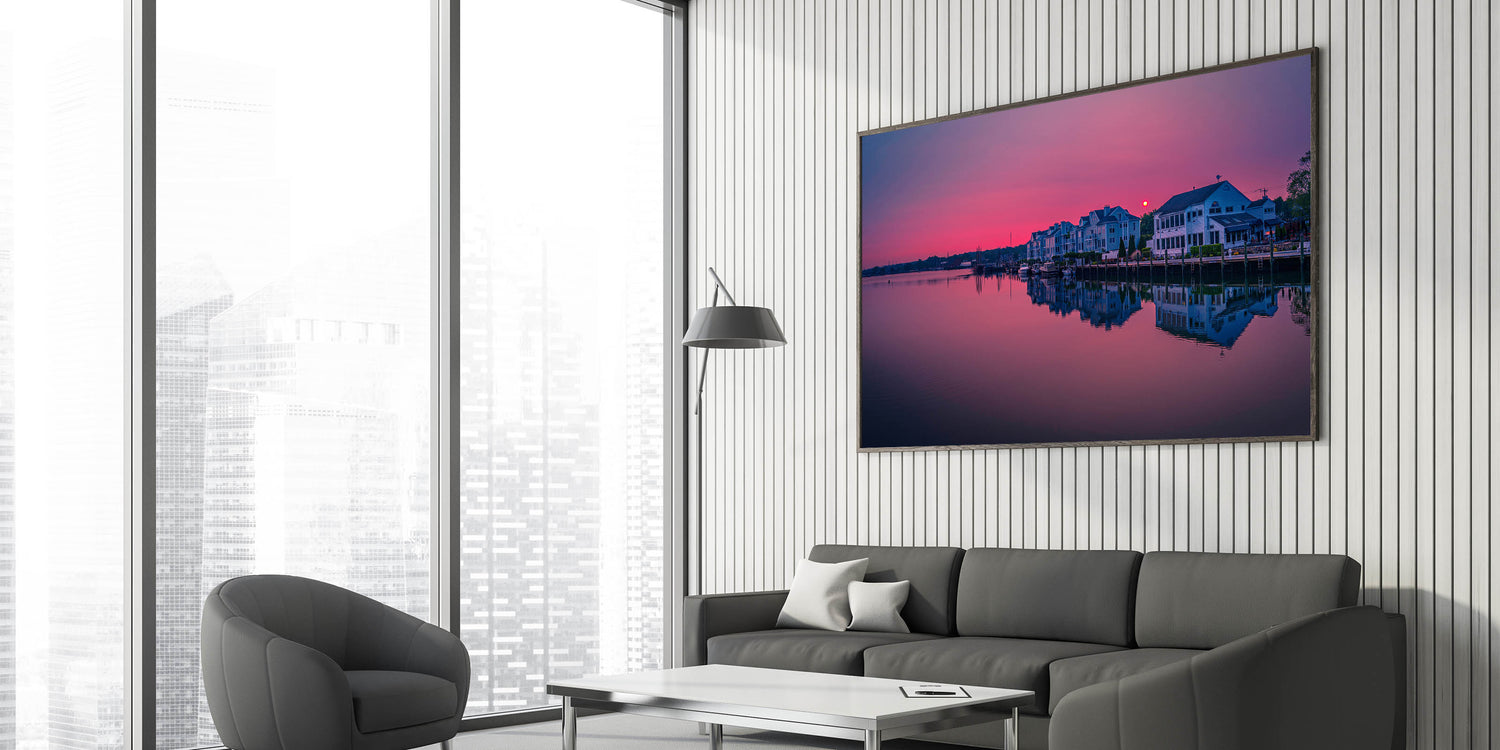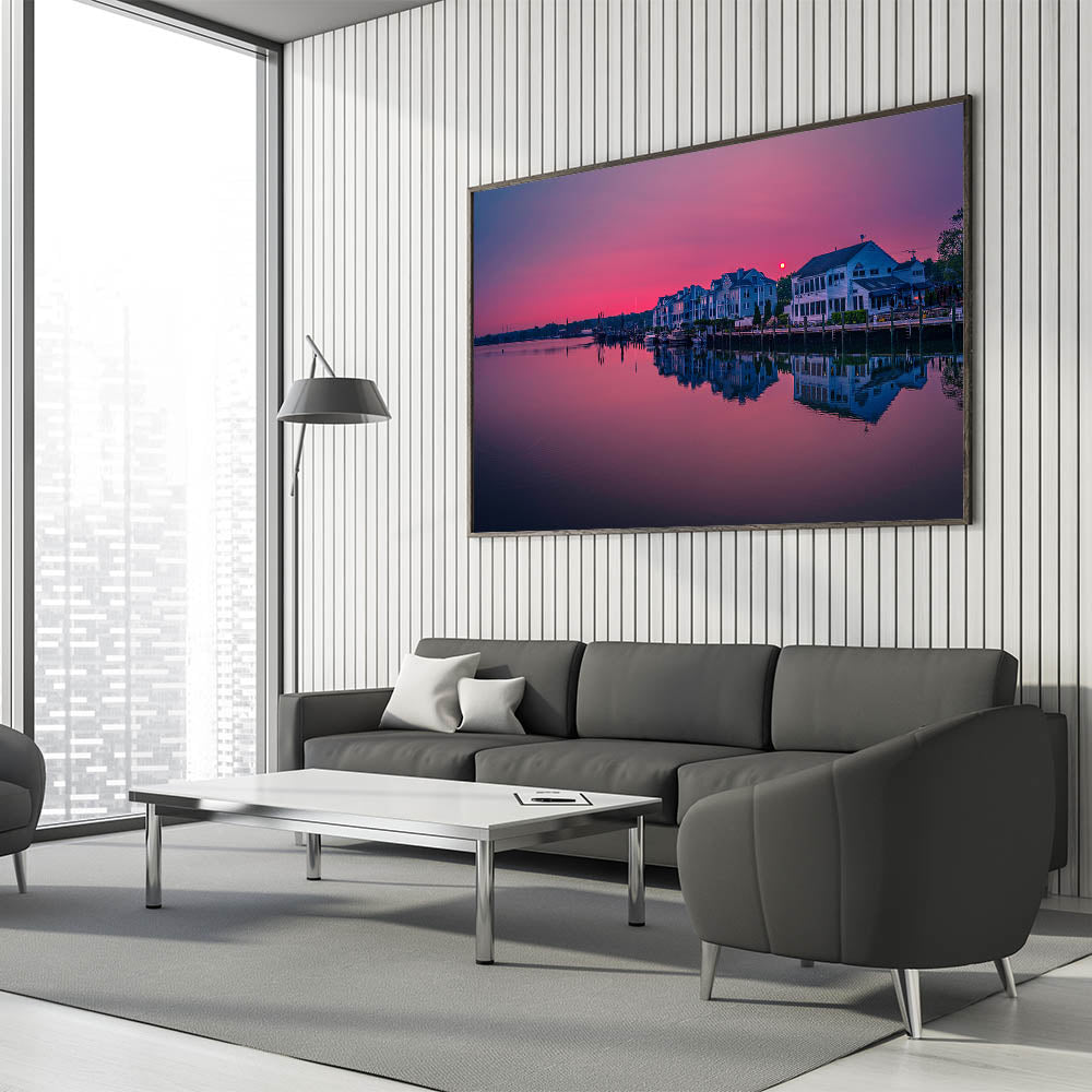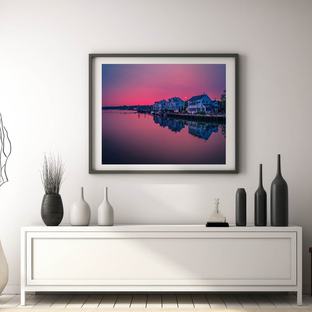 This stunning Connecticut wall art captures the beauty of a peaceful waterfront at sunset, with vibrant pink and purple hues reflected in the calm water. The houses along the shoreline and their perfect reflections add a sense of balance and tranquility to this scenic view. The setting sun in the distance completes the scene, casting a soft glow over the entire landscape. This artwork is perfect for those who appreciate the calm and beauty of coastal living.